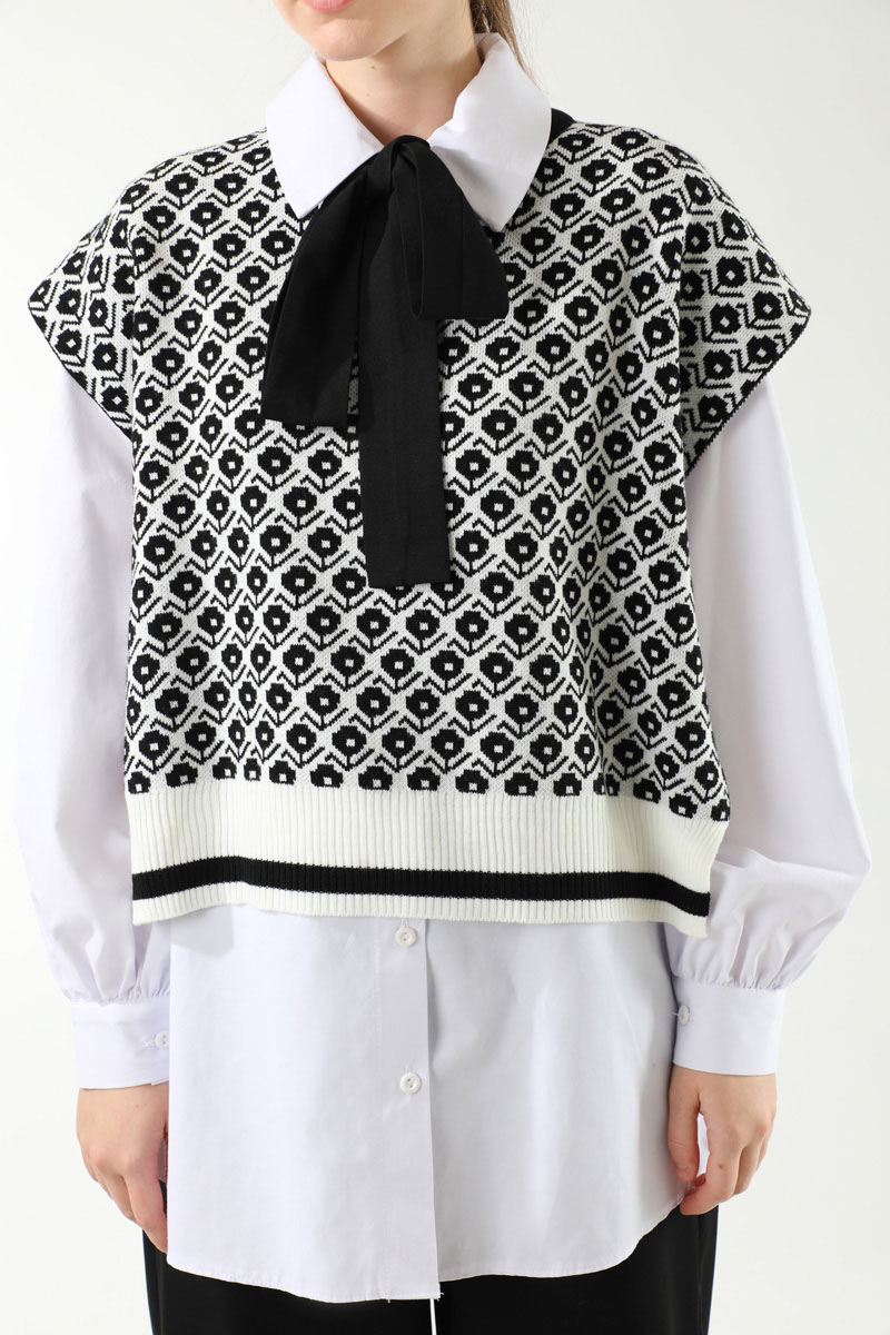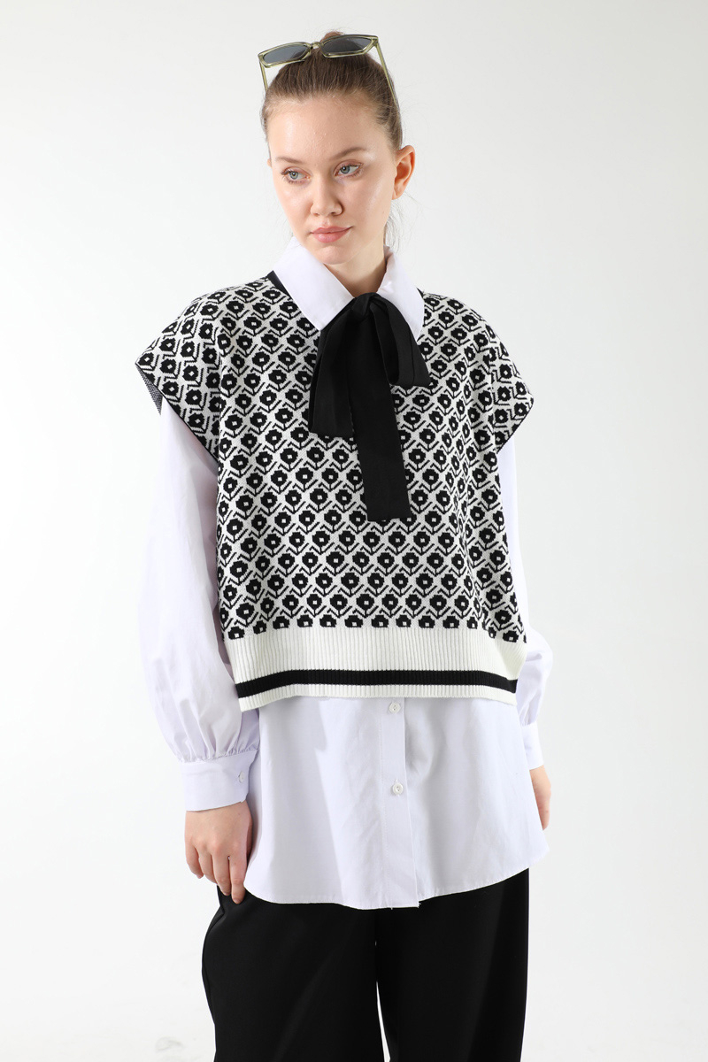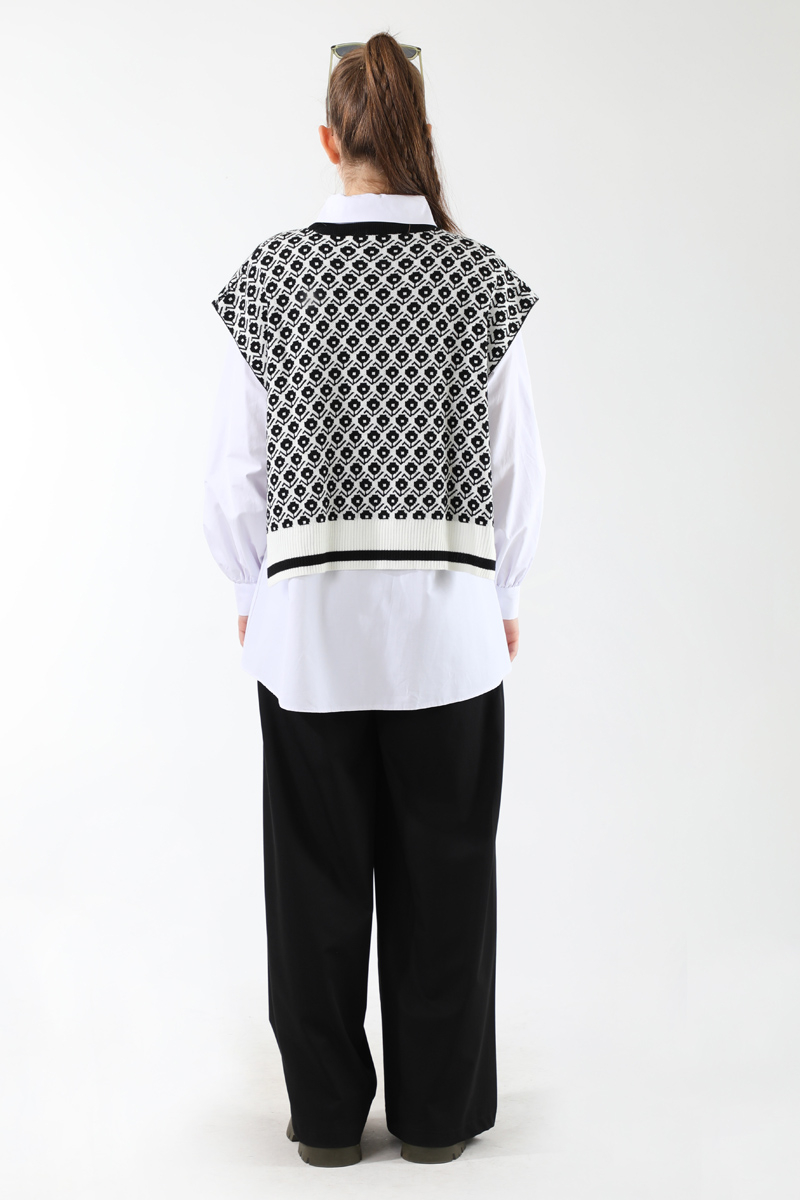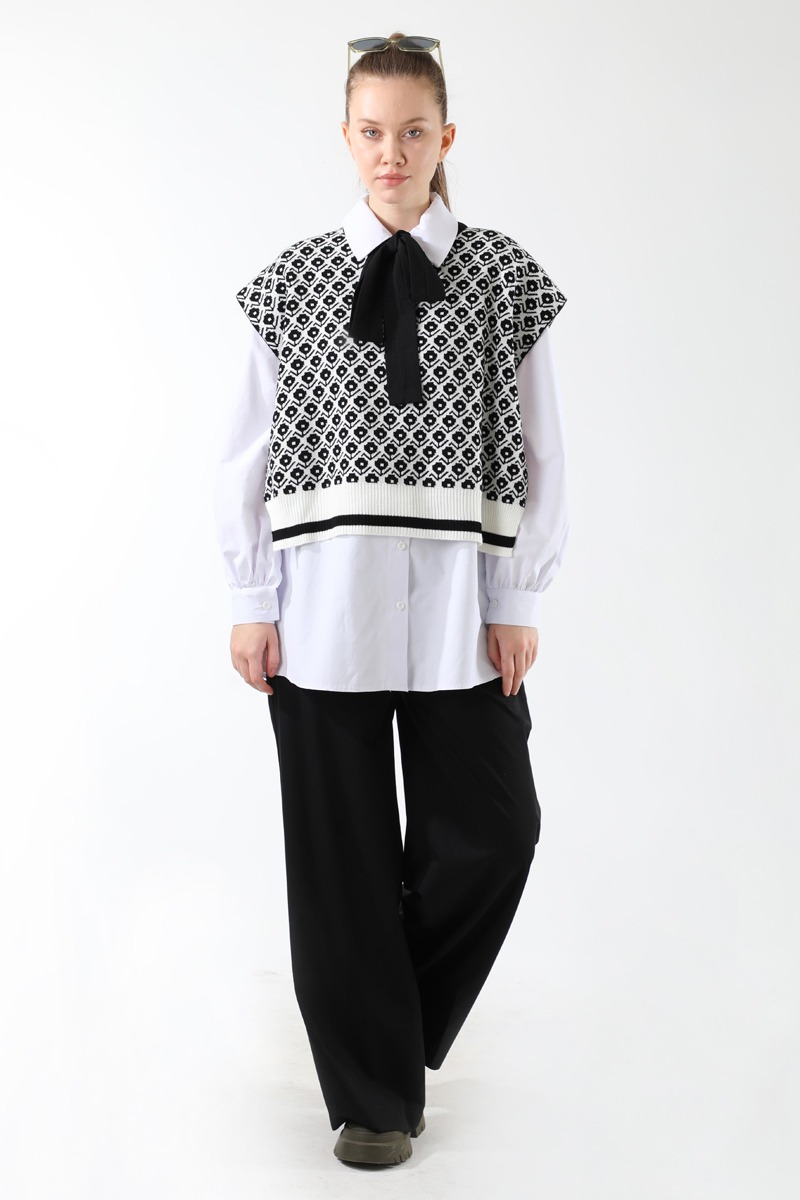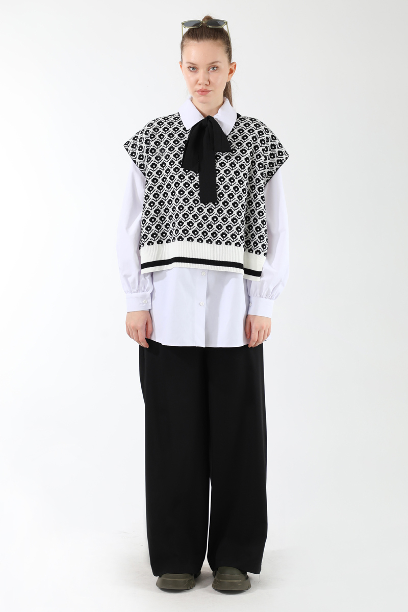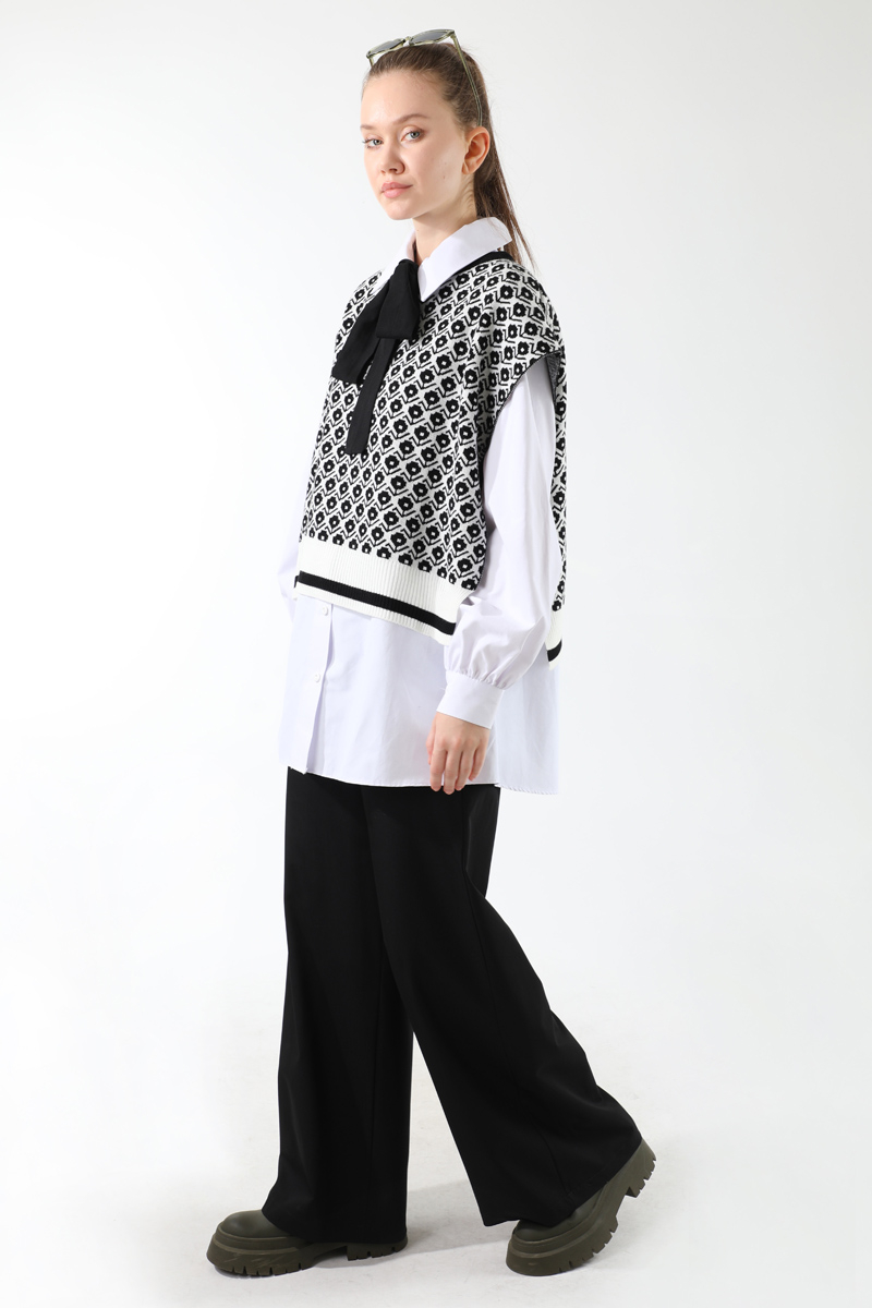 Triko Yelekli Tunik Takım Siyah. Triko yelek yandan bağlamalıdır. Gömlek düğmelidir. Gömlek manşeti büzgü detaylıdır. Pantolon beli lastiklidir, önden fermuarlıdır. Pantolon bol paçadır. Günlük kullanım ve özel günlerinizde tercih edebilirsiniz.