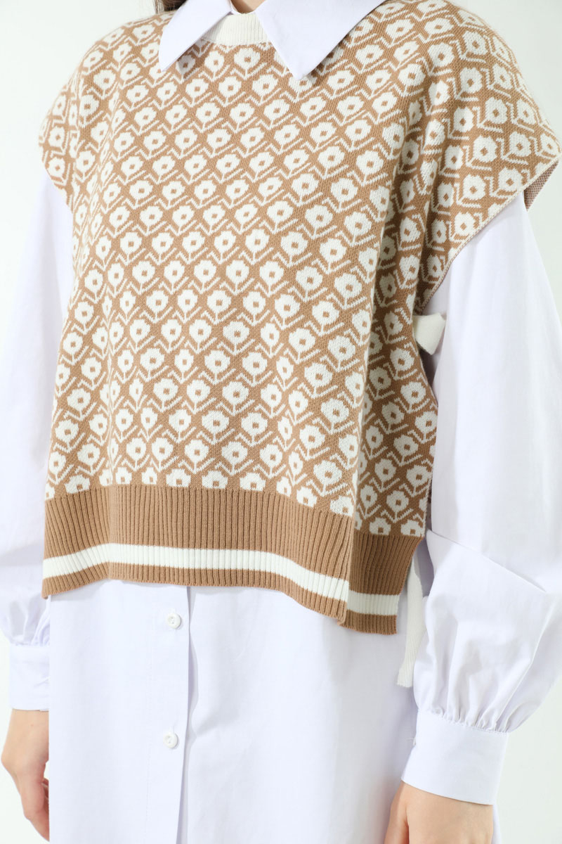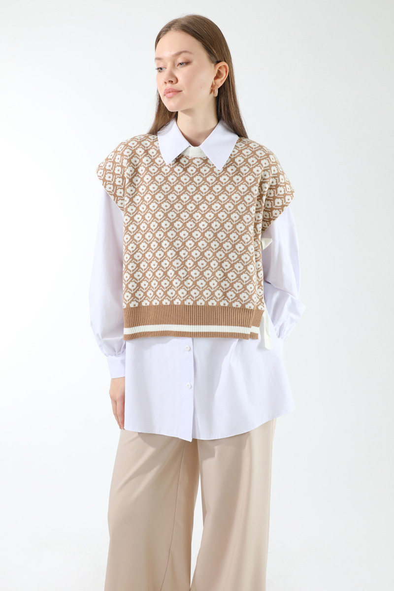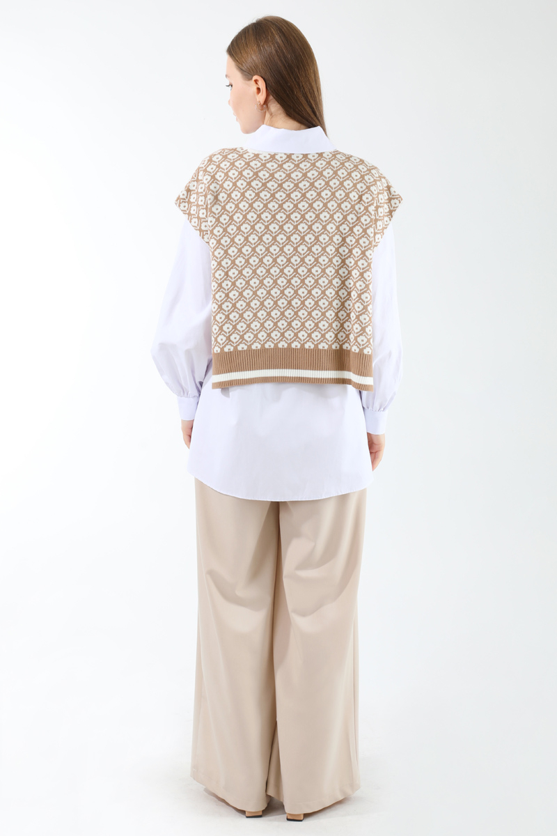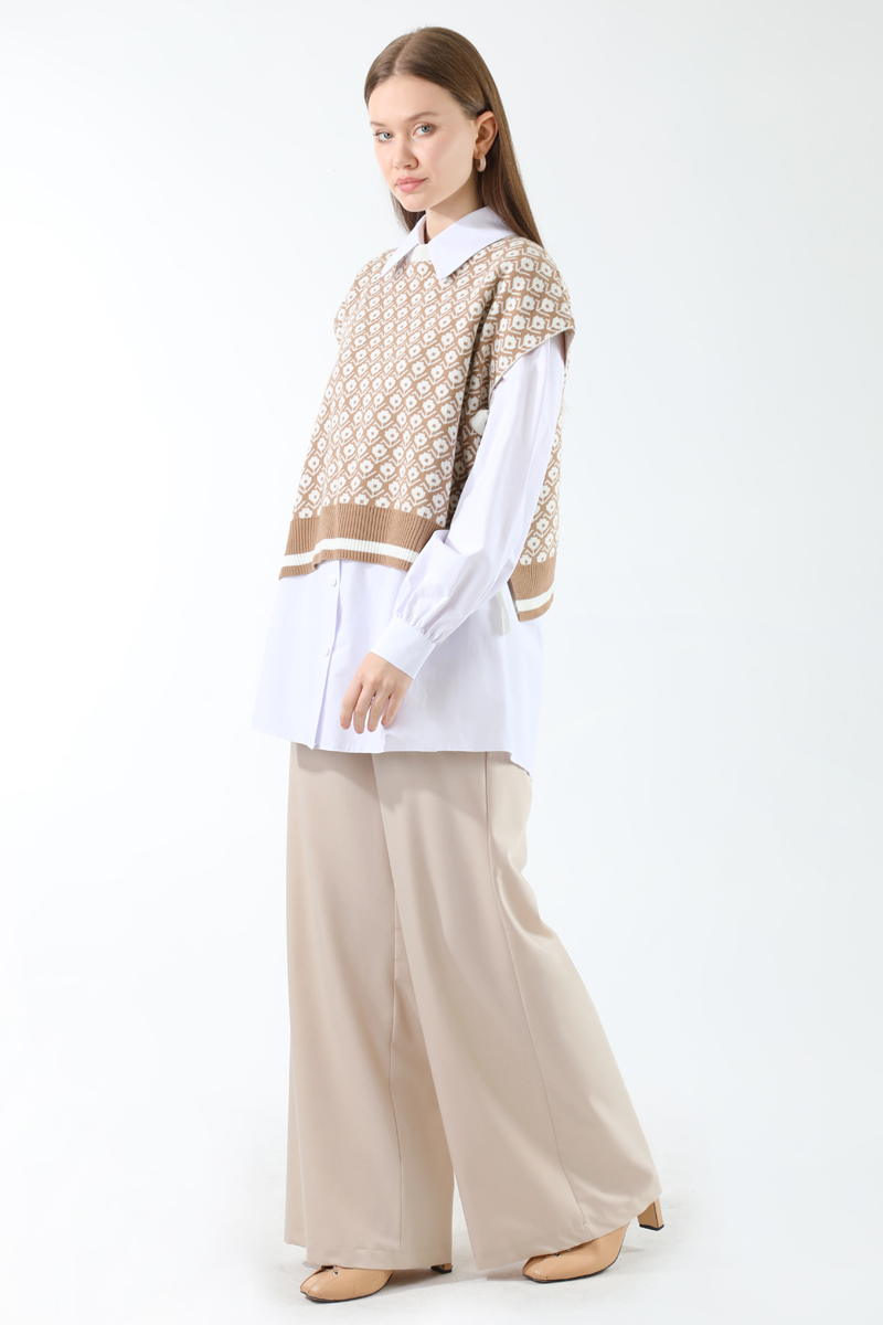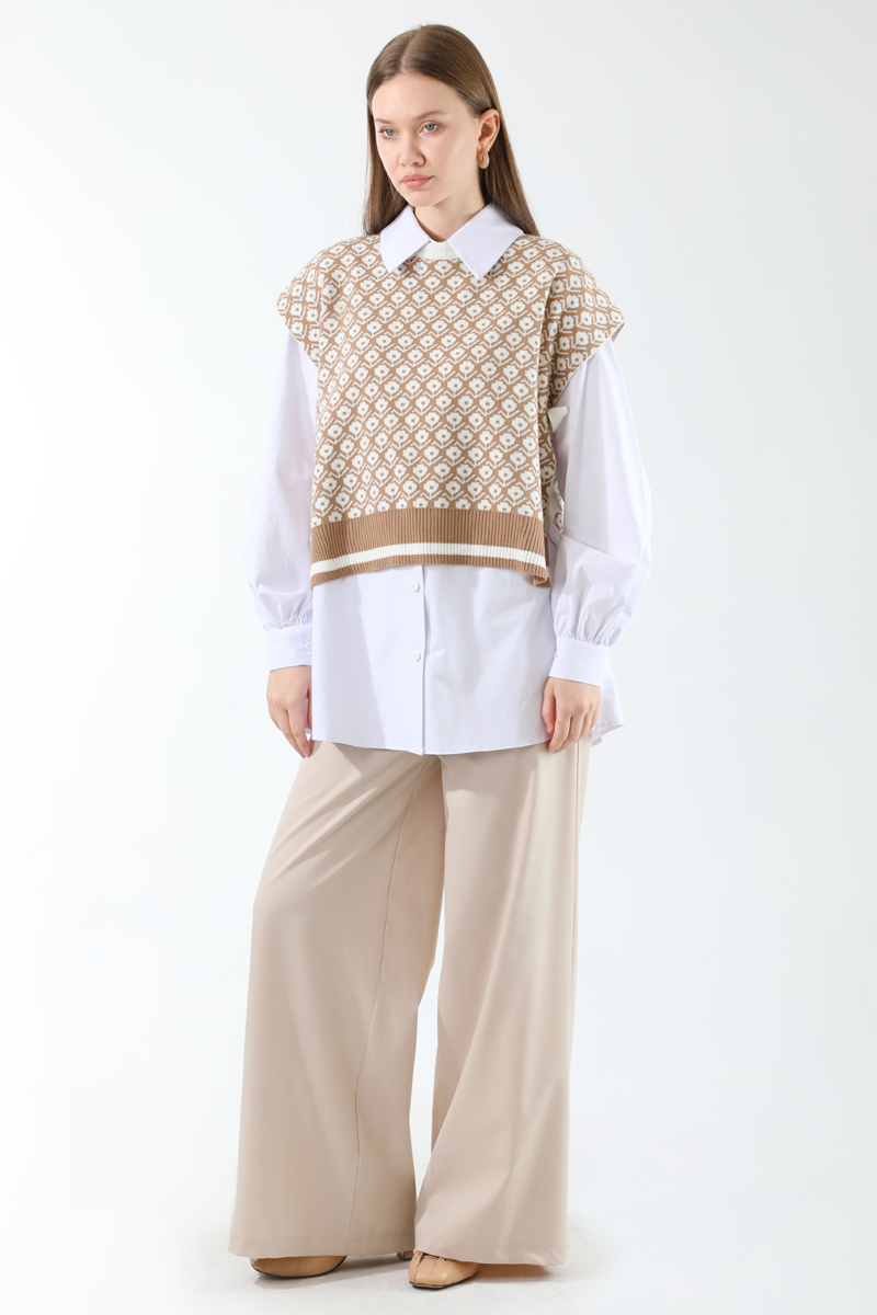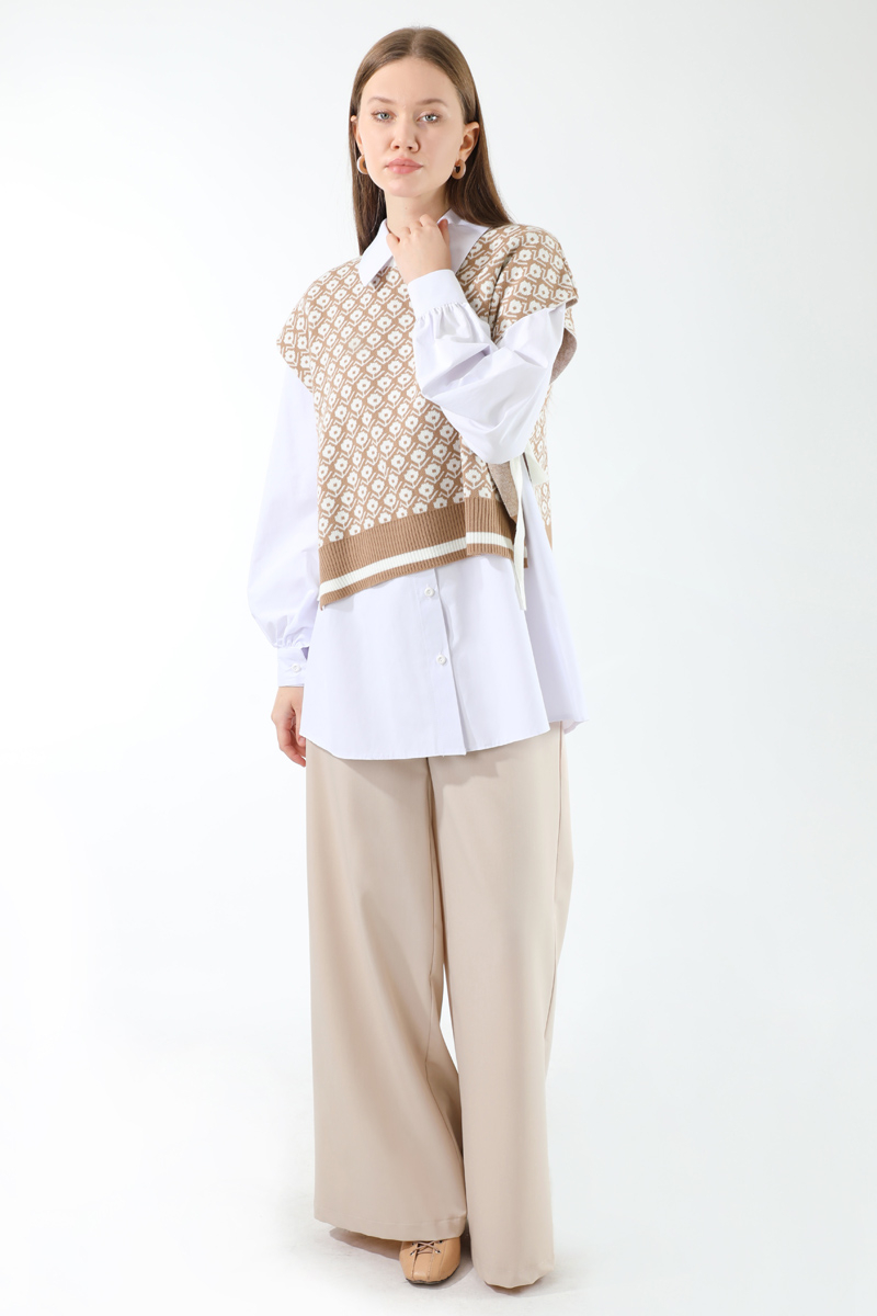Triko Yelekli Tunik Takım Taş. Triko yelek yandan bağlamalıdır. Gömlek düğmelidir. Gömlek manşeti büzgü detaylıdır. Pantolon beli lastiklidir, önden fermuarlıdır. Pantolon bol paçadır. Günlük kullanım ve özel günlerinizde tercih edebilirsiniz.