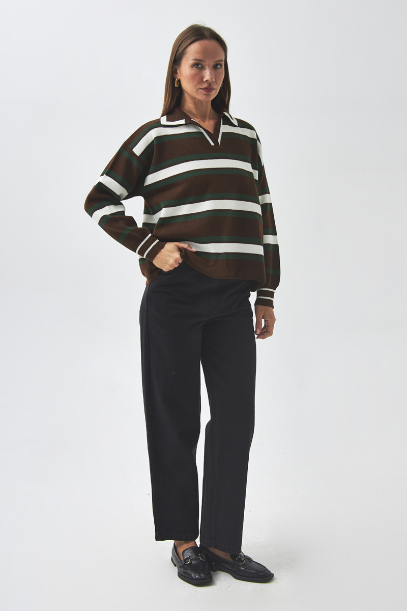 With its modern and dynamic design, this sweater brings an energetic touch to your everyday style. The polo collar and brown–baby blue striped pattern offer a subtle retro vibe, while the relaxed fit ensures all-day comfort. A versatile piece that can easily transition from office wear to casual outfits.