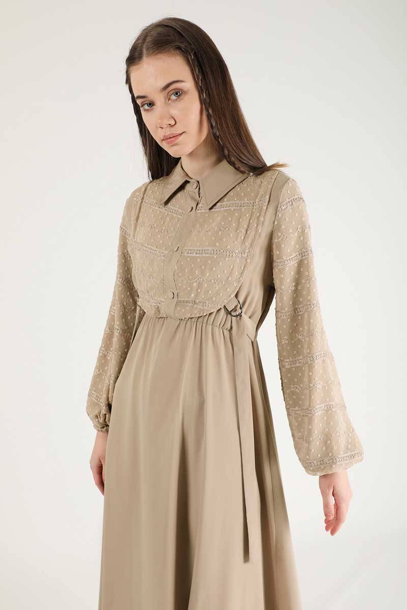 Tül Detaylı Elbise Bej. Beli lastiklidir. Kuşaklıdır ve Yandan aksesuarlıdır. Yakalıdır. Balon Kolludur. Manşeti lastiklidir. Astarsızdır. Normal kalıptır. Günlük kullanım ve Özel günlerinizde tercih edebilirsiniz.