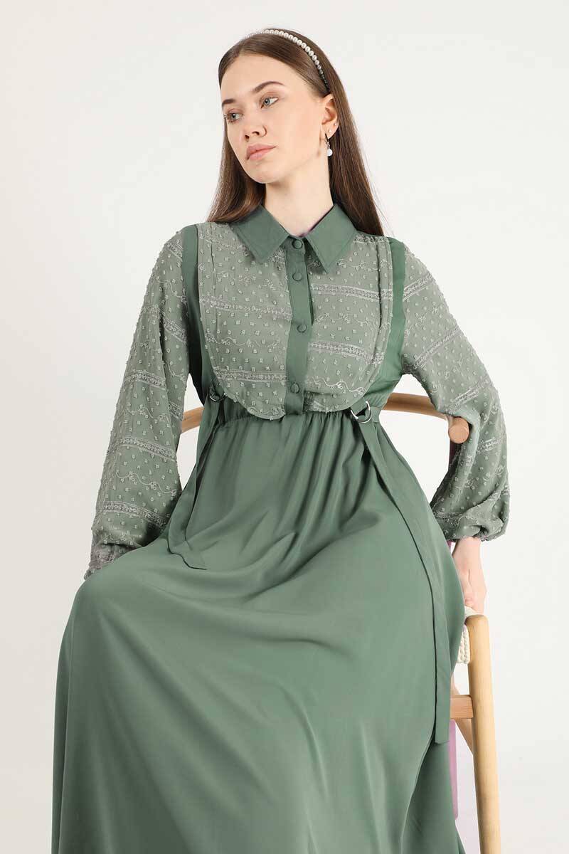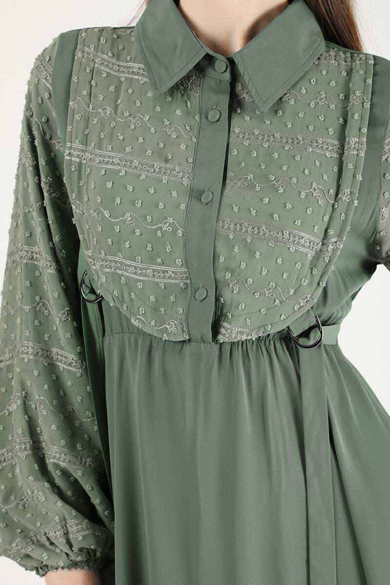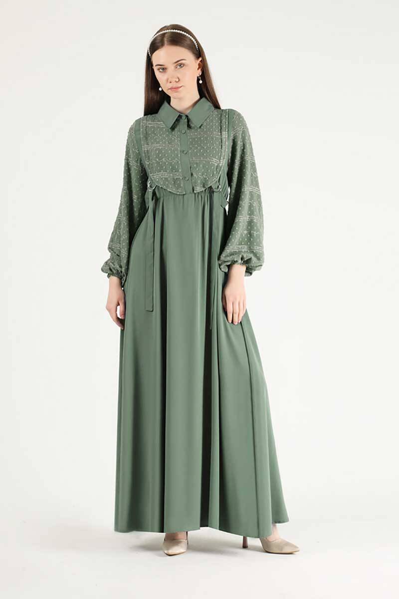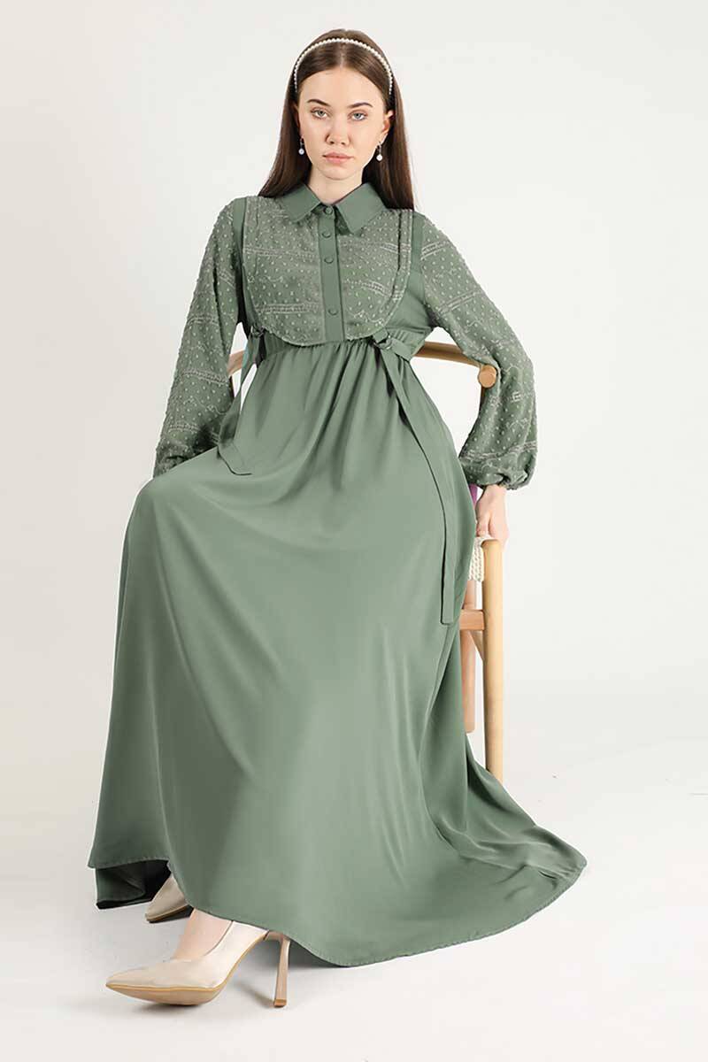 Tulle Detailed Dress Khaki. The waist is elastic. It is belted and has side accessories. It has a collar. Balloon Sleeves. The cuff is elastic. It is unlined. It's a normal pattern. You can choose it for your daily use and special days.