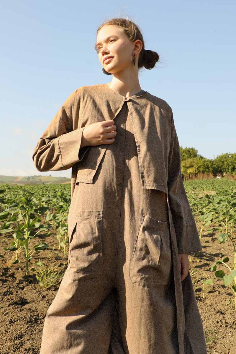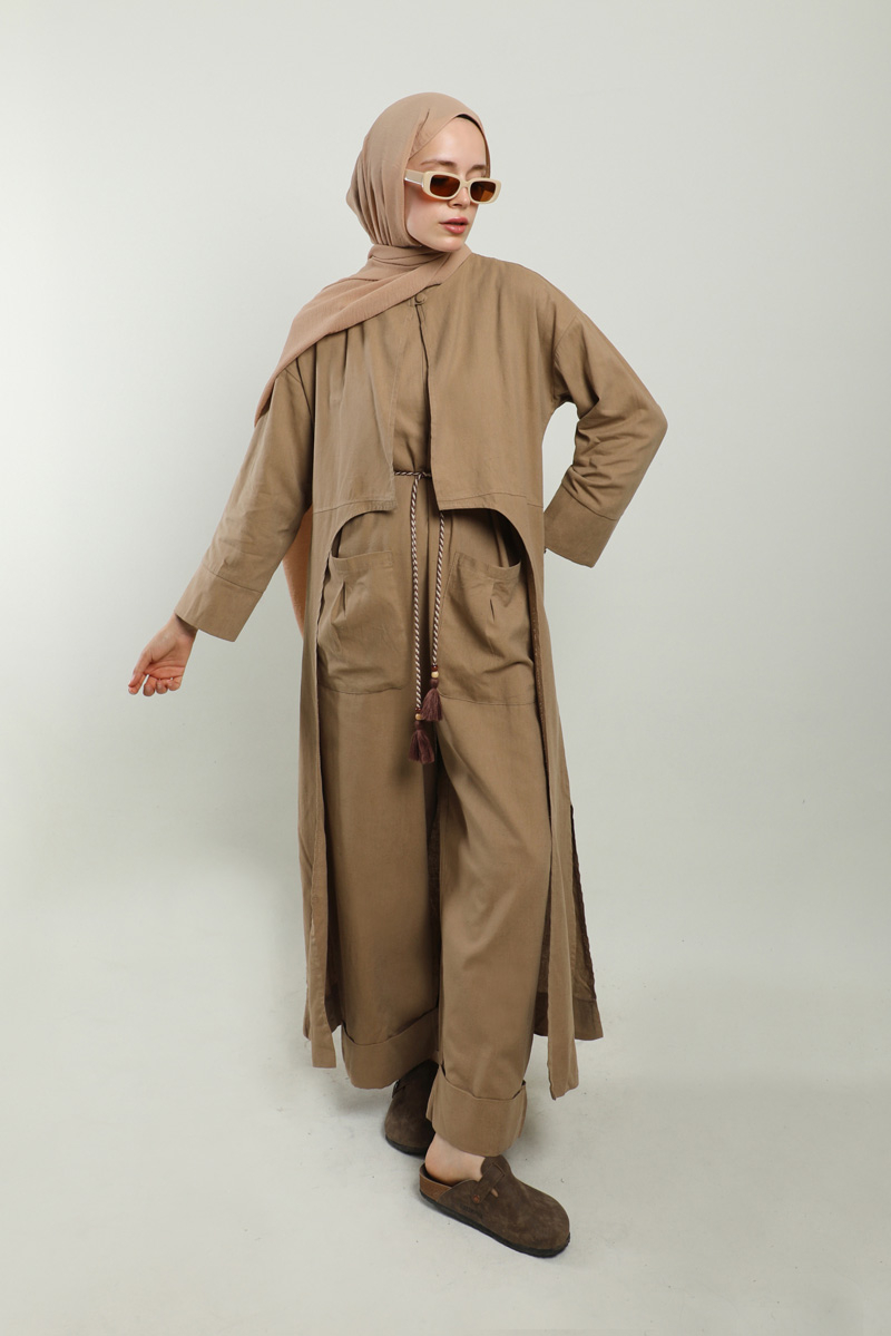 Tulumlu Abaya Takım Camel. Abaya yakadan tek düğmelidir, yandan yırtmaçlıdır, önden oval şekilde açılımlı, kalın manşetlidir, bisiklet yakalıdır. İç Tulum sıfır kolludur, bisiklet yakalıdır, önden fermuarlıdır, torba ceplidir, bol paçadır, paça kısmı katlamalıdır, ağ kısmı düşüktür, astarsızdır, ürün kuşaksızdır, kuşak görselde aksesuar olarak kullanılmıştır.