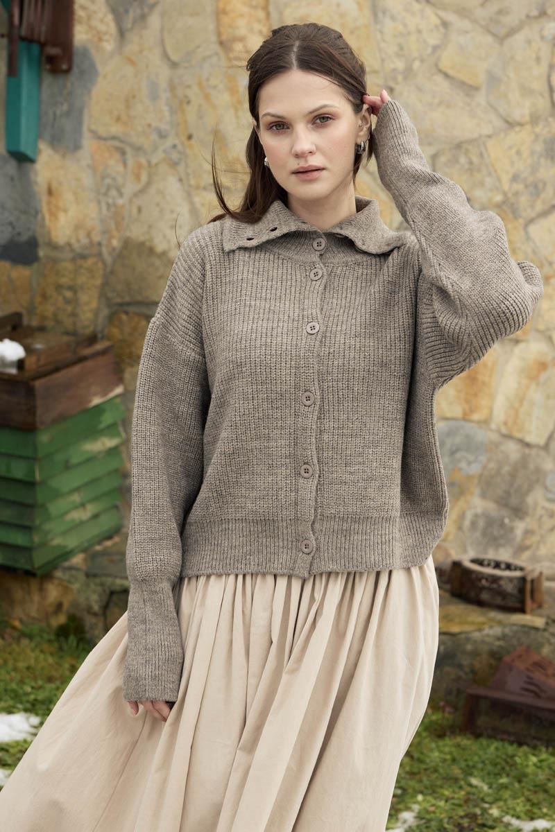 Turtleneck Cardigan Mink is one of the essential pieces for transitional seasons and cool days with its warm texture and clean design. Its knitted structure provides a soft feel, while the turtleneck form gives the piece a classic and refined appearance. Thanks to its front button closure, it can be comfortably worn on its own or in layered combinations. Suitable for a wide range of styling, from everyday city looks to office wear, this cardigan brings together comfort and timeless elegance.
