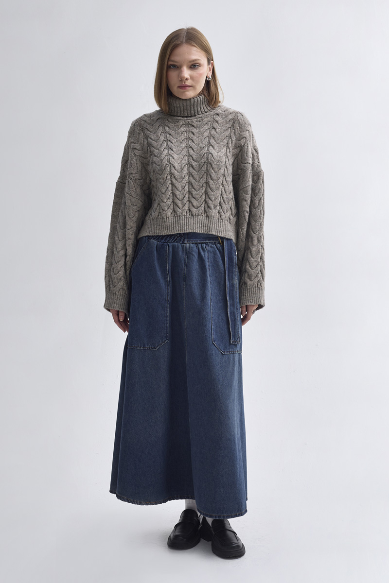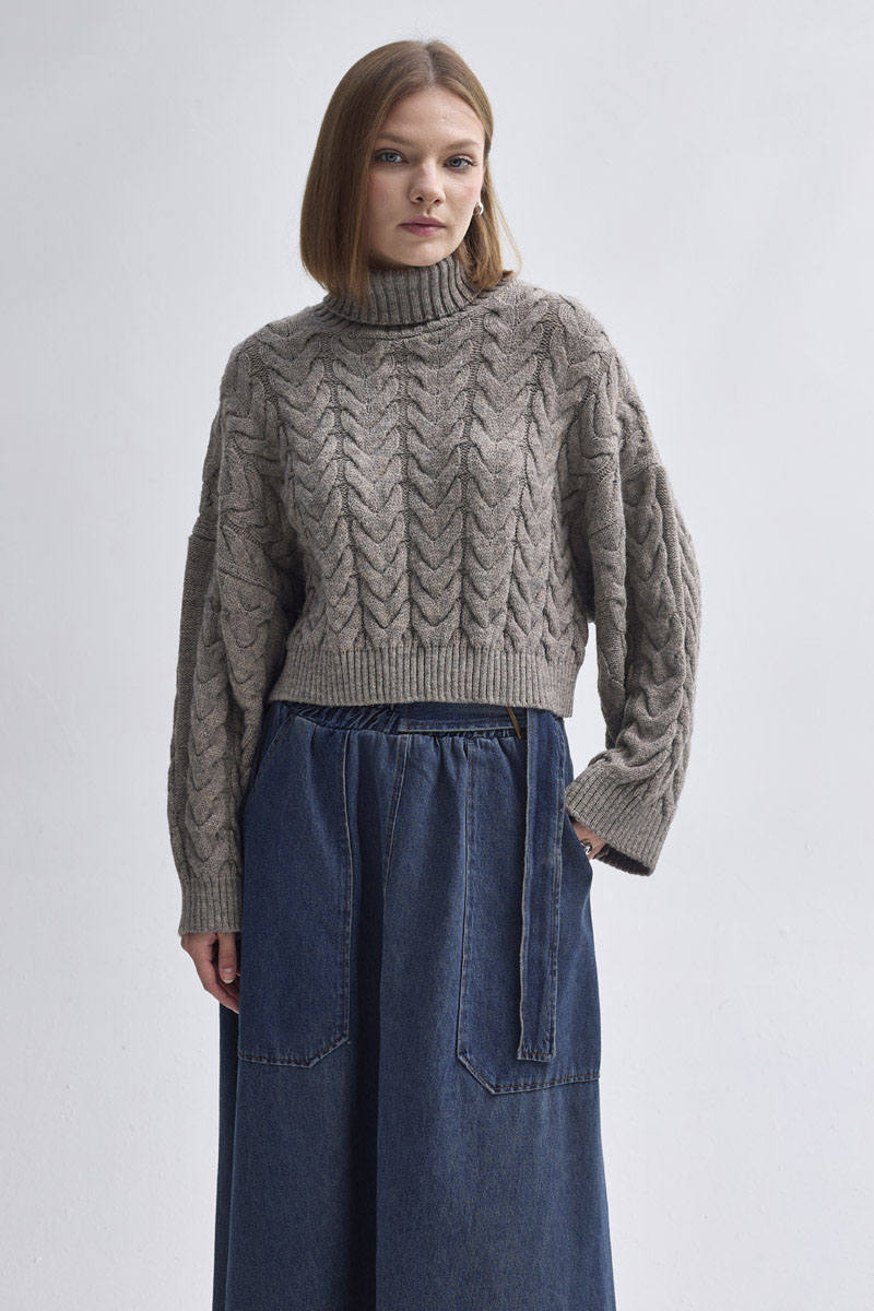 With its modern cut and relaxed style, this crop sweater adds a chic touch to everyday outfits. The thick knit texture keeps you warm on cold days, while the turtleneck design offers both comfort and elegance. Thanks to its short length, it pairs perfectly with high-waisted trousers and skirts for a balanced and stylish look.
