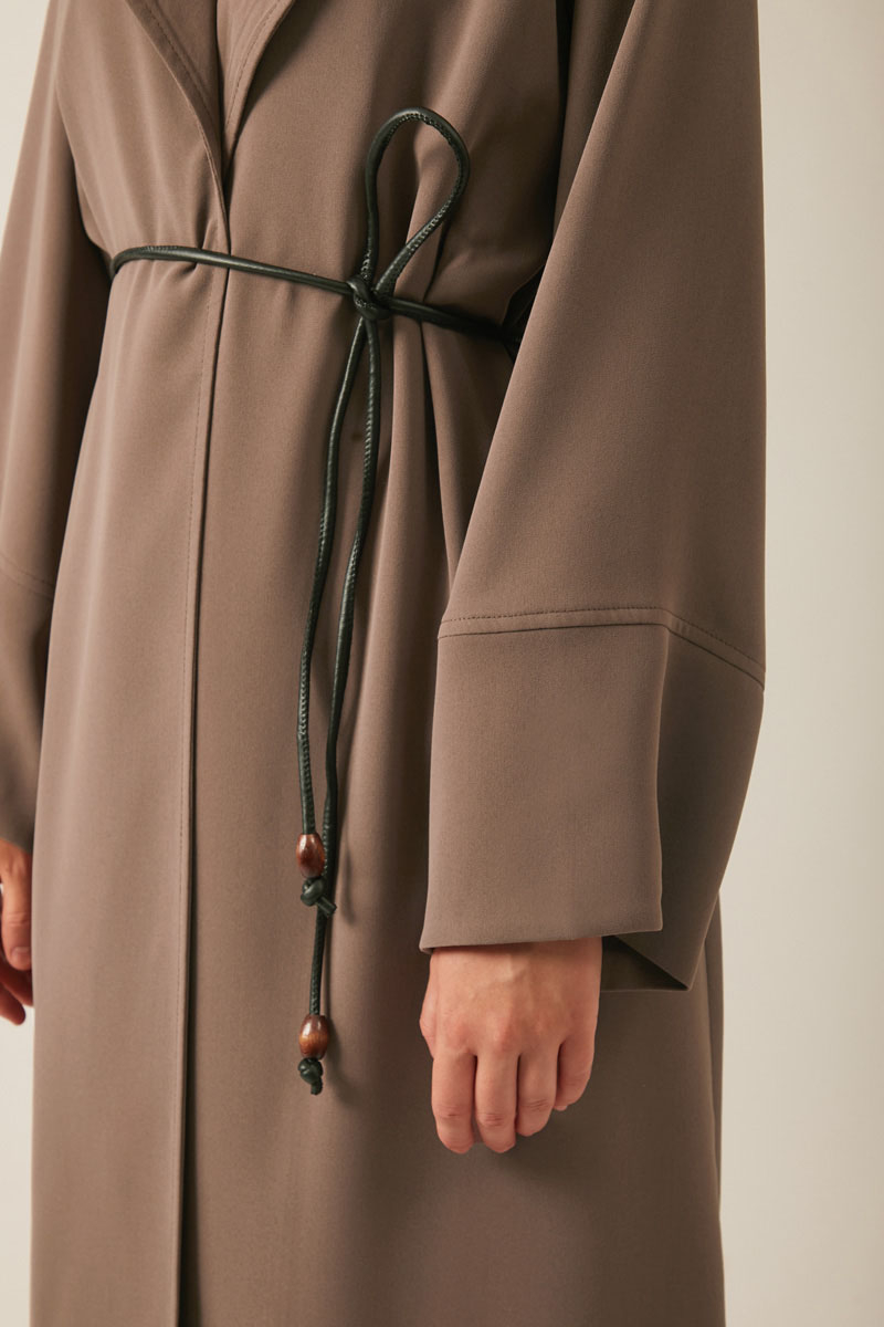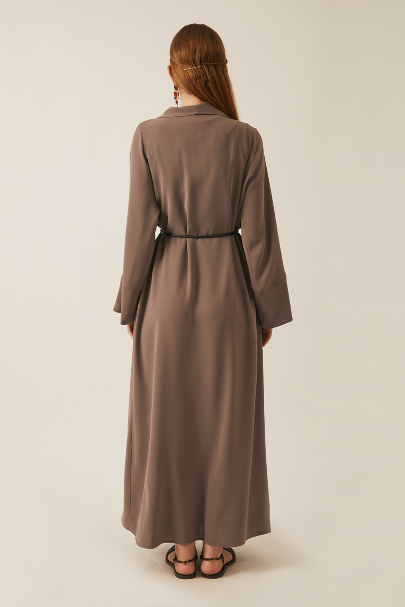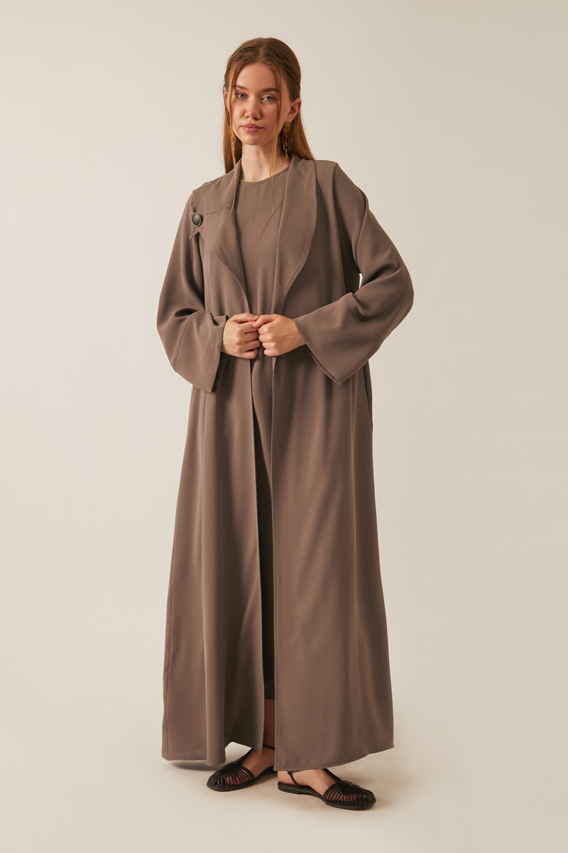 Umay Abaya Takım Koyu Vizon. Abaya tek yakası asimetrik düğme detaylıdır, yandan ceplidir, deri kemerlidir, double manşetlidir, İçliği bisiklet yakadır, arkadan gizli fermuarlıdır, düz kesimdir. Günlük kullanım ve özel günlerinizde tercih edebilirsiniz.