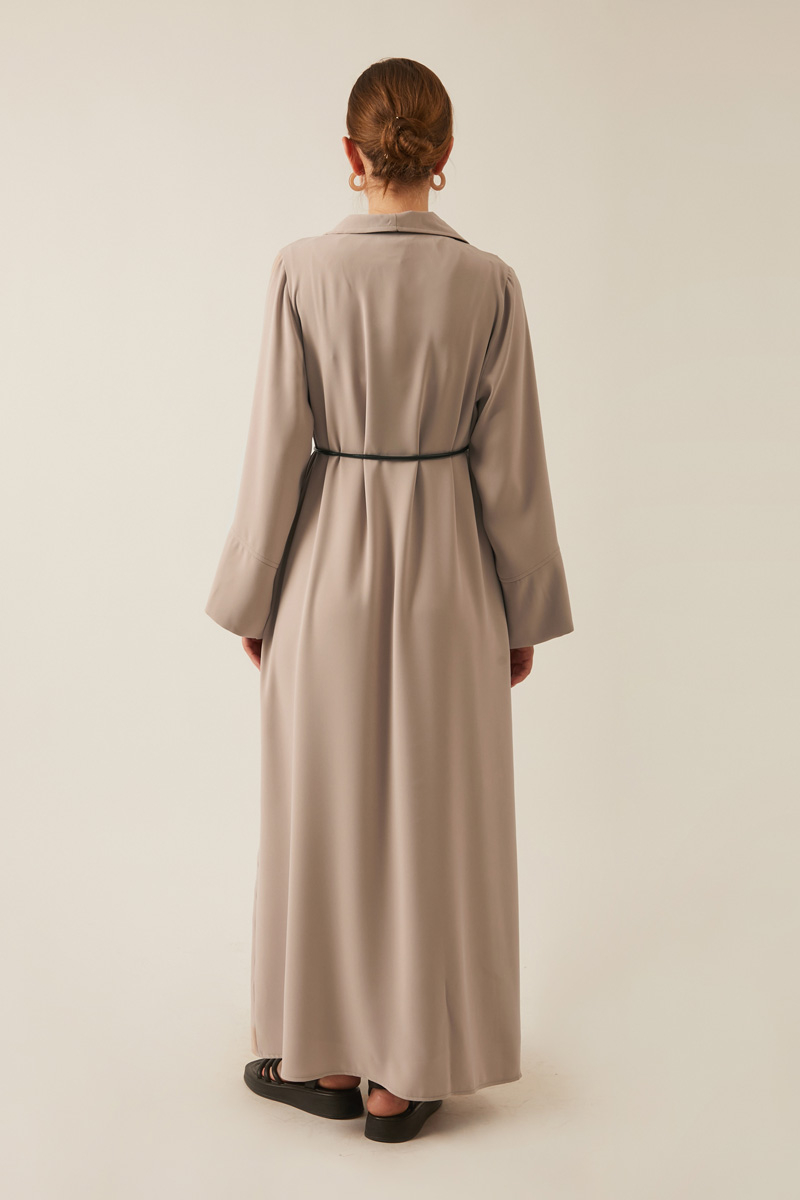 Umay Abaya Takım Taş. Abaya tek yakası asimetrik düğme detaylıdır, yandan ceplidir, deri kemerlidir, double manşetlidir, İçliği bisiklet yakadır, arkadan gizli fermuarlıdır, düz kesimdir. Günlük kullanım ve özel günlerinizde tercih edebilirsiniz.
