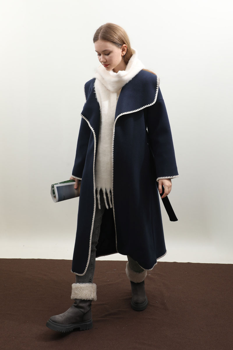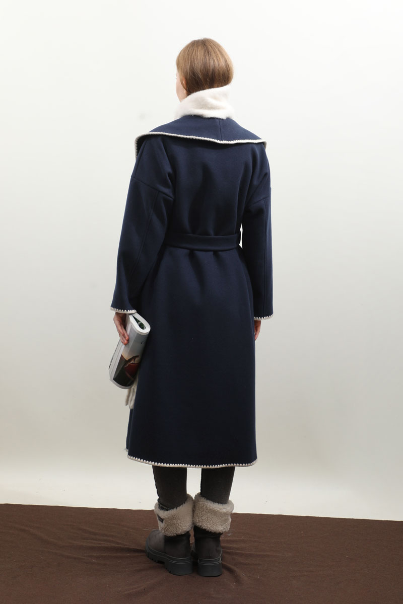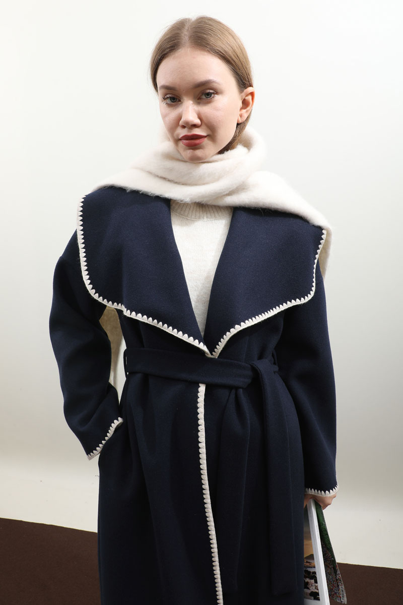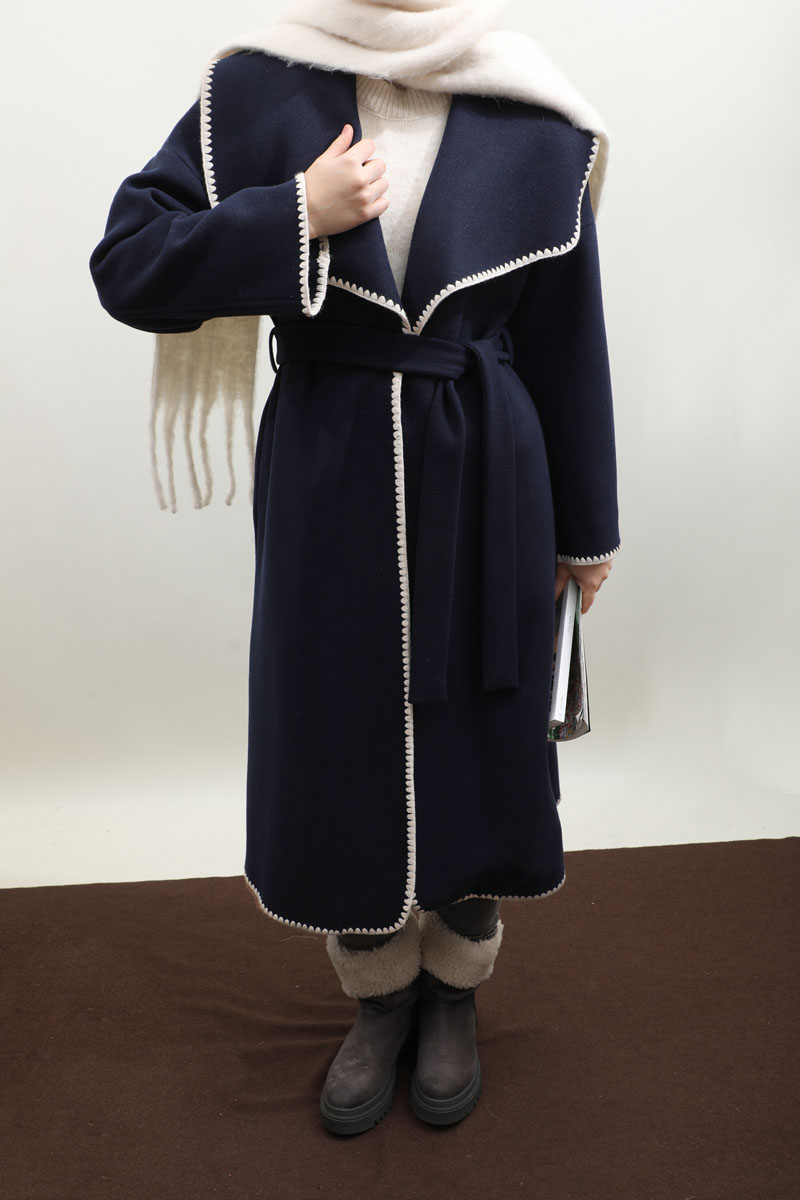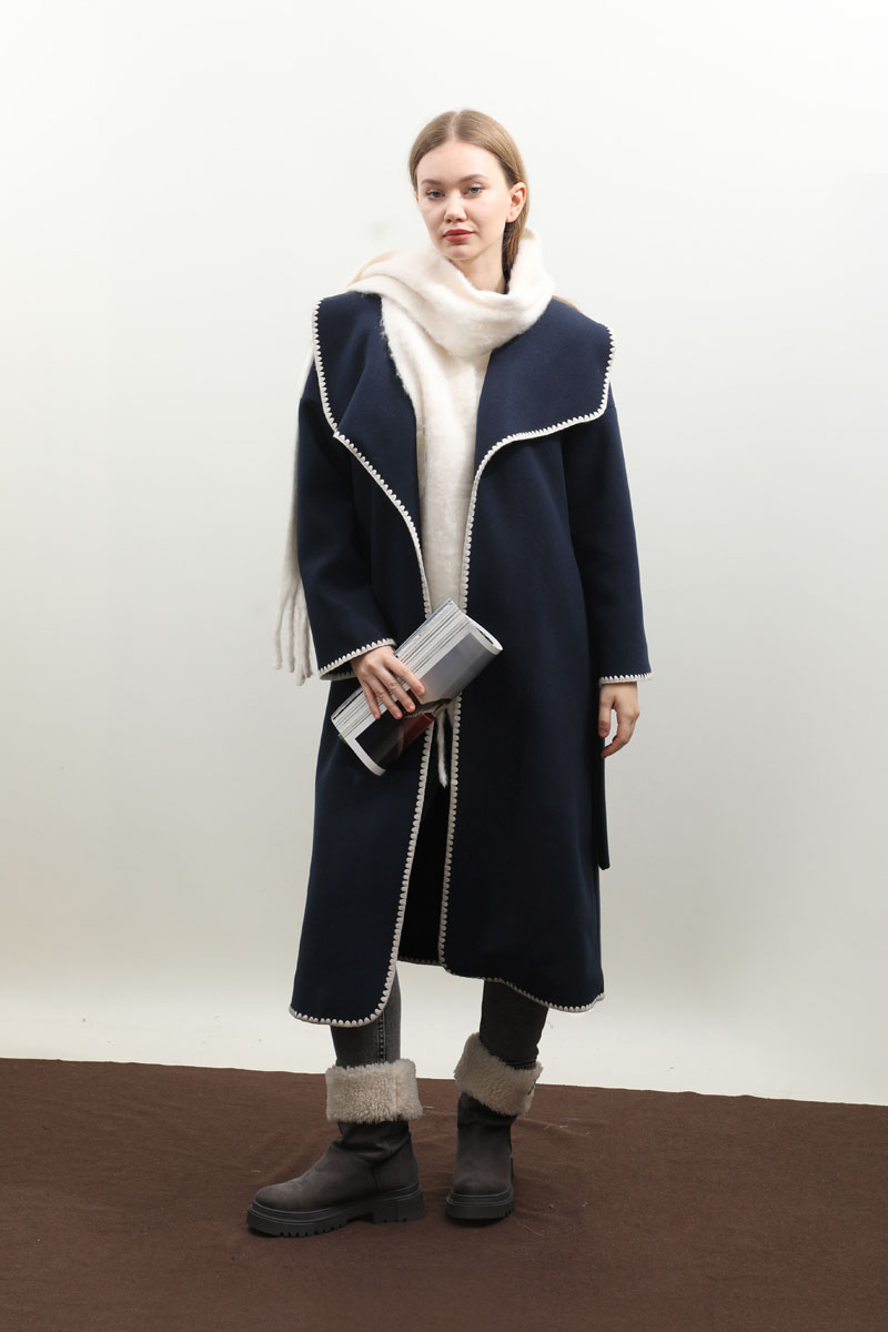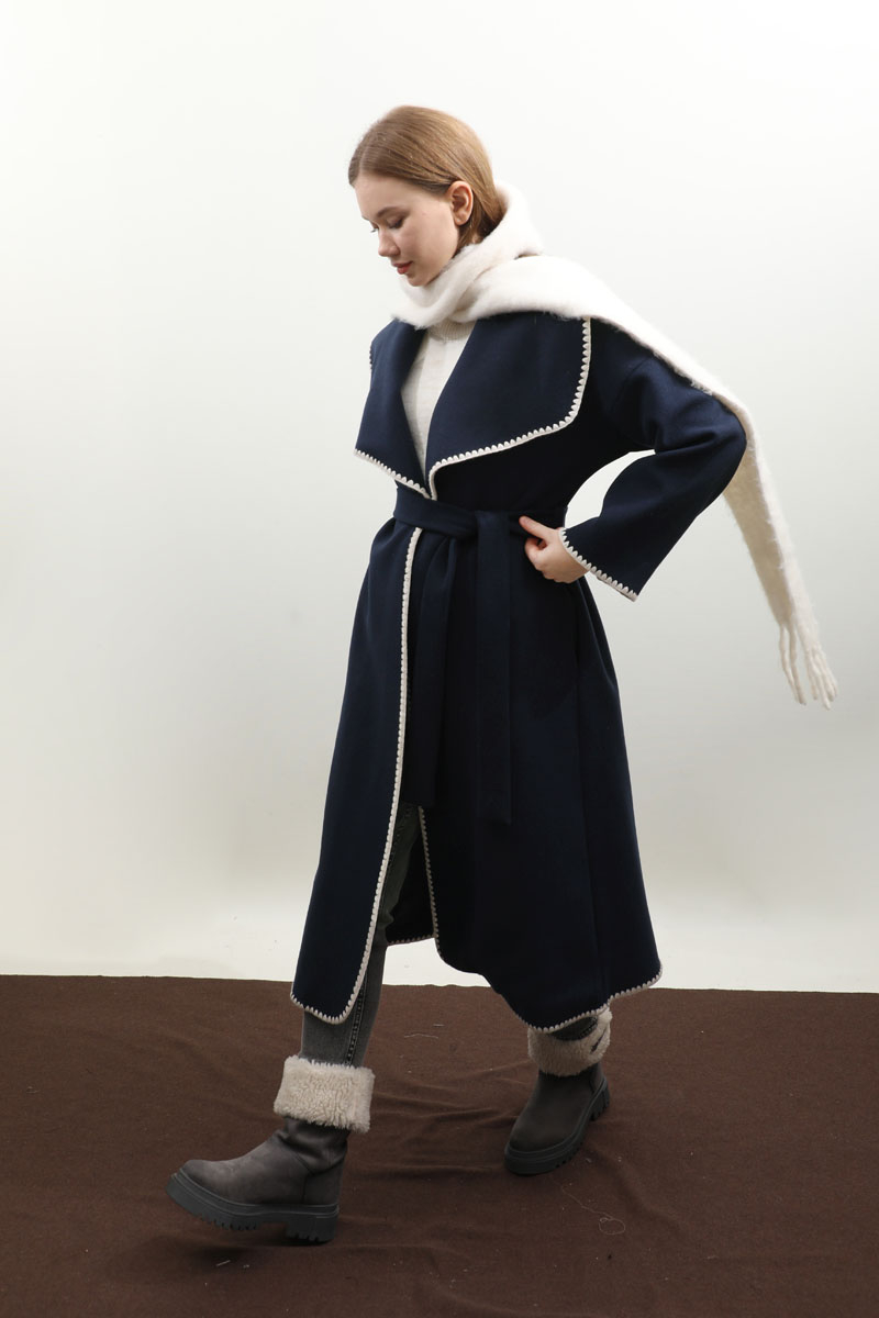 Uzun Çoban Kaban Lacivert. Geniş şal yaka, düşük omuzlu, karyuka detaylı, kuşaklı, düğmesiz, astarlı, ceplidir. Kış mevsimi için uygundur.