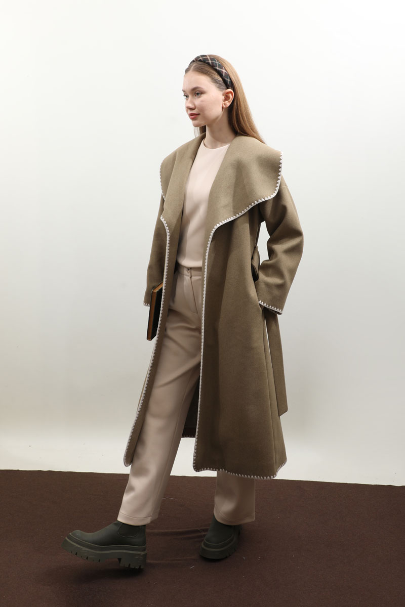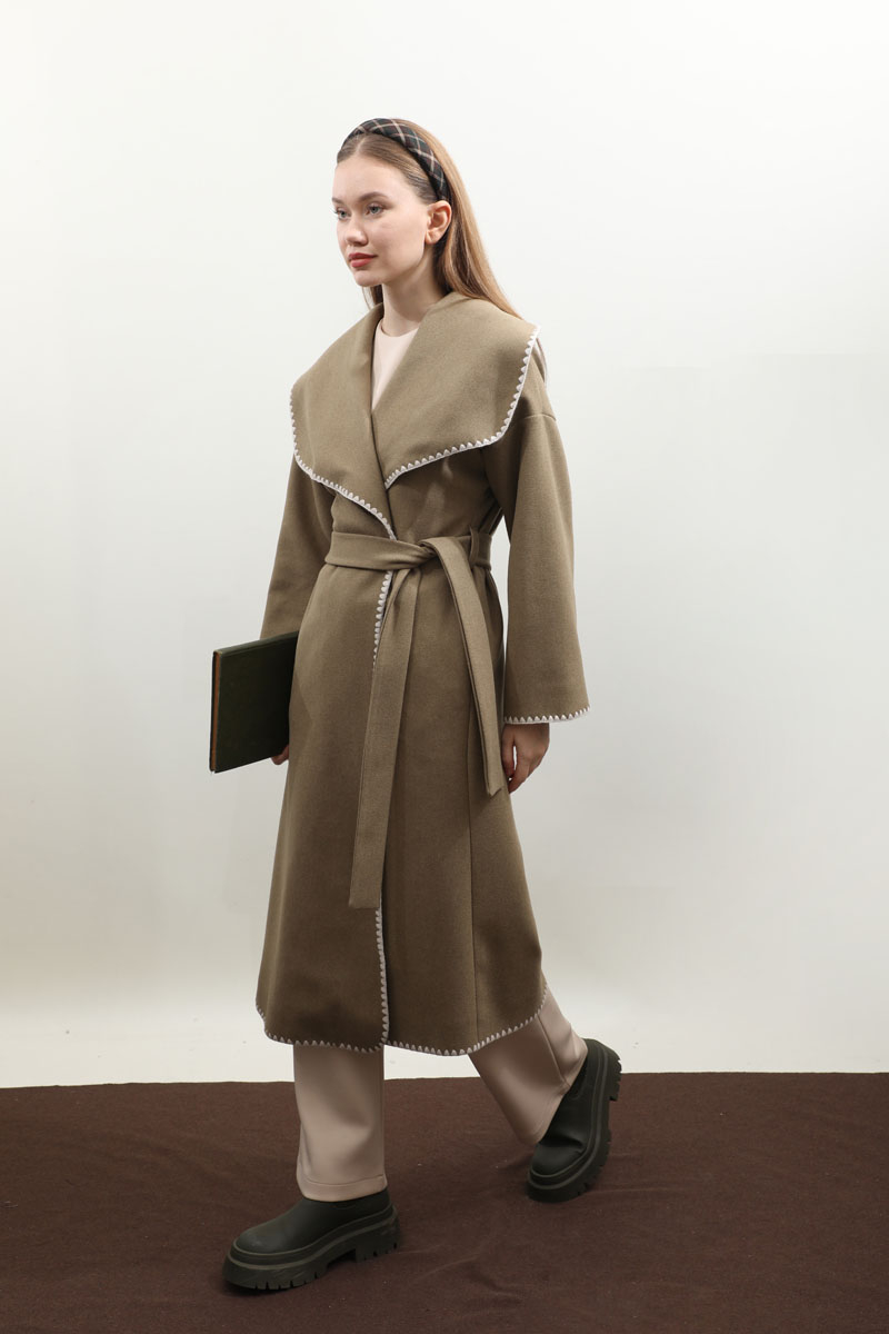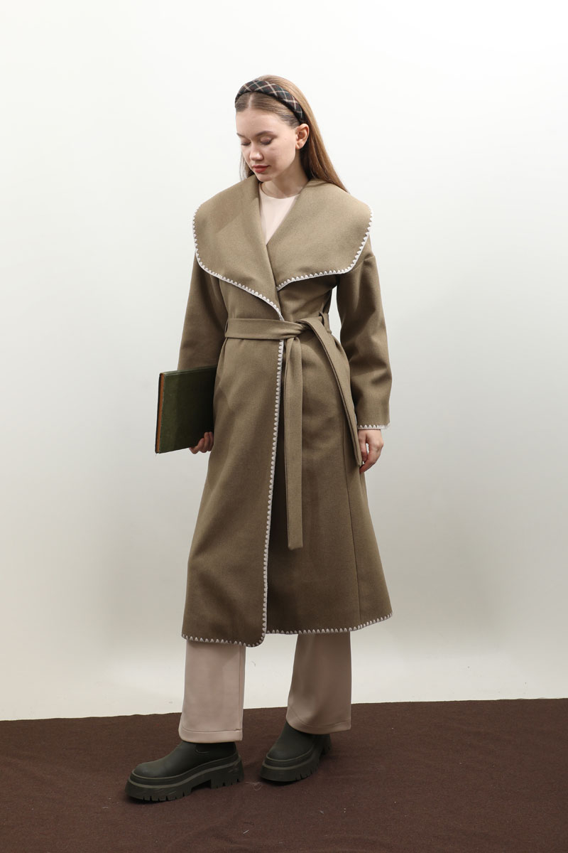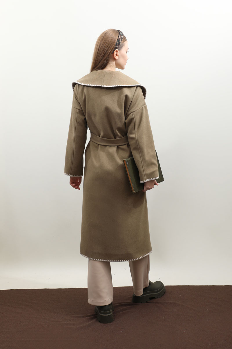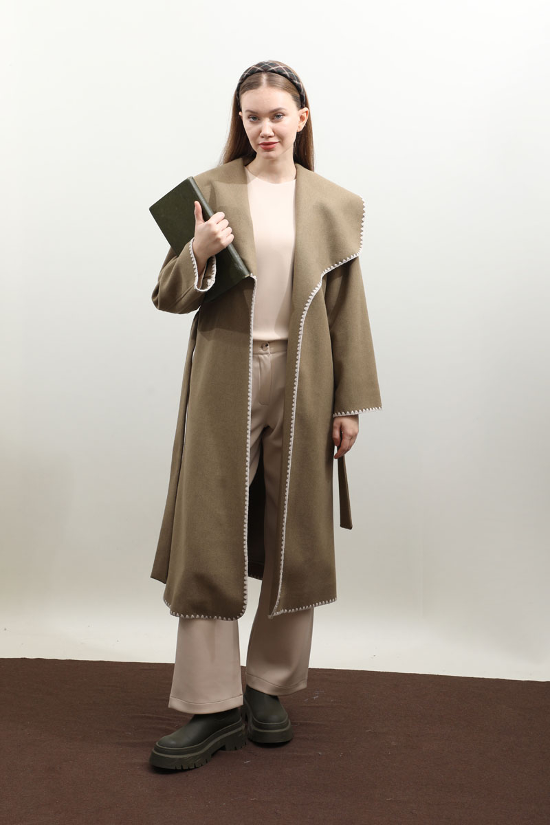Uzun Çoban Kaban Vizon. Geniş şal yaka, düşük omuzlu, karyuka detaylı, kuşaklı, düğmesiz, astarlı, ceplidir. Kış mevsimi için uygundur.