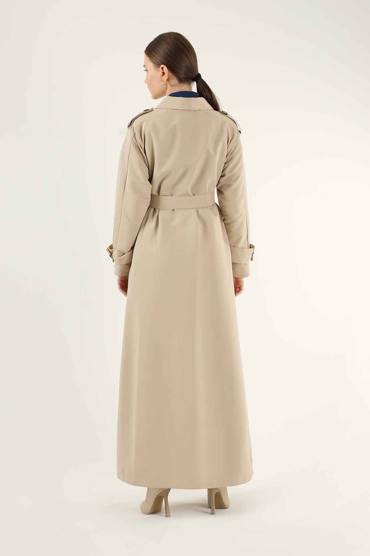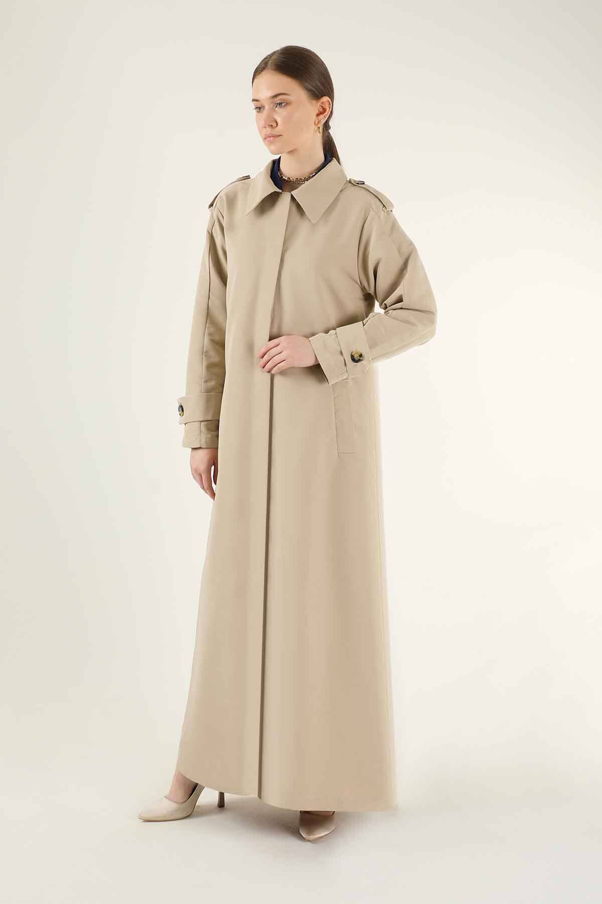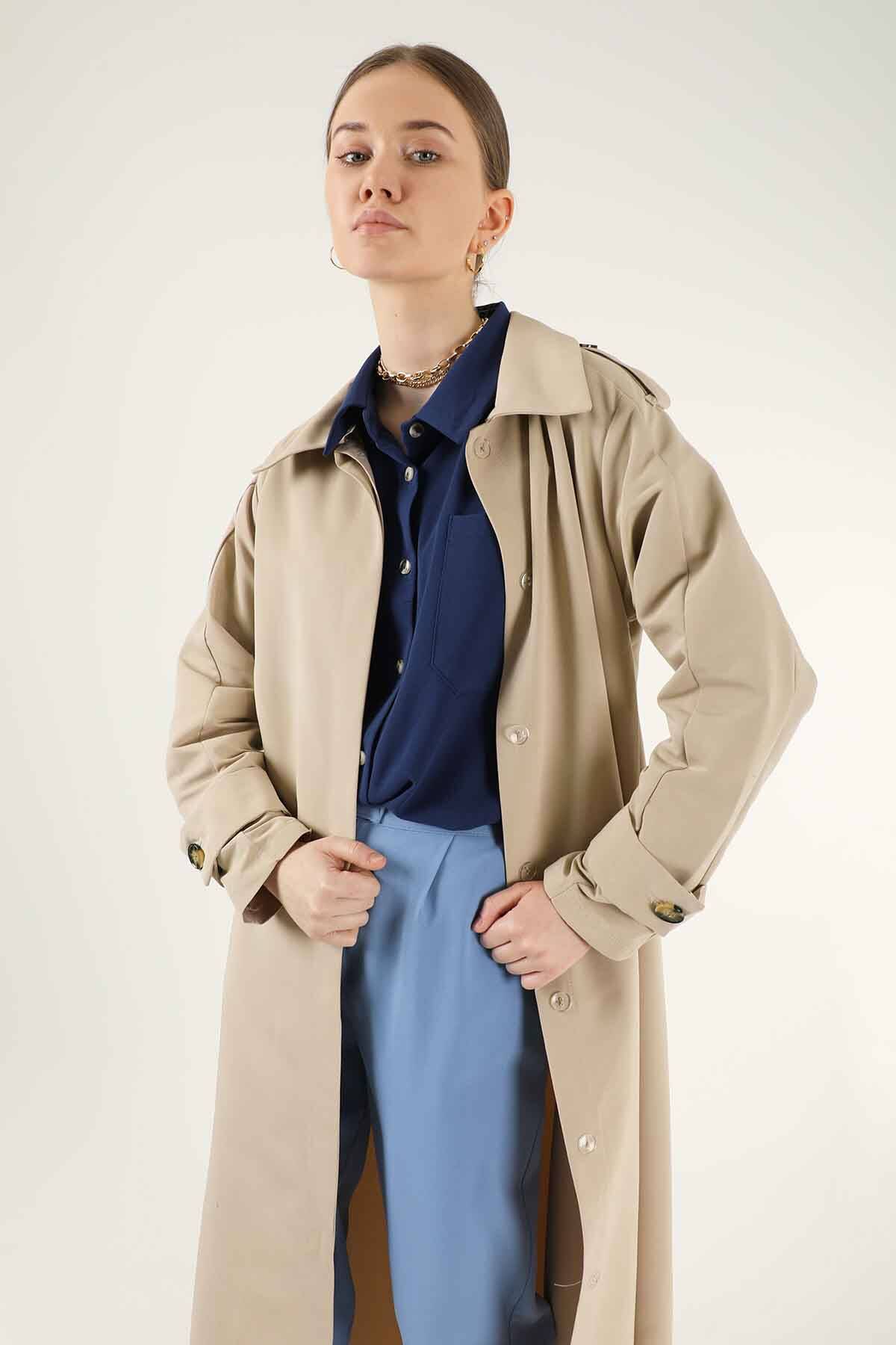 Uzun Gömlek Trençkot Taş. Gömlek yaka olup gizli düğmelidir. Omuzlarında apolet detayları mevcuttur. Trençkot belden kuşaklıdır ve cep detaylıdır. Ürün astarsızdır.