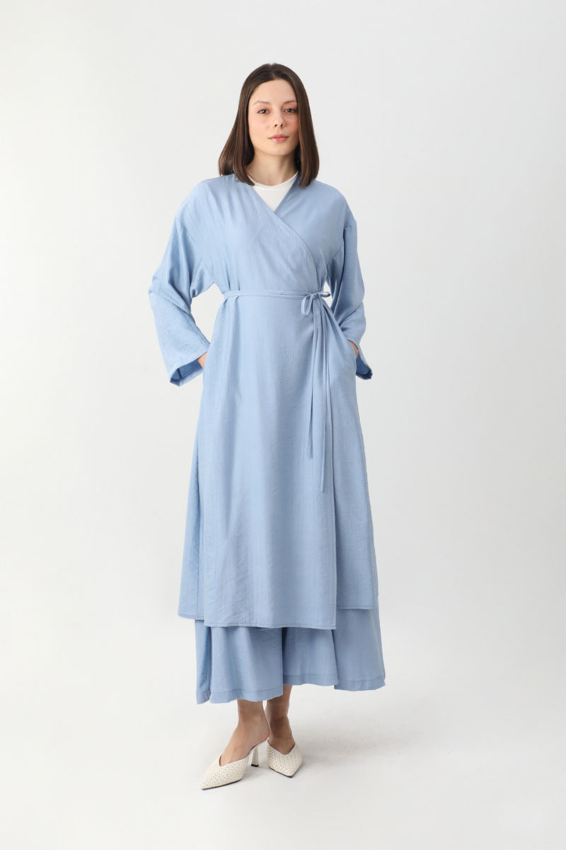 Uzun Kimono Takım Bebe Mavisi. V yakadır, düşük omuzludur, yandan bağlama detaylıdır, ceplidir, Pantolon arkadan lastiklidir, yandan cepli ve fermuarlıdır, önden v parça detaylıdır, pilelidir, Günlük kullanım ve özel günlerinizde tercih edebilirsiniz.