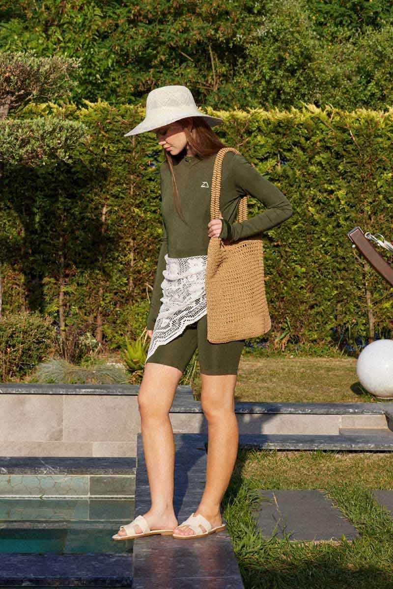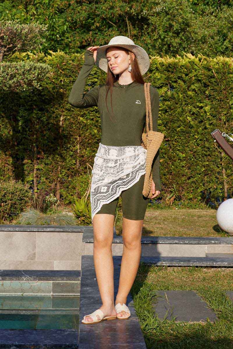 Uzun Kollu Şortlu Yüzücü Mayosu Haki. Hakim yakalıdır, önden yarım fermuarlıdır, cepsizdir, bilek kısmı parmak geçirme detaylıdır. Dar kalıptır.(Yandan bağlamalı etek ve pareo takıma dahil değildir.)