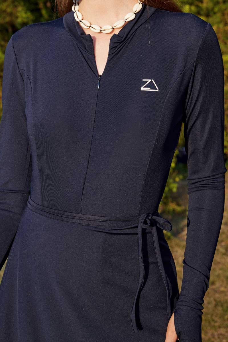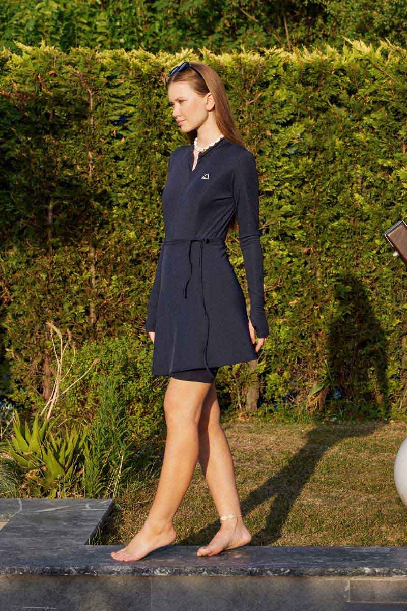 Uzun Kollu Şortlu Yüzücü Mayosu Lacivert. Hakim yakalıdır, önden yarım fermuarlıdır, cepsizdir, bilek kısmı parmak geçirme detaylıdır. Dar kalıptır.(Yandan bağlamalı etek ve pareo takıma dahil değildir.)