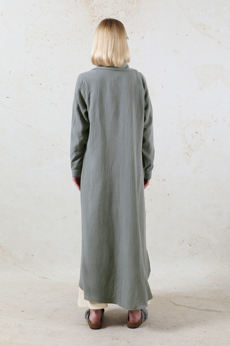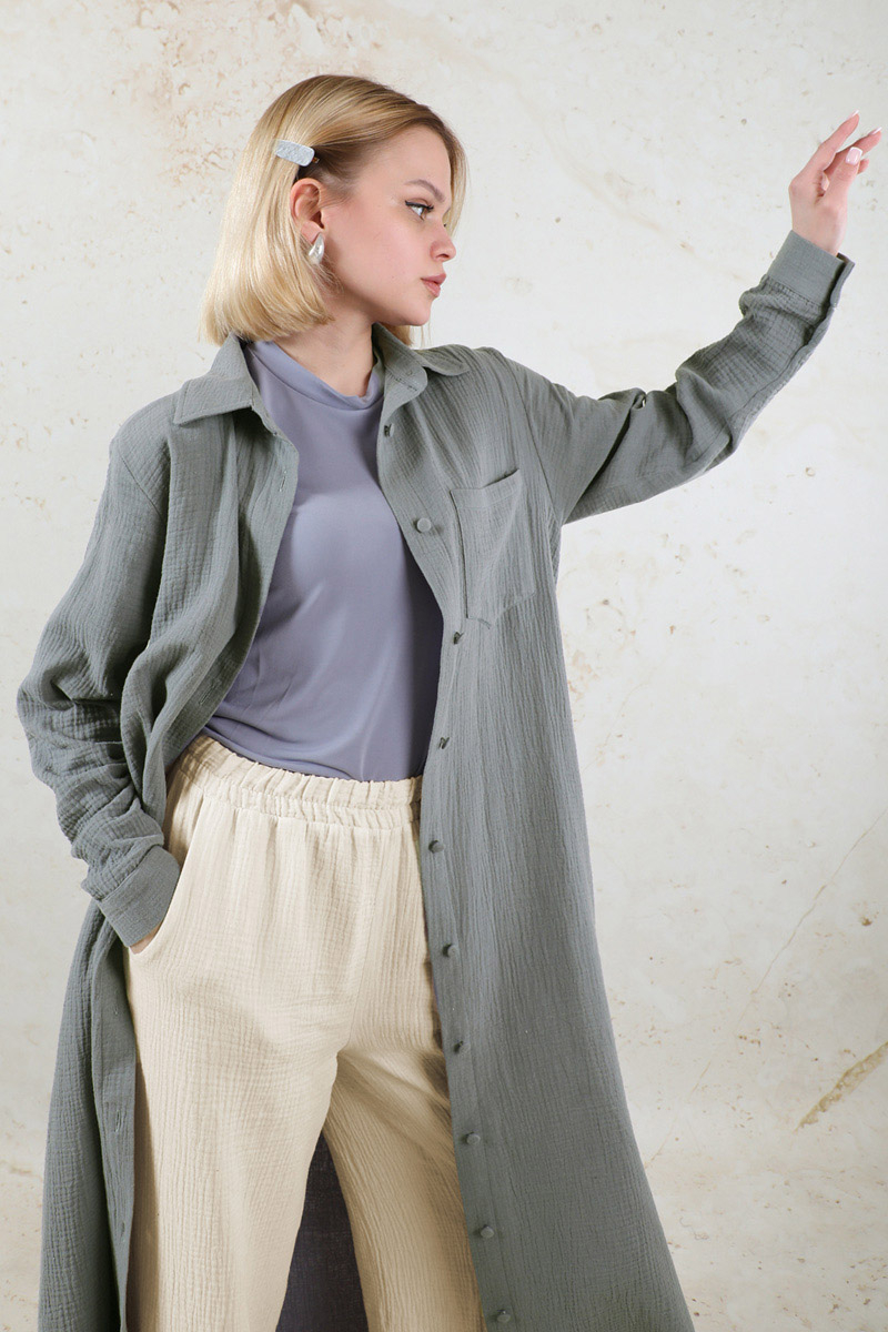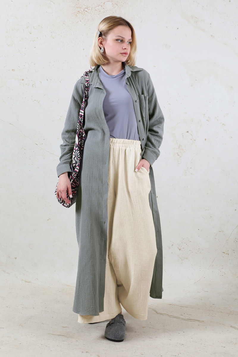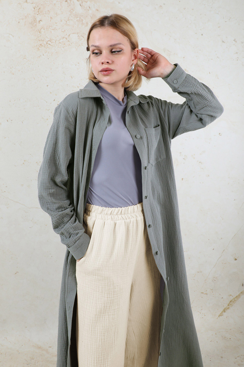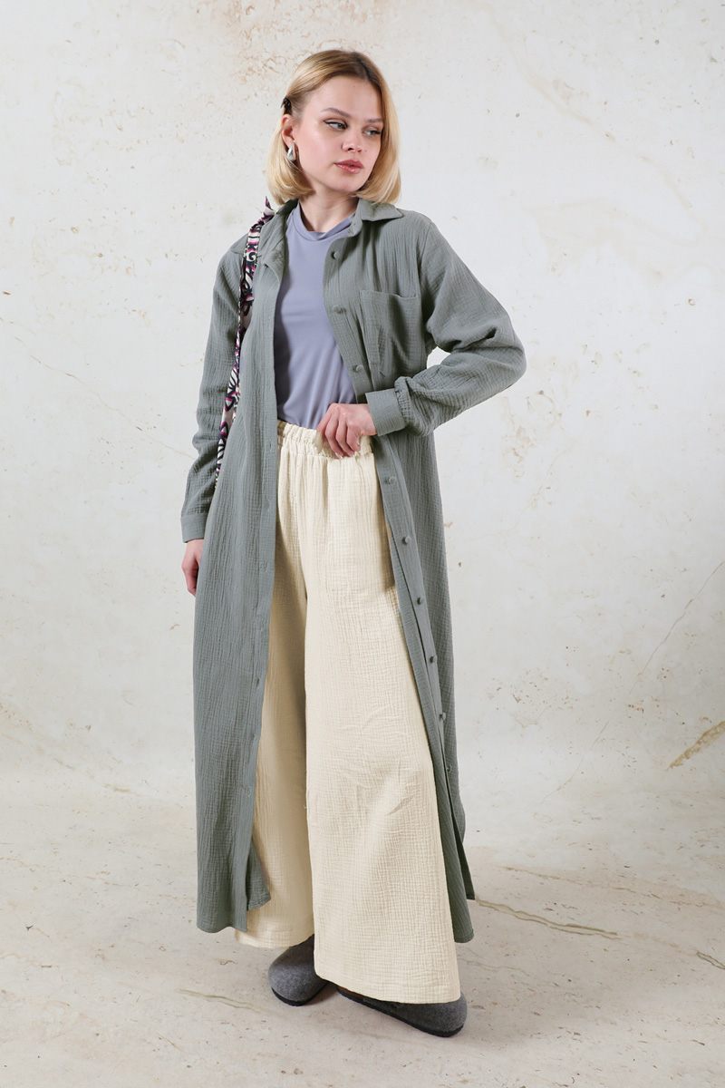 Uzun Muslin Gömlek Takım Antrasit. Gömlek yakalıdır. Önü Düğmelidir. Ceplidir. Tuniğin etek ucu ovâl ve yırtmaç detaylıdır. Kaplama düğmelidir. Pantolon beli lastiklidir. Bol paça ve Bol kesimdir. Pantolon yandan ceplidir. Günlük kullanım ve özel günlerinizde tercih edebilirsiniz.