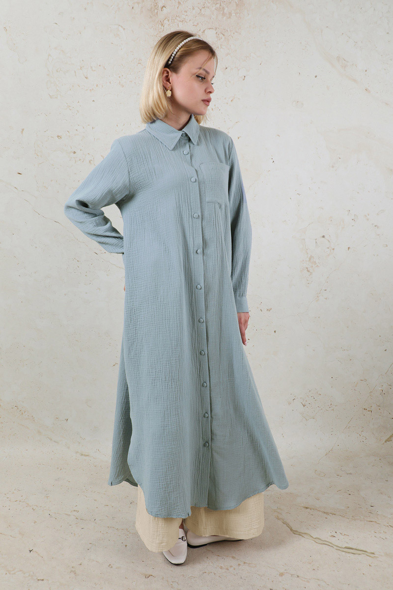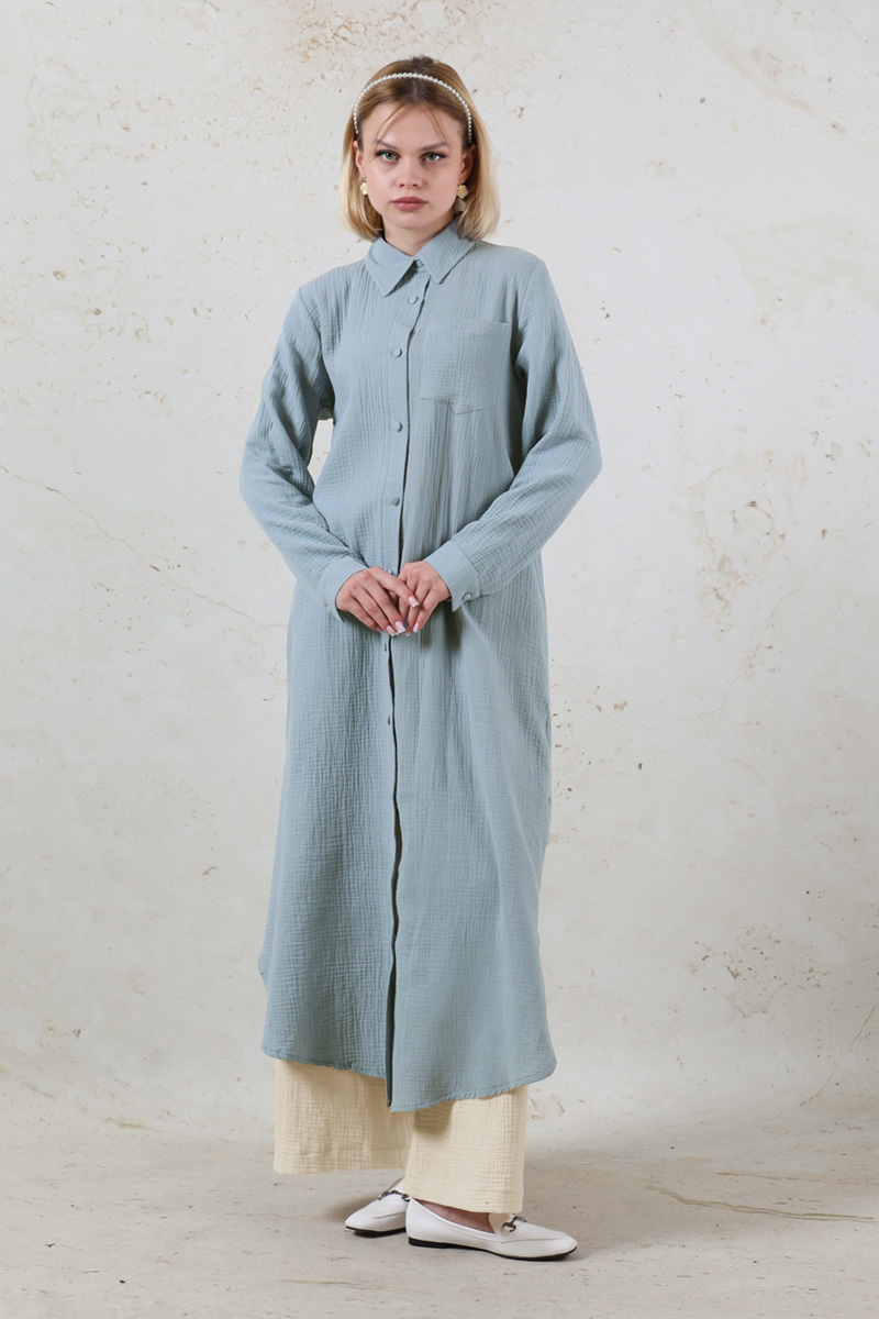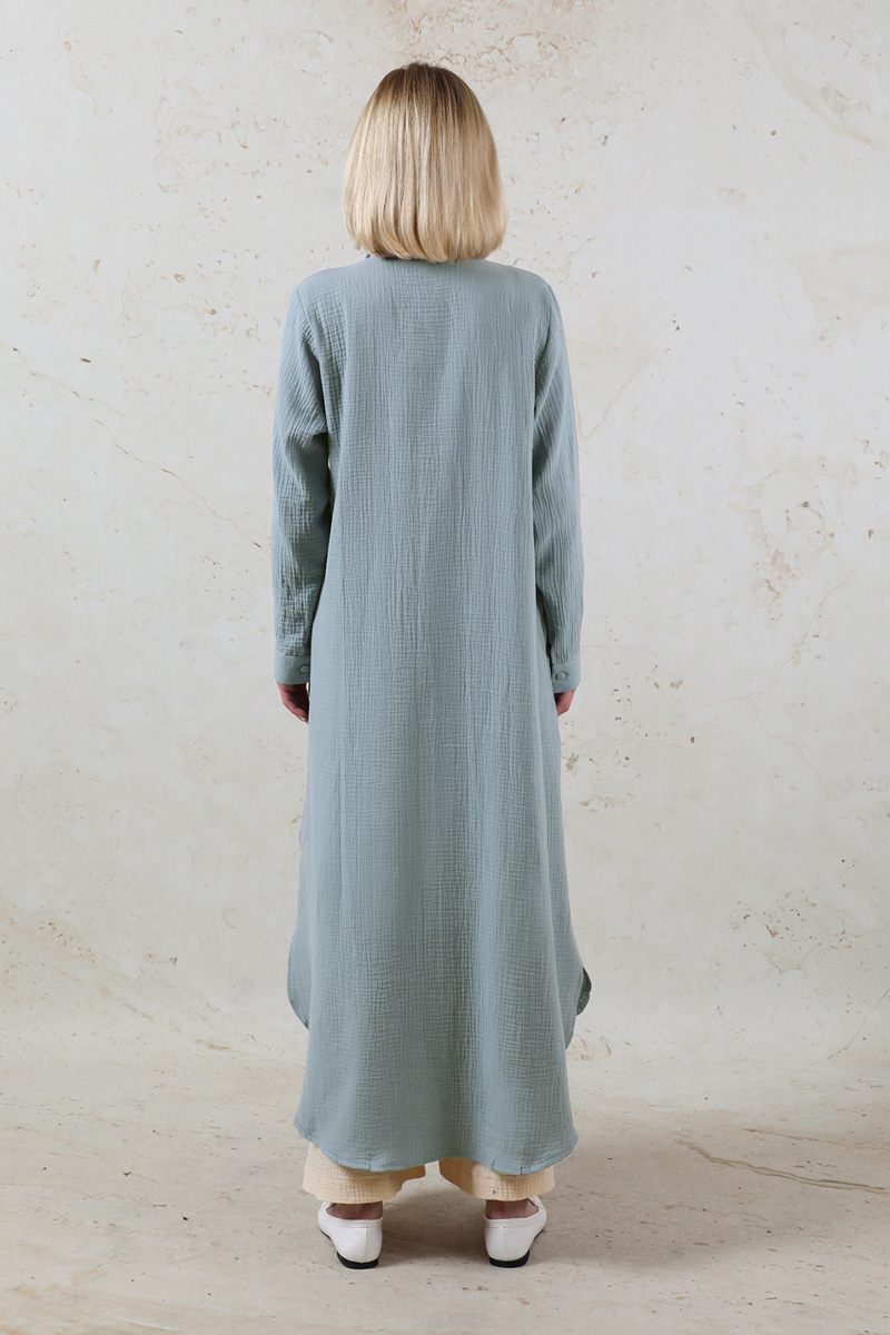 Uzun Muslin Gömlek Takım Bebe Mavisi. Gömlek yakalıdır. Önü Düğmelidir. Ceplidir. Tuniğin etek ucu ovâl ve yırtmaç detaylıdır. Kaplama düğmelidir. Pantolon beli lastiklidir. Bol paça ve Bol kesimdir. Pantolon yandan ceplidir. Günlük kullanım ve özel günlerinizde tercih edebilirsiniz.