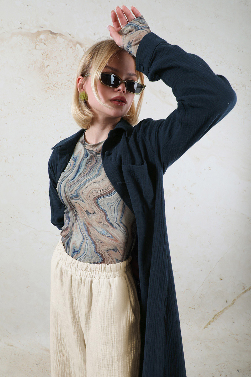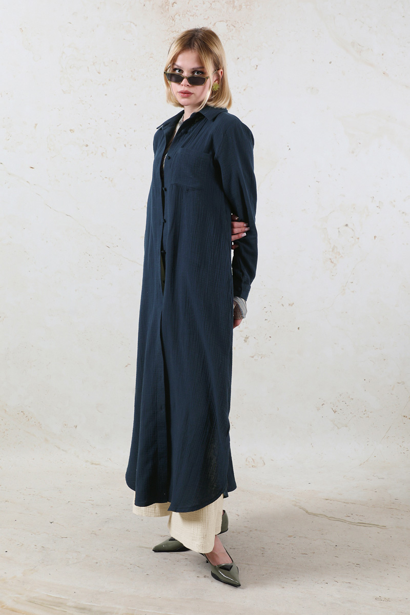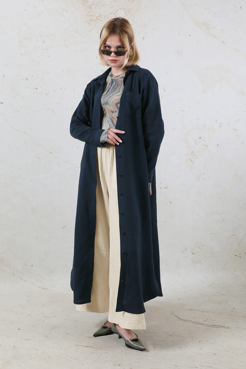 Uzun Muslin Gömlek Takım Lacivert