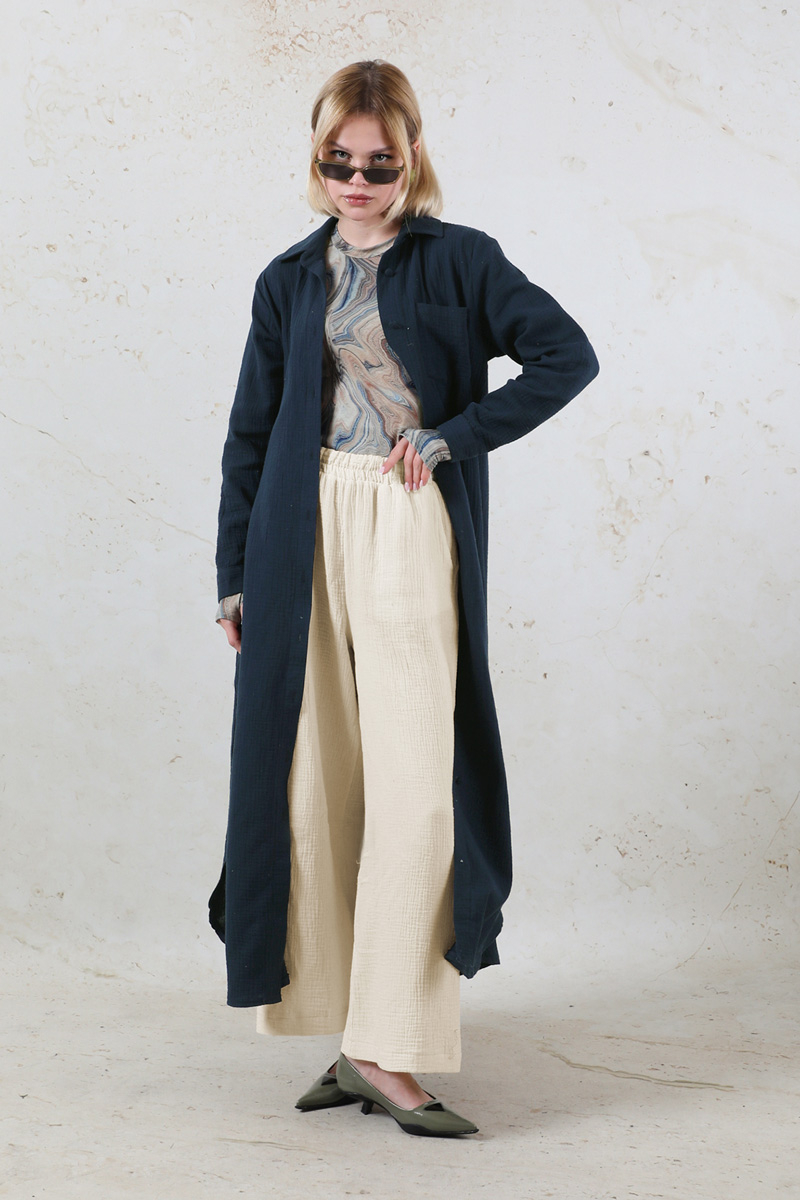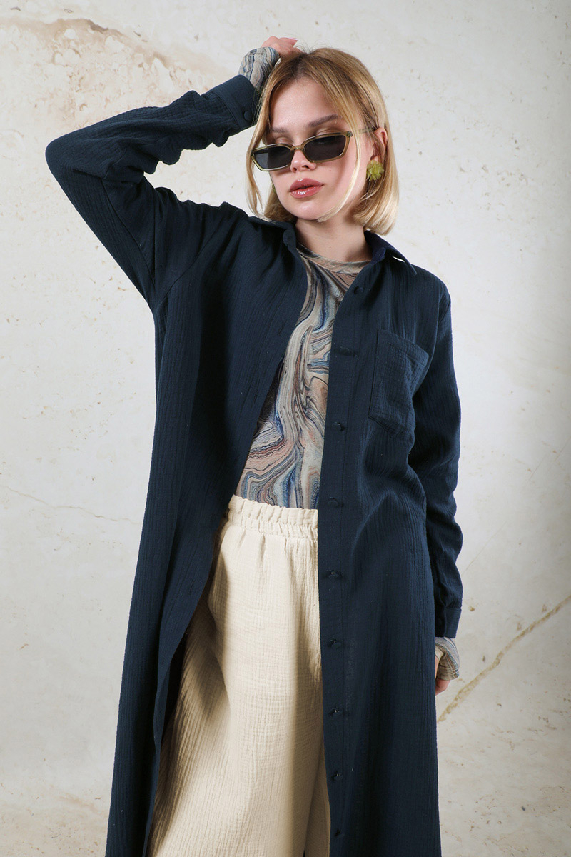 Uzun Muslin Gömlek Takım Lacivert. Gömlek yakalıdır. Önü Düğmelidir. Ceplidir. Tuniğin etek ucu ovâl ve yırtmaç detaylıdır. Kaplama düğmelidir. Pantolon beli lastiklidir. Bol paça ve Bol kesimdir. Pantolon yandan ceplidir. Günlük kullanım ve özel günlerinizde tercih edebilirsiniz.