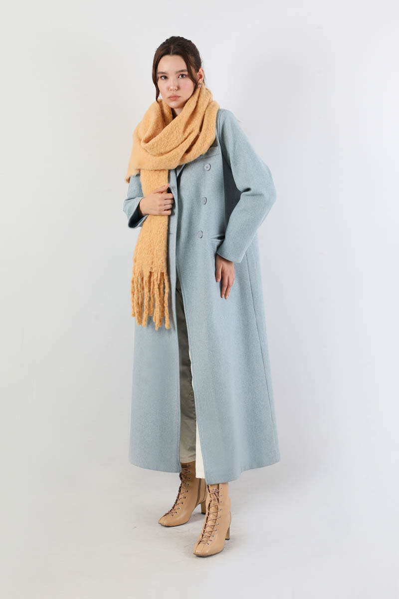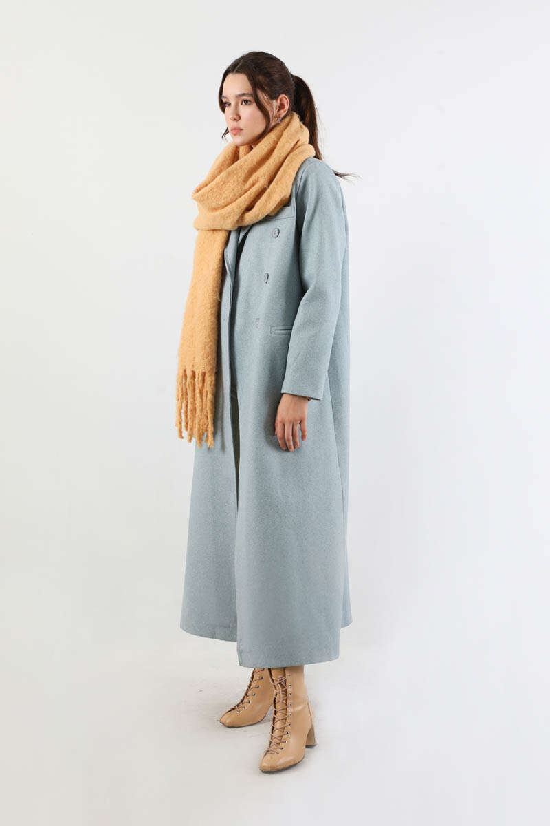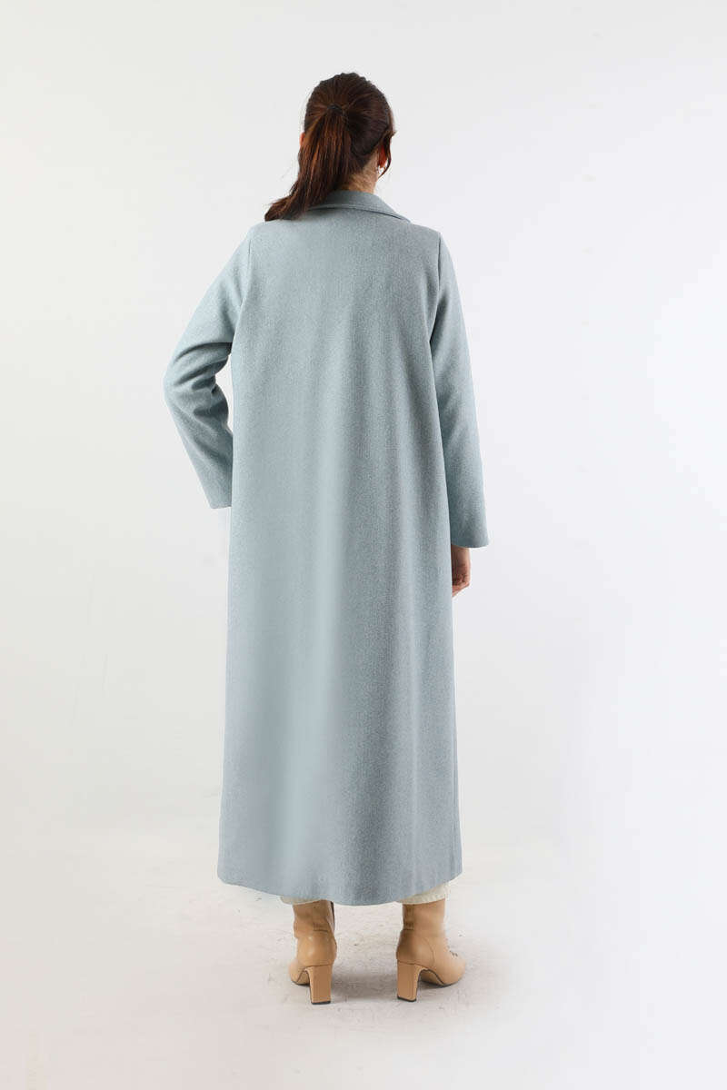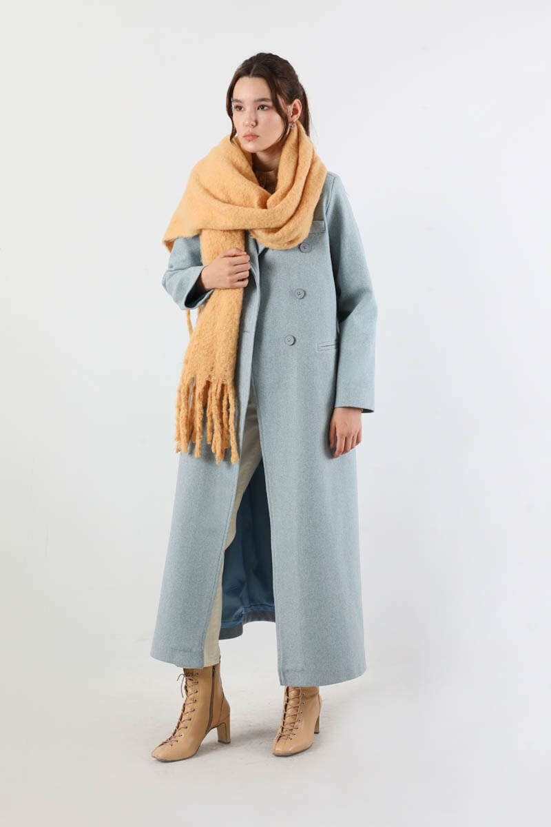 Long Oversize Cachet Coat Baby Blue. English Collar. Double-breasted closure. Asymmetric button. Pocket detail on the side and chest. Lined.