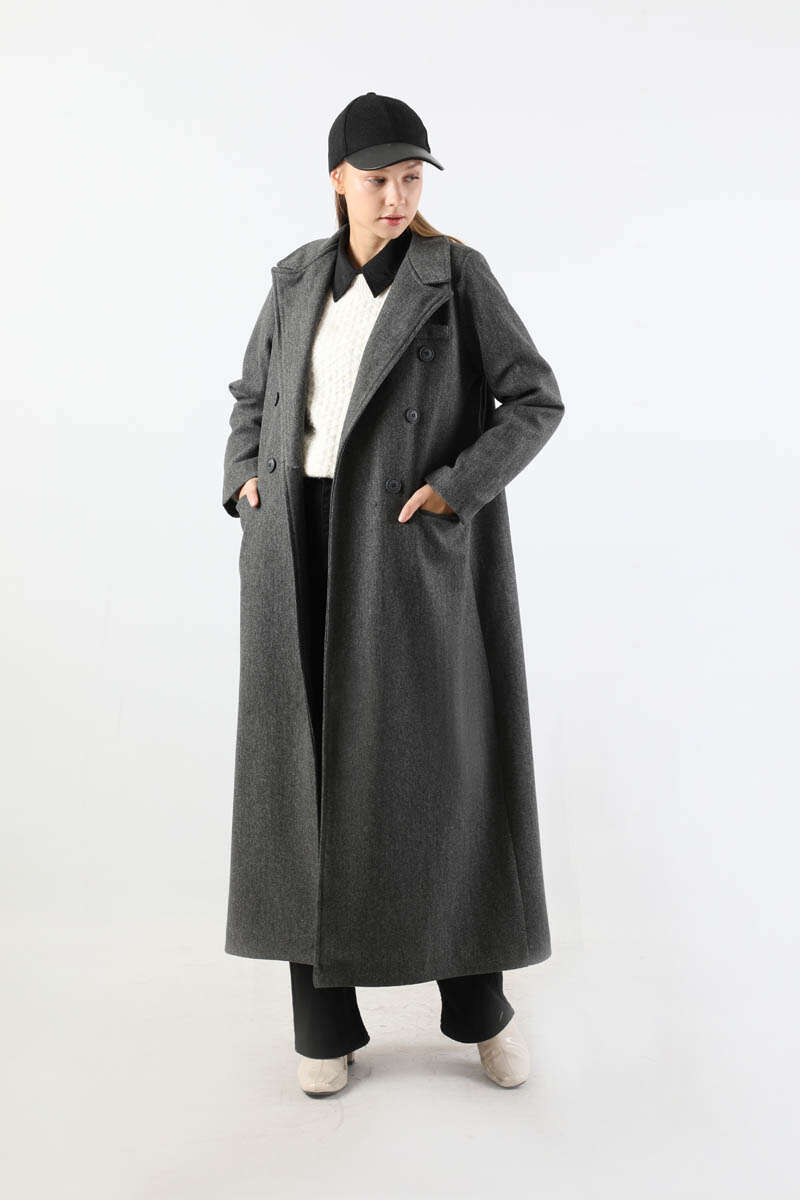 Long Oversize Cachet Coat Anthracite. English Collar. Double-breasted closure. Asymmetric button. Pocket detail on the side and chest. Lined.