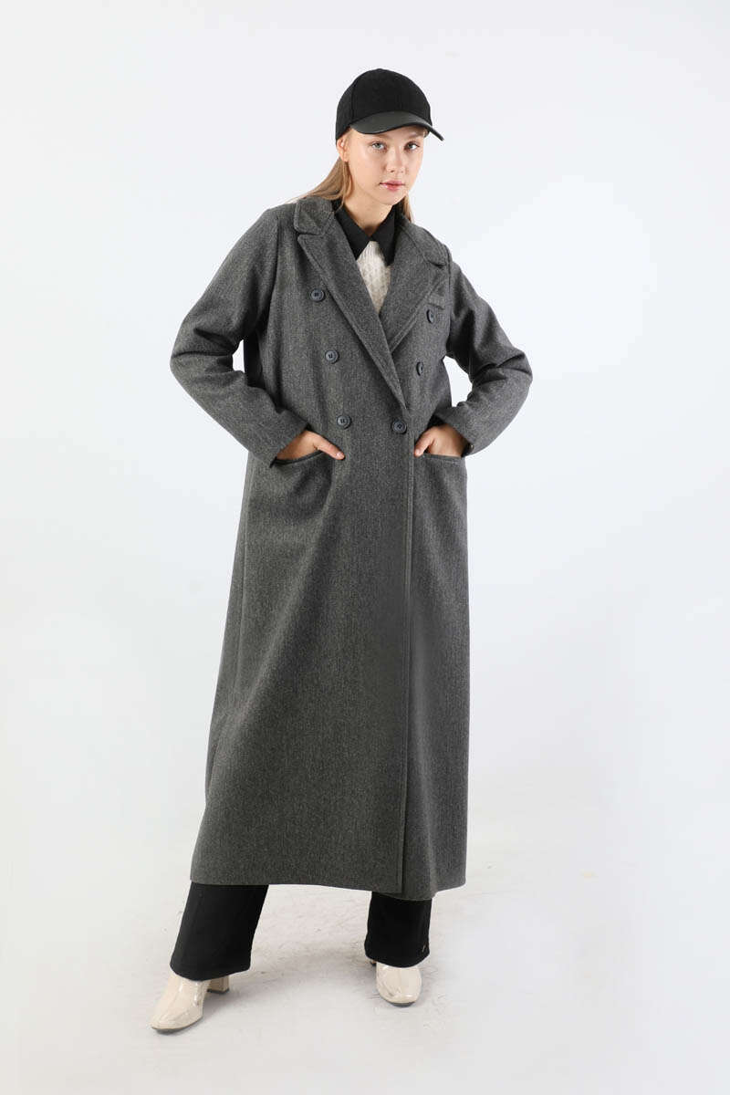 Uzun Oversize Kaşe Antrasit. İngiliz Yaka. Kruvaze kapama. Asimetrik düğmeli. Yandan ve göğüsten cep detaylı. Astarlı.