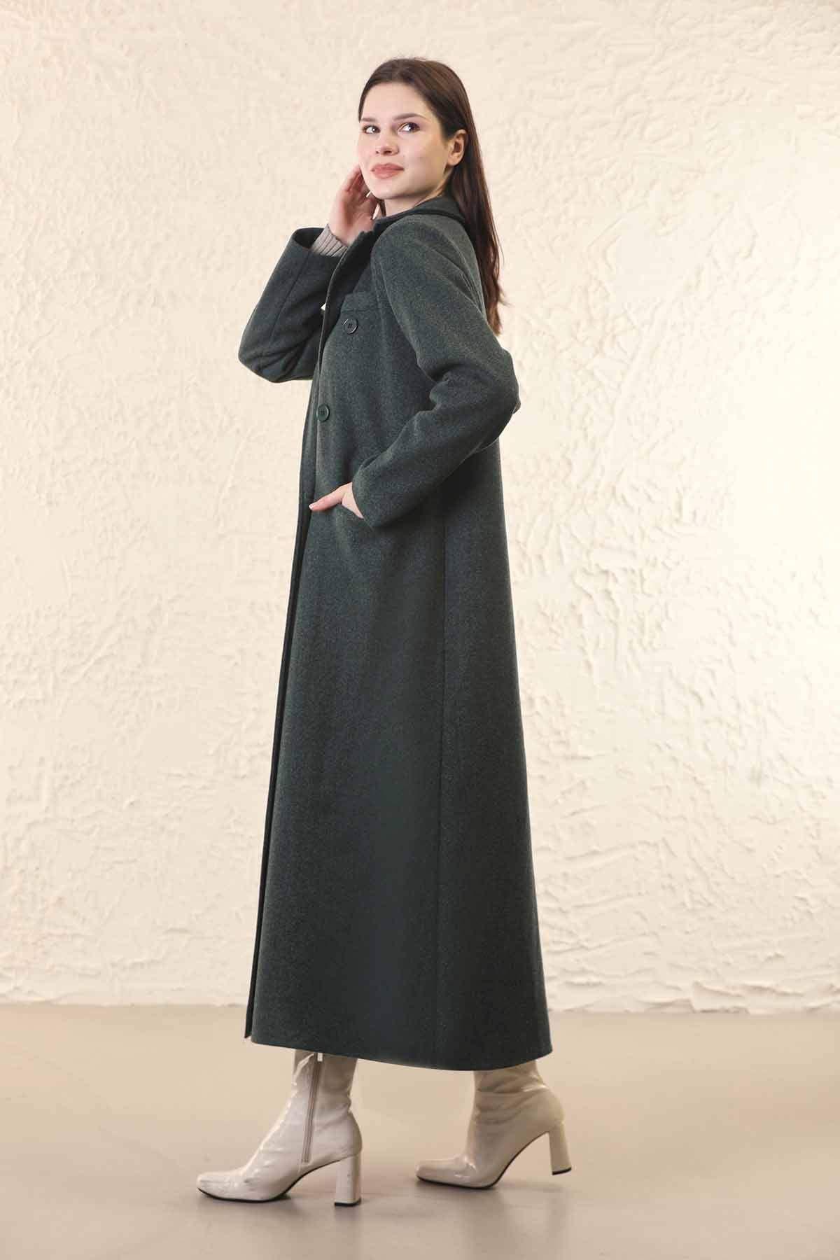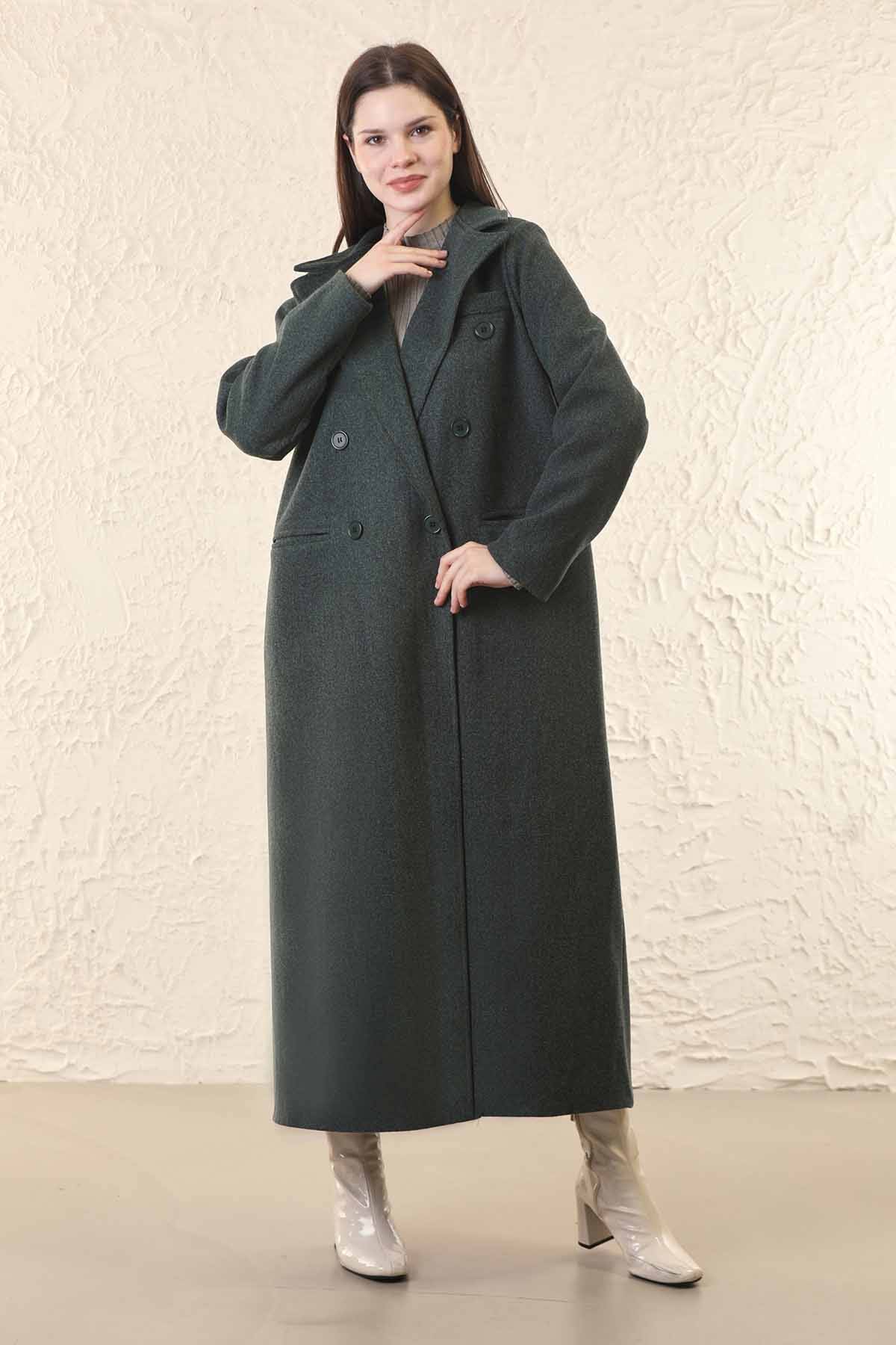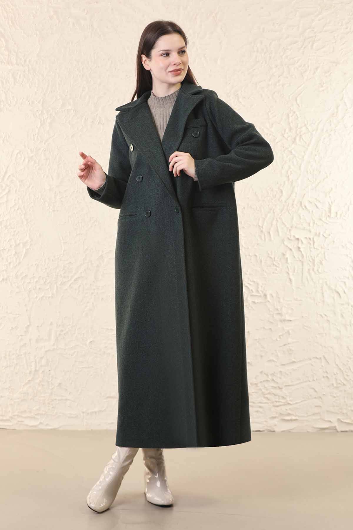 Uzun Oversize Kaşe Koyu Yeşil . İngiliz Yaka. Kruvaze kapama. Asimetrik düğmeli. Yandan ve göğüsten cep detaylı. Astarlı.