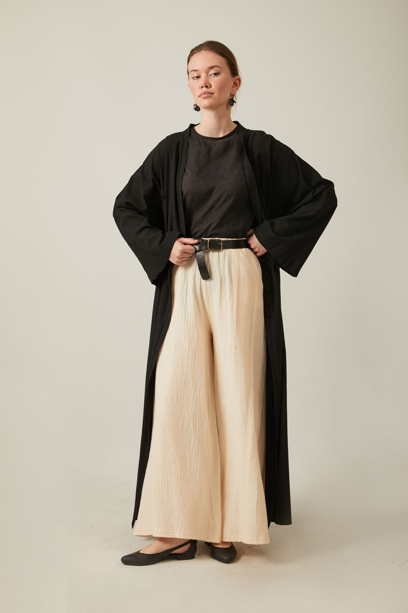Crafted from slub linen fabric known for its natural texture and breathability, this V Neck Abaya offers both comfort and elegance. Its front buttoned design ensures easy wear, while the elasticated waist provides a flattering and relaxed fit. A perfect choice for those seeking a minimal yet striking look—ideal for both everyday use and special occasions.