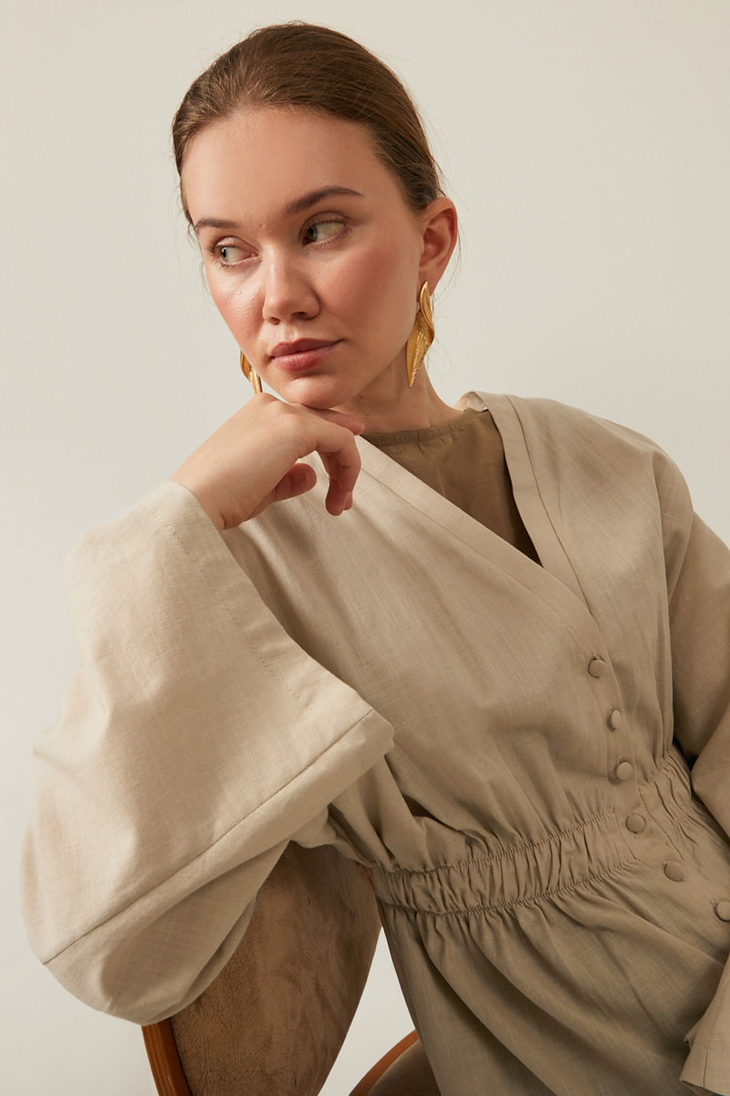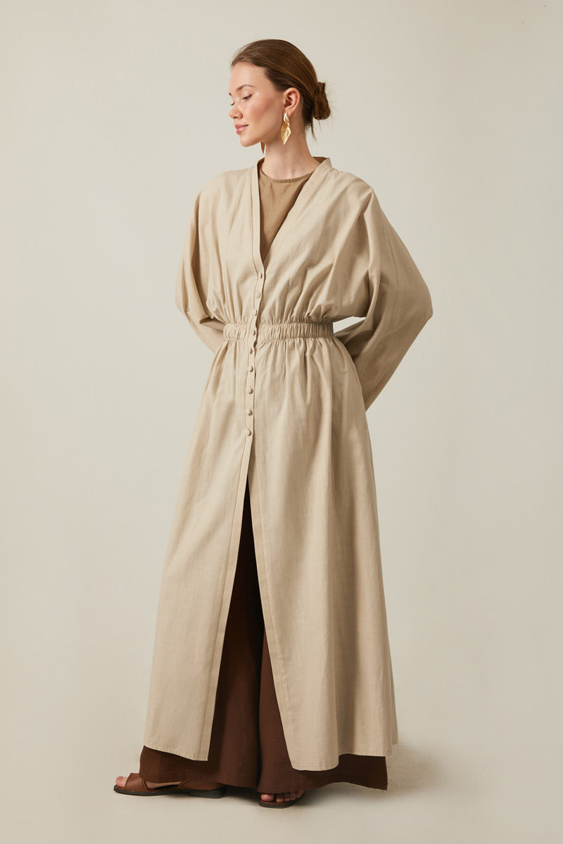 Crafted from slub linen fabric known for its natural texture and breathability, this V Neck Abaya offers both comfort and elegance. Its front buttoned design ensures easy wear, while the elasticated waist provides a flattering and relaxed fit. A perfect choice for those seeking a minimal yet striking look—ideal for both everyday use and special occasions.