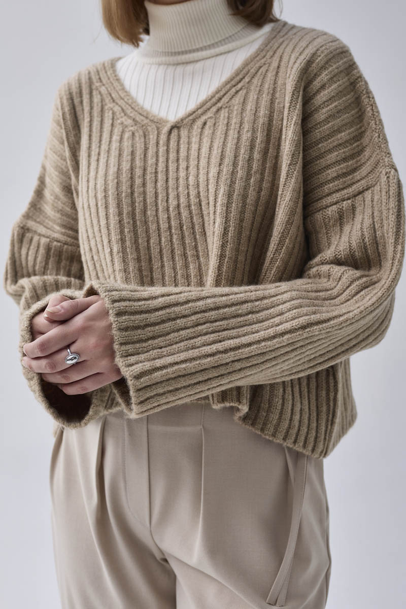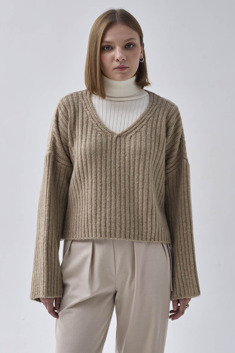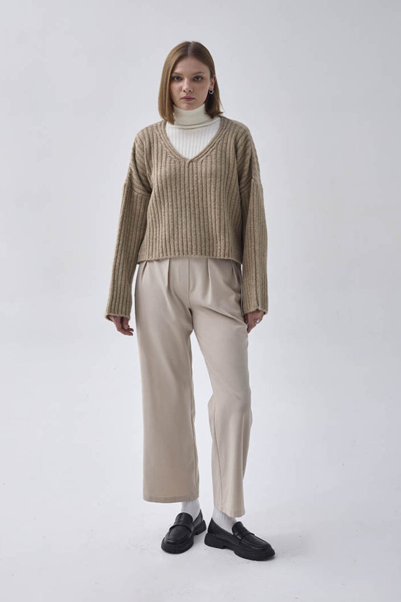 With its modern cut and relaxed style, this crop sweater adds a chic touch to everyday outfits. The thick ribbed texture keeps you warm on cold days, while the V-neck detail offers a comfortable and stylish wear. Thanks to its short length, it pairs perfectly with high-waisted trousers and skirts for an effortlessly balanced look.
