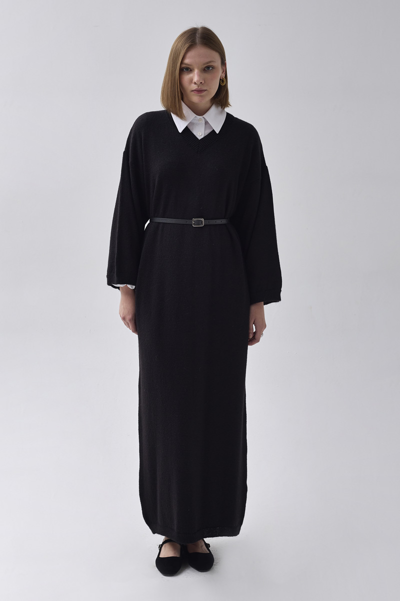 With its simple design and long silhouette, this dress offers both comfort and elegance in one piece. The soft knit texture keeps you warm on cold days, while its relaxed, loose fit ensures effortless wear for everyday looks. Thanks to its timeless form, it will become one of the essential pieces in your wardrobe.