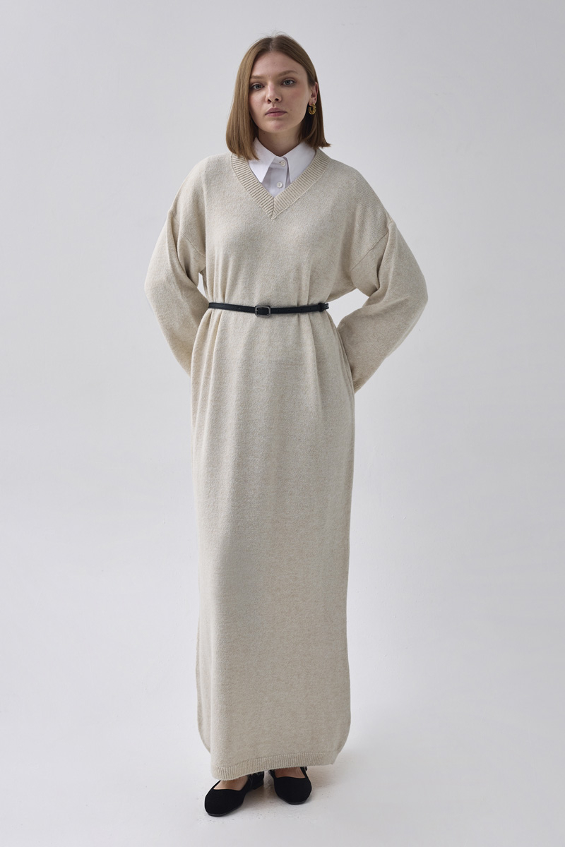 With its simple design and long silhouette, this dress offers both comfort and elegance in one piece. The soft knit texture keeps you warm on cold days, while its relaxed, loose fit ensures effortless wear for everyday looks. Thanks to its timeless form, it will become one of the essential pieces in your wardrobe.