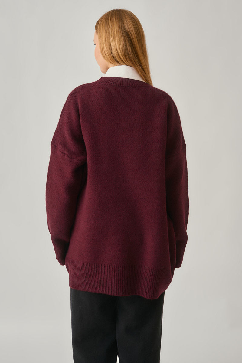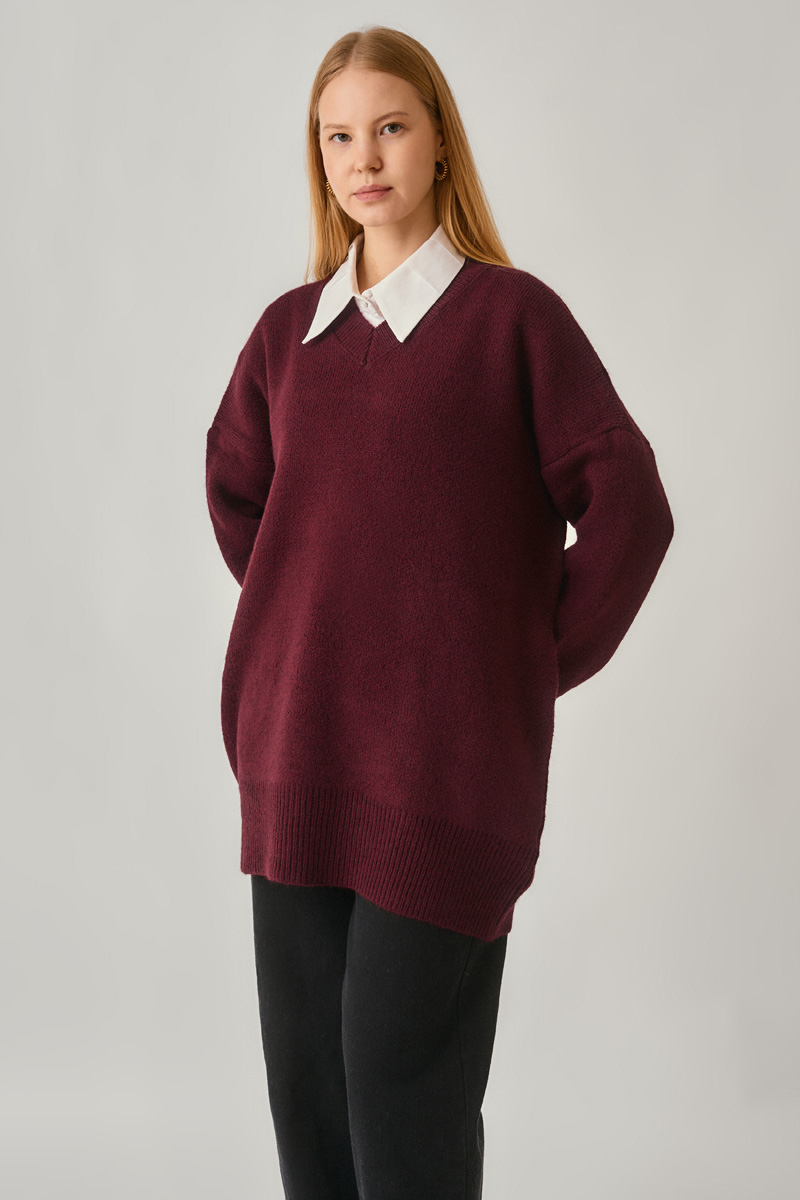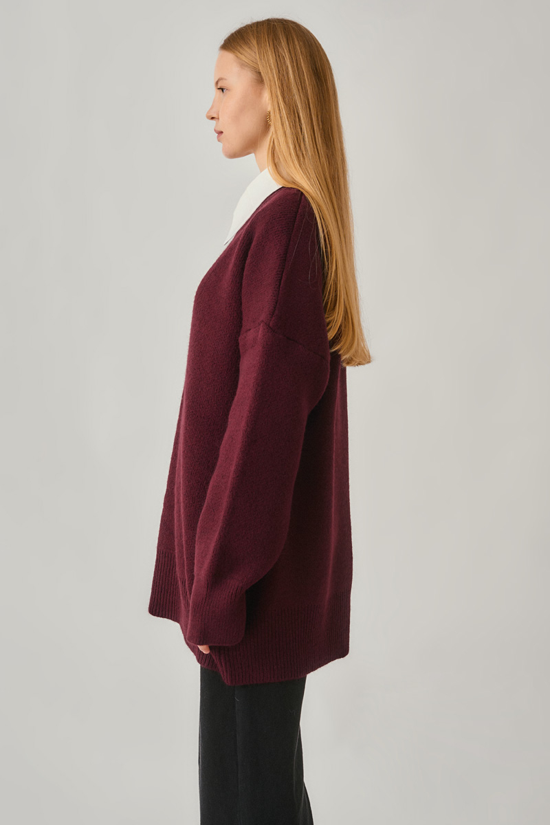 The Knit Sweater with V-Neck combines a clean line with a modern silhouette. Its soft knit texture and relaxed fit provide comfort throughout the day, while the oversized form creates a timeless look. Pair it with classic white shirts or denim pieces for an effortless style. A versatile piece suitable for both daily city wear and office looks.