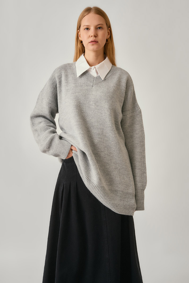 The Knit Sweater with V-Neck combines a clean line with a modern silhouette. Its soft knit texture and relaxed fit provide comfort throughout the day, while the oversized form creates a timeless look. Pair it with classic white shirts or denim pieces for an effortless style. A versatile piece suitable for both daily city wear and office looks.