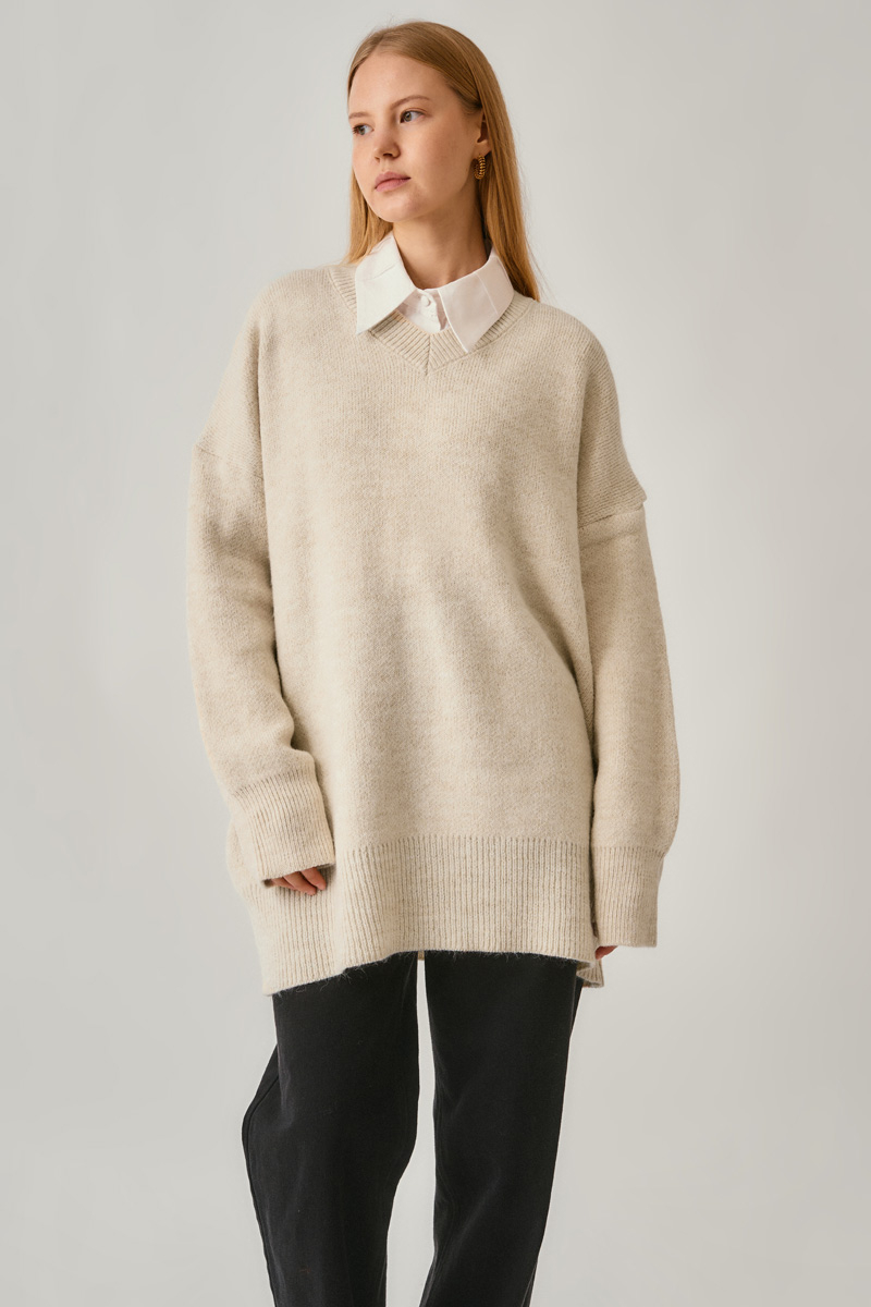 The Knit Sweater with V-Neck combines a clean line with a modern silhouette. Its soft knit texture and relaxed fit provide comfort throughout the day, while the oversized form creates a timeless look. Pair it with classic white shirts or denim pieces for an effortless style. A versatile piece suitable for both daily city wear and office looks.