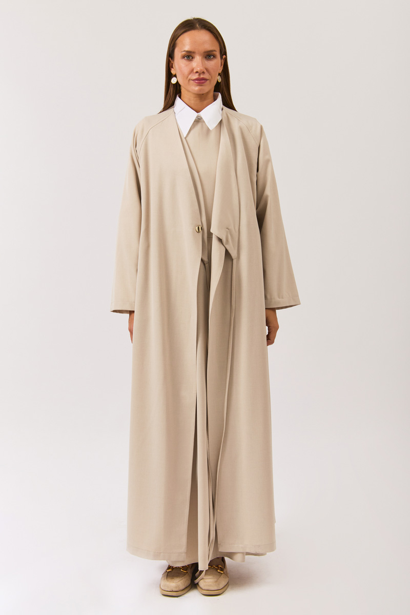 With its clean lines and elegant details, this abaya is one of the most sophisticated pieces to complete a contemporary city look. The minimalist form and relaxed fit ensure all-day comfort, while the V-neck design adds a modern touch. The thin tie detail at the waist gently highlights the silhouette, allowing for versatile styling. Prioritizing everyday elegance, this piece easily complements both classic and casual outfits.