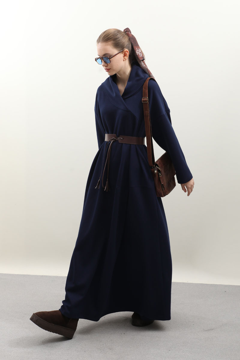 V Şal Yaka Modal Elbise Lacivert. Katlamalı yaka detaylıdır, düşük omuzludur, yanda dikiş detayı vardır, yandan gizli ceplidir. Deri kemerlidir. Mevsimliktir.