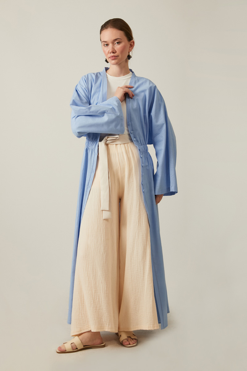 V Yaka Abaya Bebe Mavisi, Doğal dokusu ve nefes alan yapısıyla ön plana çıkan flamlı keten kumaştan üretilen, önden düğmeli tasarımıyla kolay giyilip çıkarılırken, lastikli beli sayesinde rahat ve şık bir duruş sağlar. Günlük kullanımda ya da özel günlerde tercih edilebilecek bu abaya, minimal ama etkileyici bir görünüm isteyenler için ideal bir parçadır.