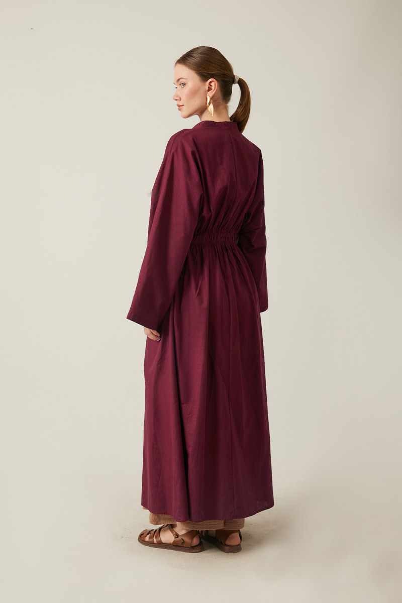 V Yaka Abaya Bordo, Doğal dokusu ve nefes alan yapısıyla ön plana çıkan flamlı keten kumaştan üretilen, önden düğmeli tasarımıyla kolay giyilip çıkarılırken, lastikli beli sayesinde rahat ve şık bir duruş sağlar. Günlük kullanımda ya da özel günlerde tercih edilebilecek bu abaya, minimal ama etkileyici bir görünüm isteyenler için ideal bir parçadır.