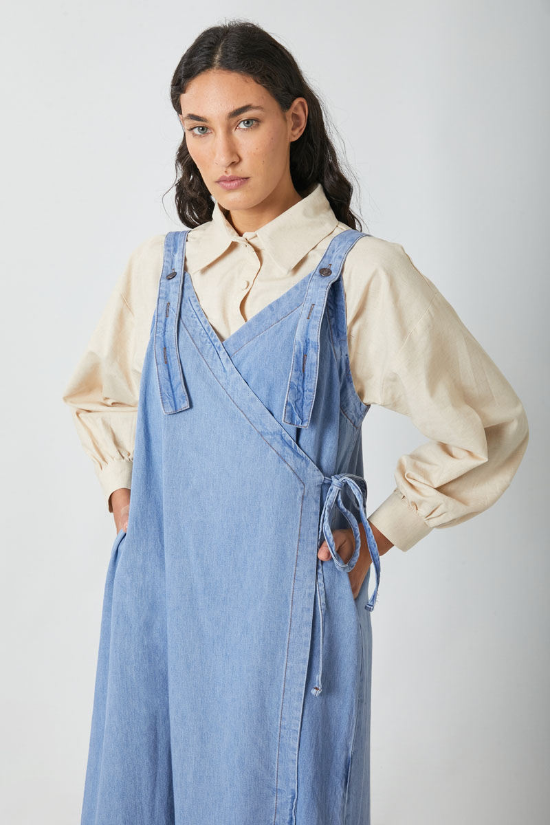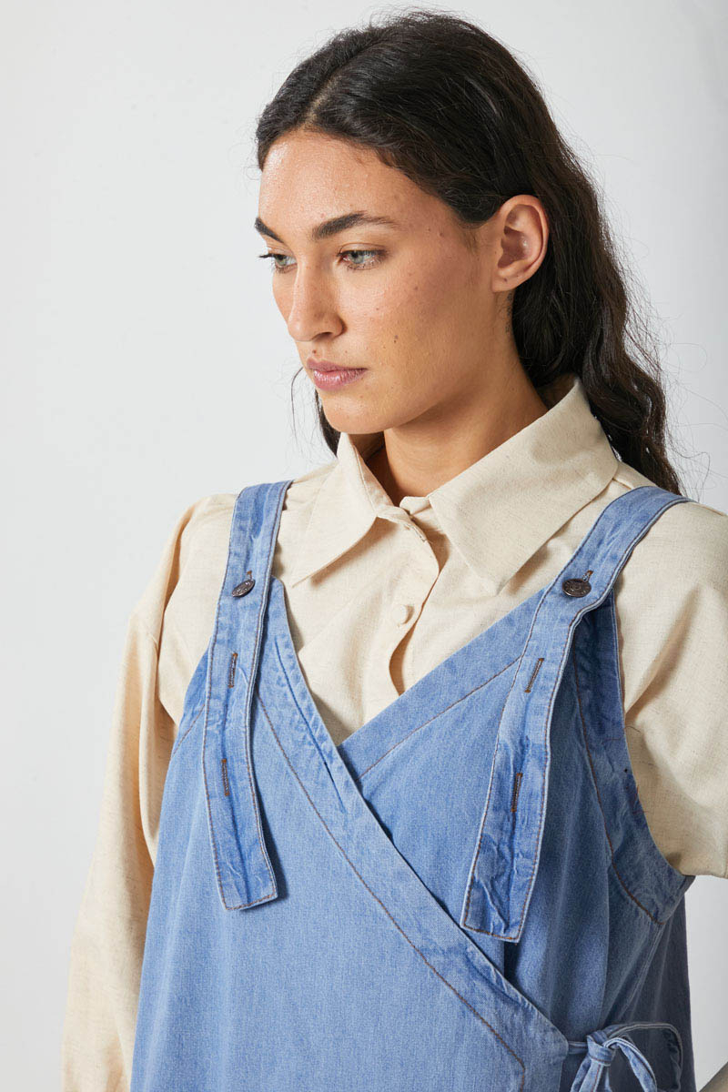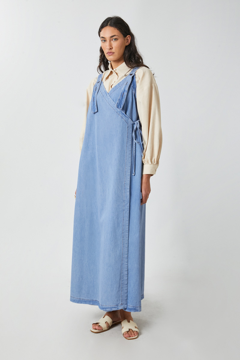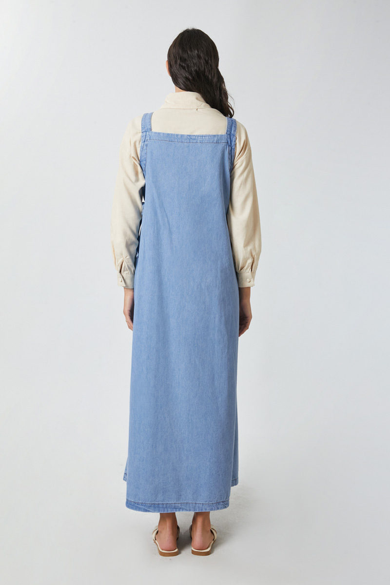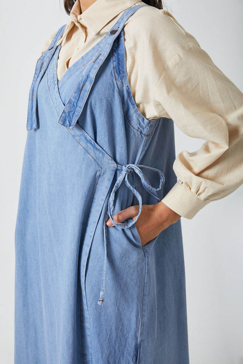 V Yaka Bağlamalı Jile Açık Mavi. V yakadır, omuz askıları düğme ile ayarlanılabilir olup yandan bağlama detaylıdır, yandan ceplidir,