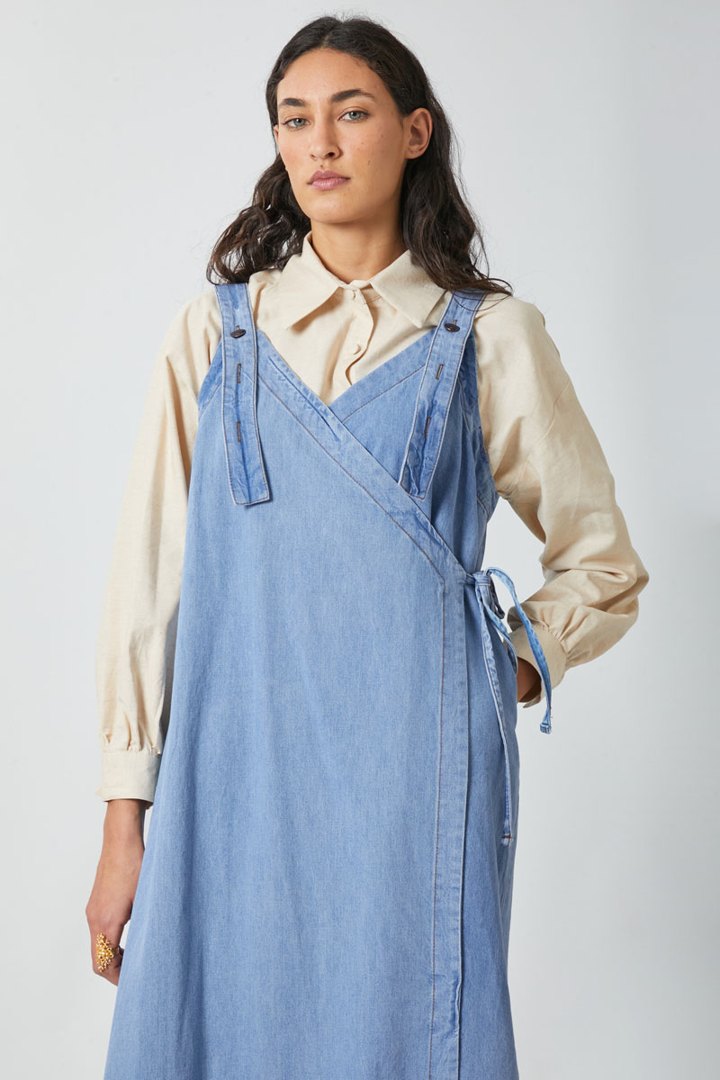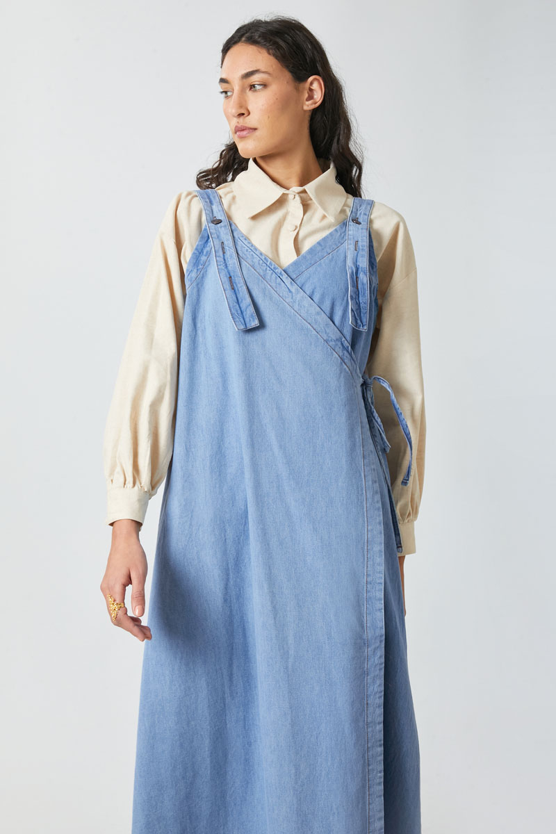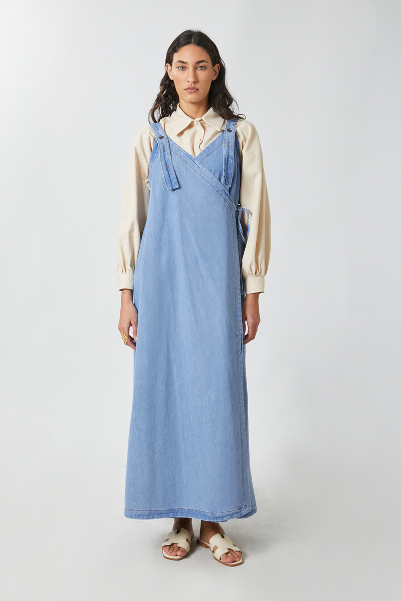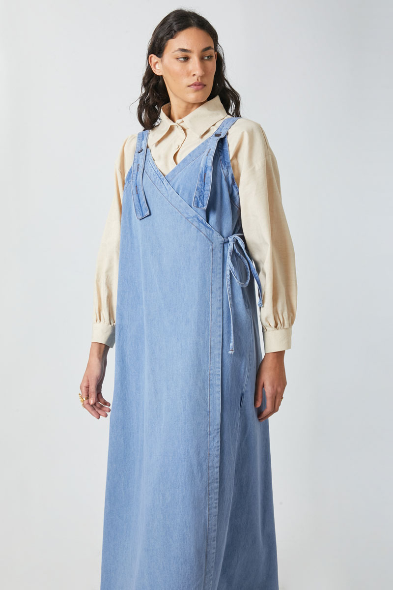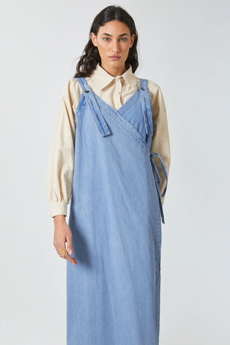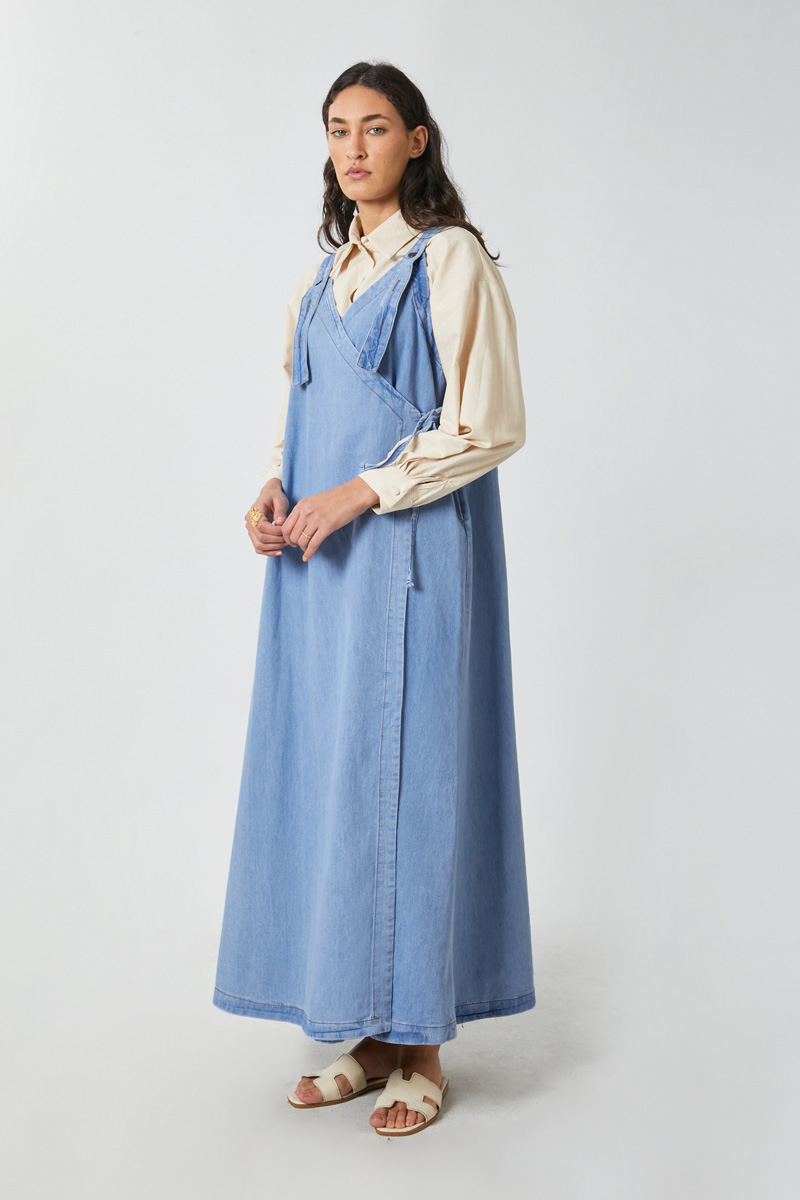 V Yaka Bağlamalı Jile Açık Mavi. V yakadır, omuz askıları düğme ile ayarlanılabilir olup yandan bağlama detaylıdır, yandan ceplidir,