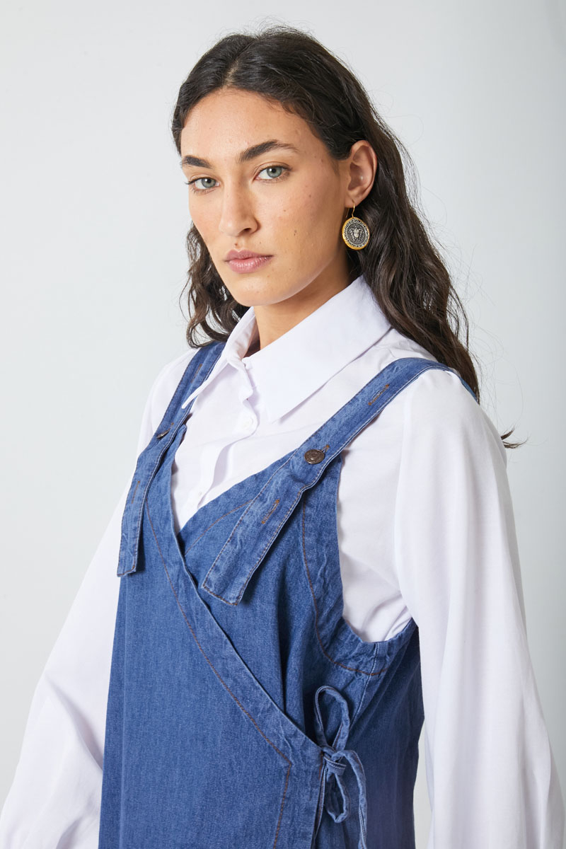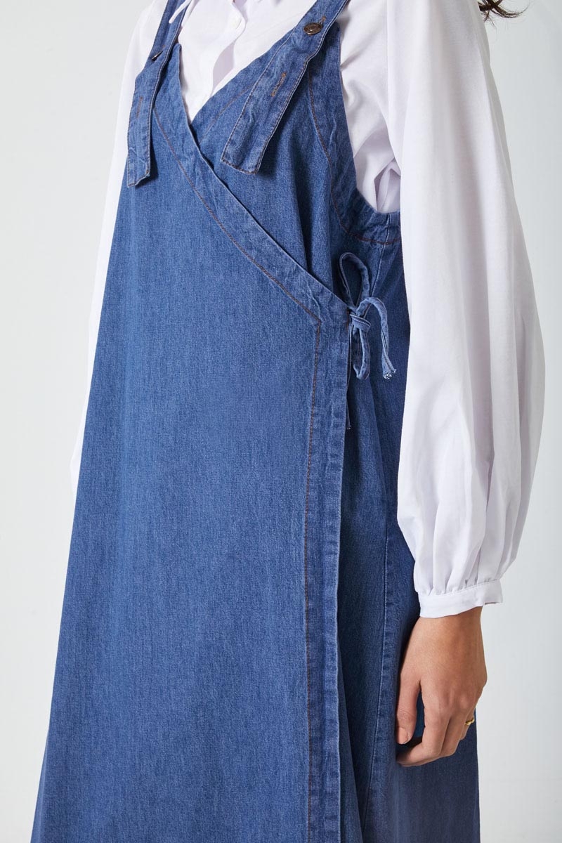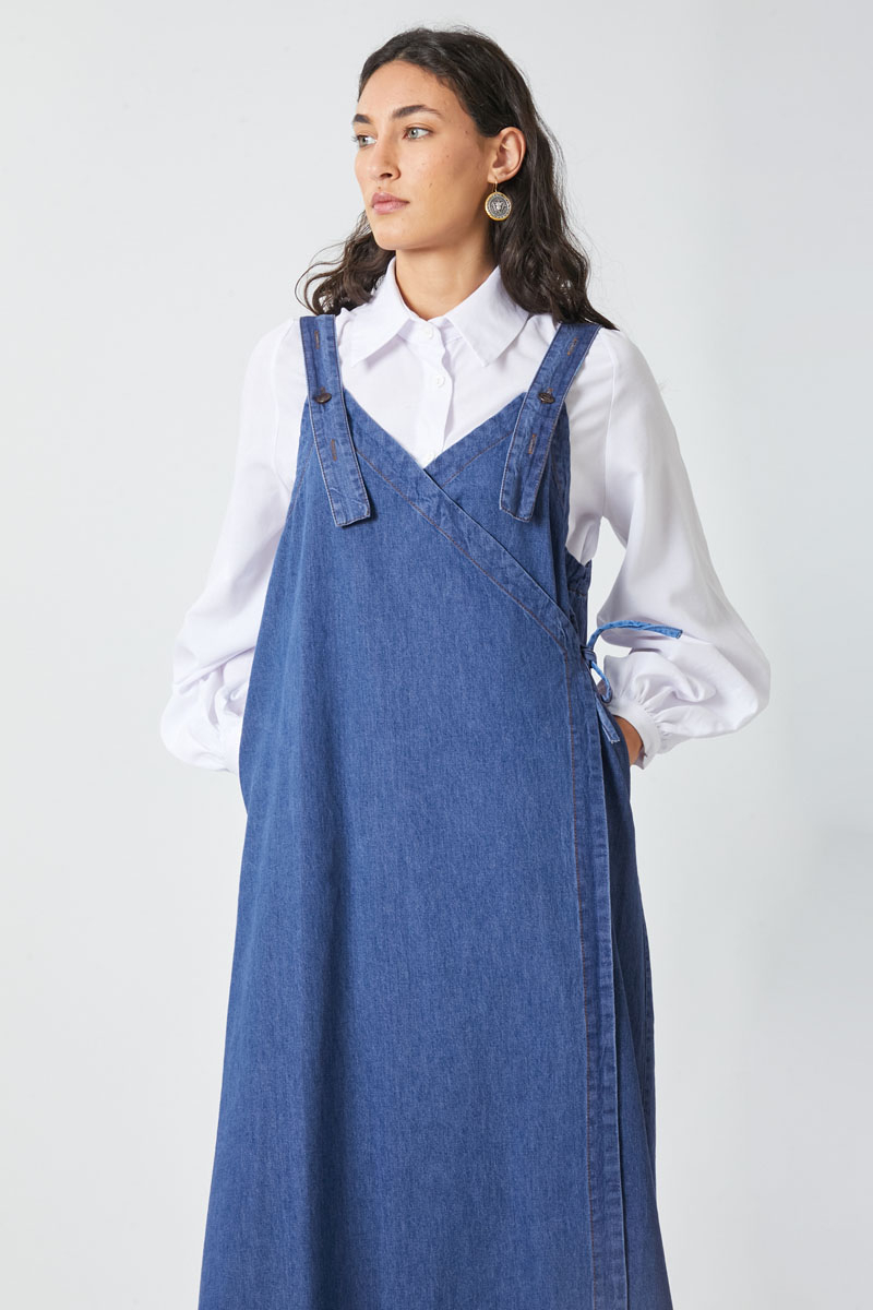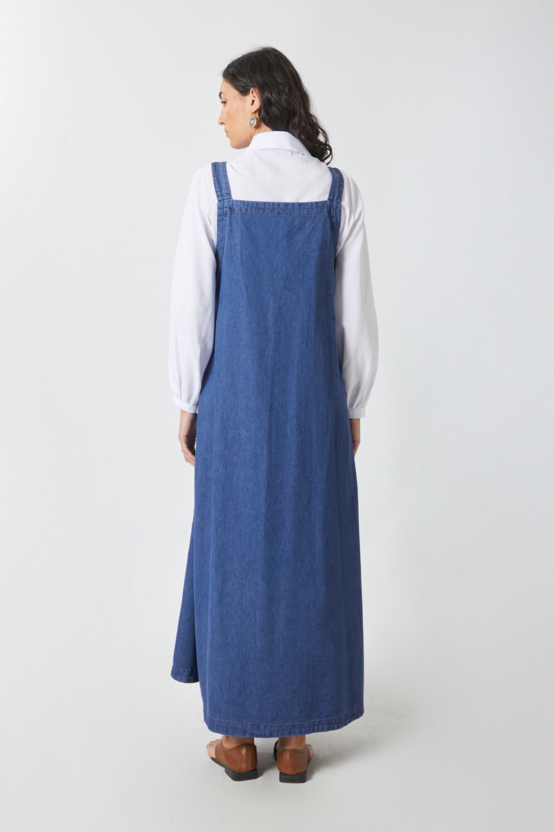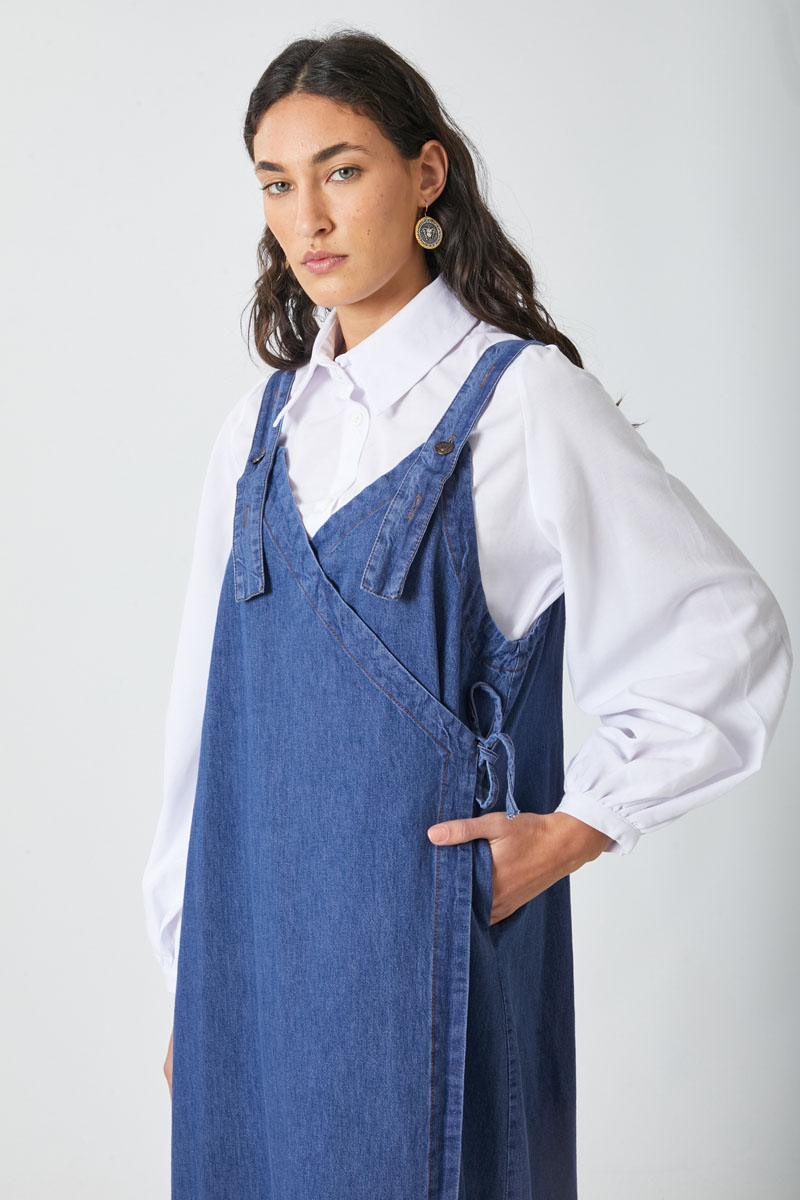 V Yaka Bağlamalı Jile Koyu Mavi. V yakadır, omuz askıları düğme ile ayarlanılabilir olup yandan bağlama detaylıdır, yandan ceplidir,