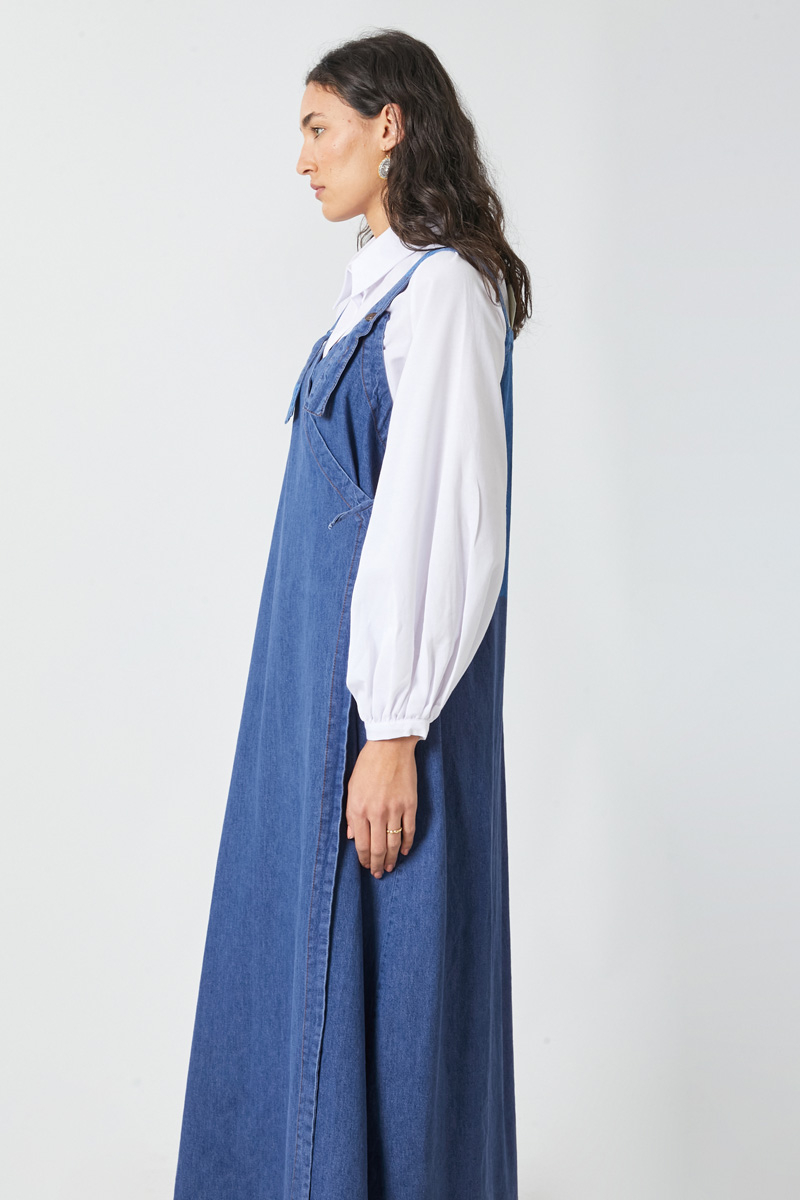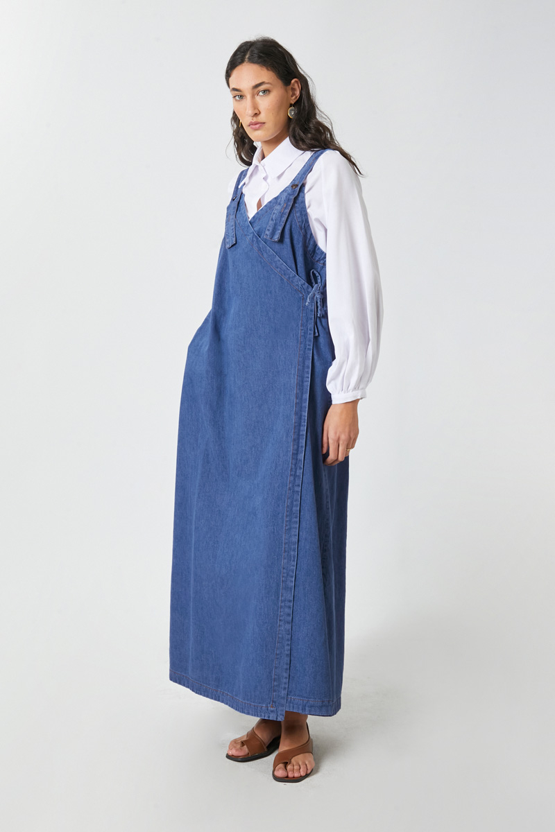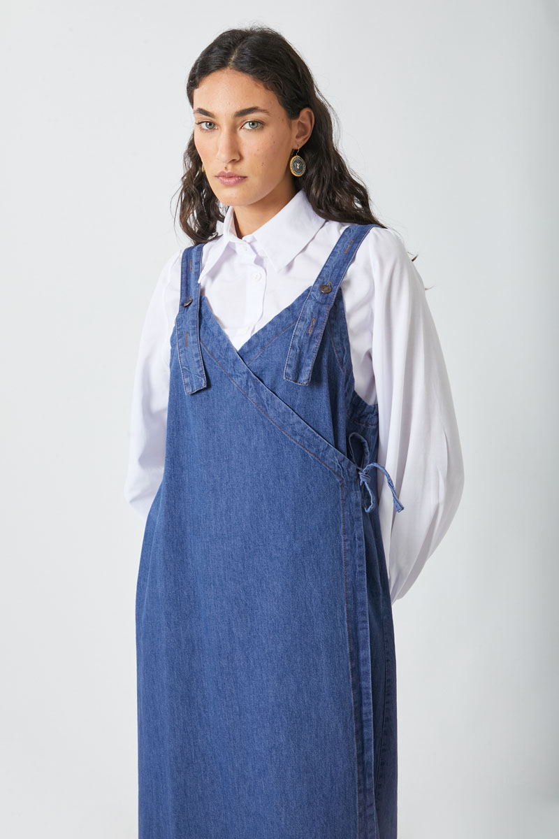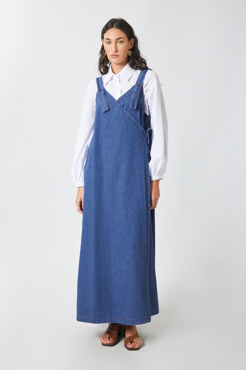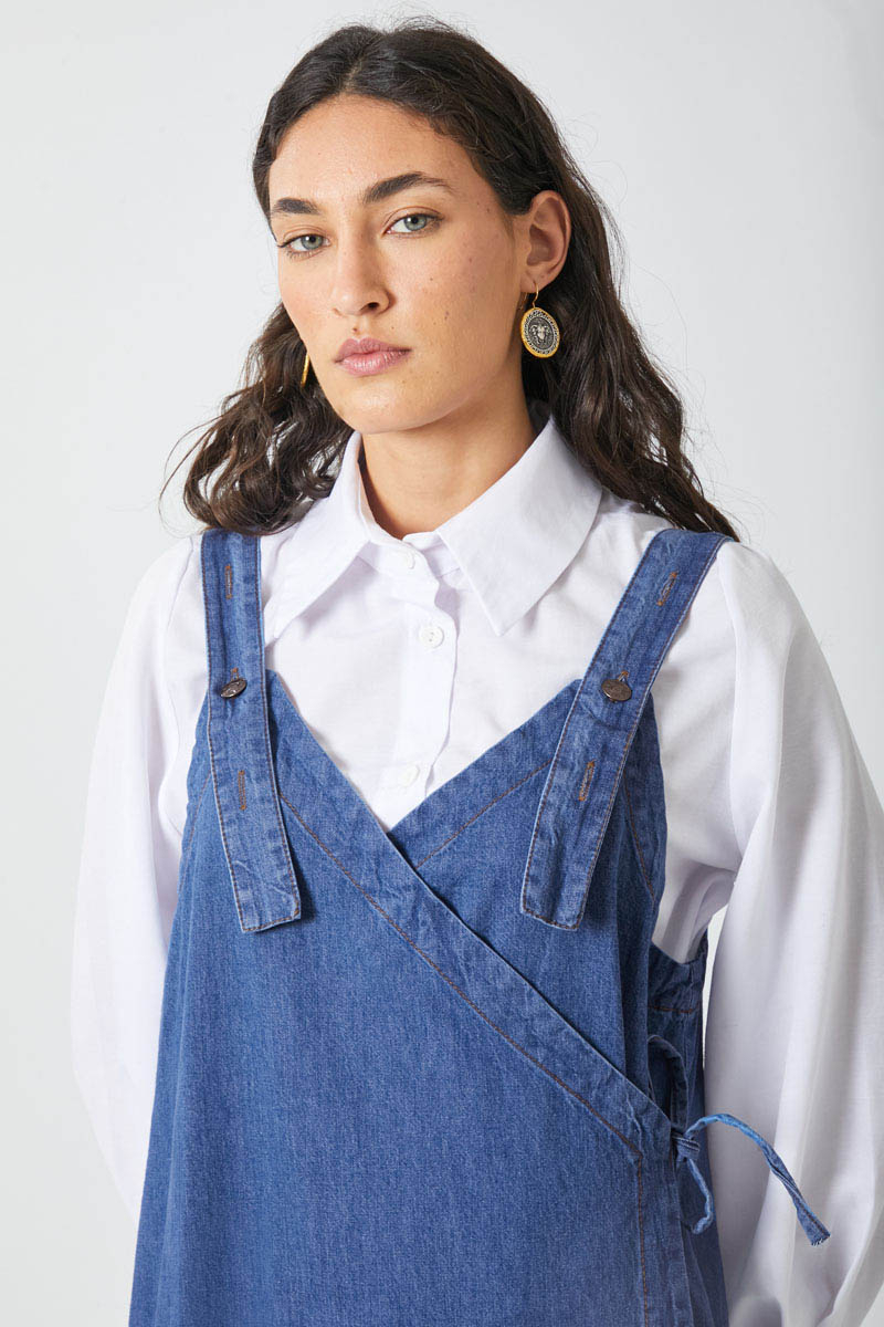 V Yaka Bağlamalı Jile Koyu Mavi. V yakadır, omuz askıları düğme ile ayarlanılabilir olup yandan bağlama detaylıdır, yandan ceplidir,
