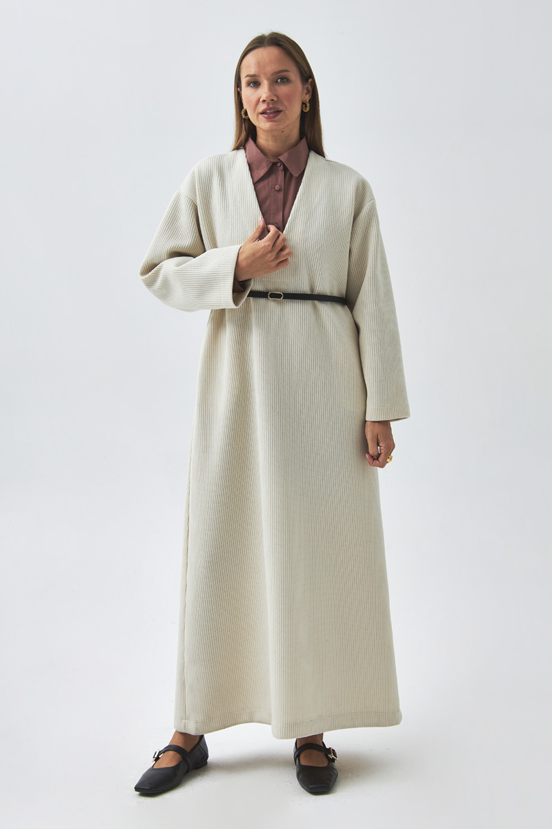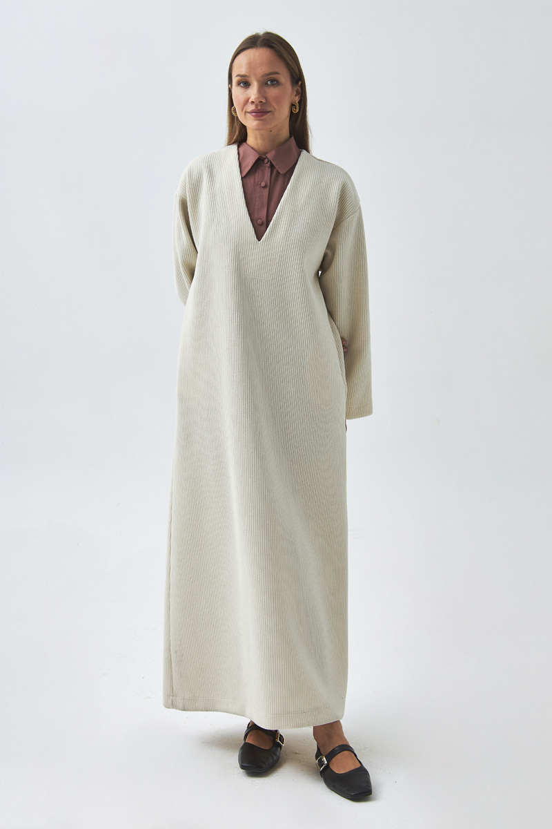 V Yaka Çizgi Dokulu Elbise Ekru, minimalist tasarımı ve rahat kesimiyle modern gardıropların zamansız parçasıdır. Çizgi dokulu kumaşıyla şıklığı doğal bir dokunuşla buluşturan elbise, V yaka formu sayesinde sofistike bir görünüm sunar. Uzun boyu ve salaş kesimiyle gün boyu rahatlık sağlarken, hem günlük kombinlerde hem de özel buluşmalarda tercih edilebilir.