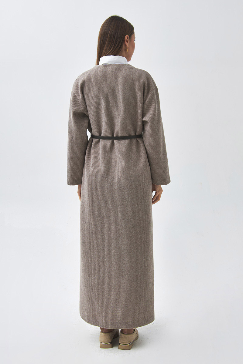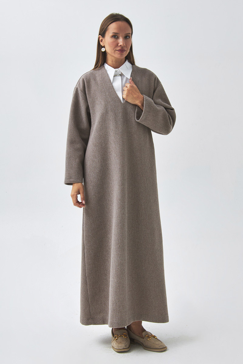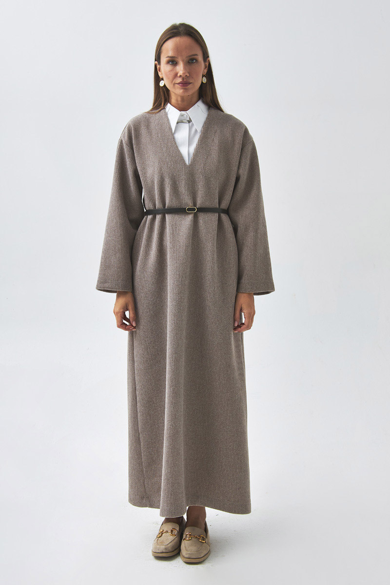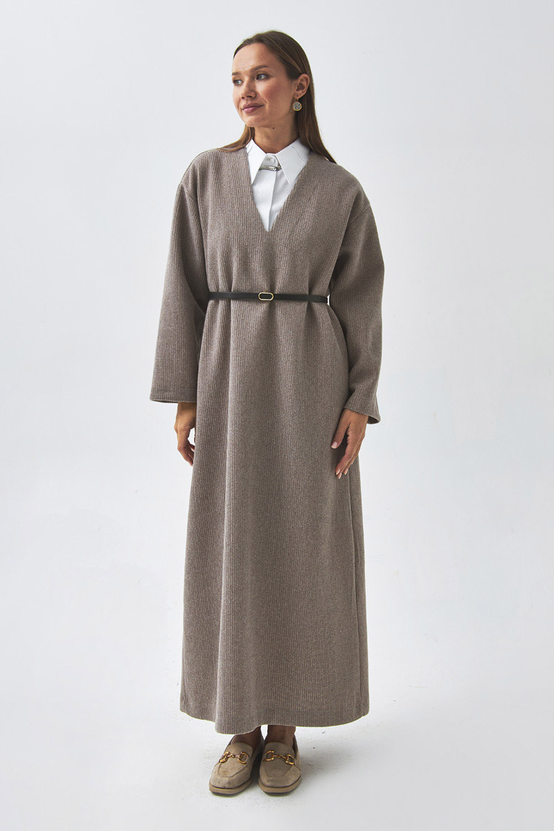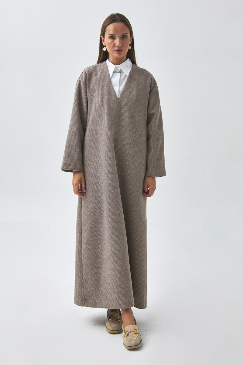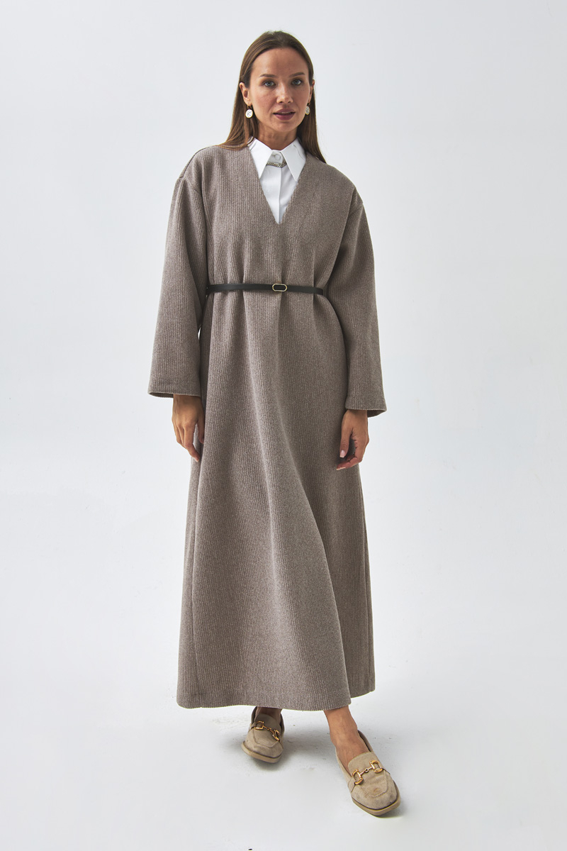 V Yaka Çizgi Dokulu Elbise Vizon