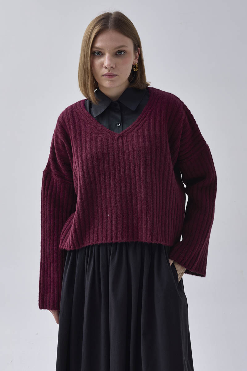 V Yaka Crop Kazak Vişne, modern kesimi ve salaş tarzıyla günlük kombinlere şıklık katar. Kalın şerit dokusu, soğuk günlerde sıcak tutarken v yaka detayı ile rahat ve şık bir kullanım sunar. Kısa boyu sayesinde yüksek bel pantolon ve eteklerle kolayca kombinlenebilir.