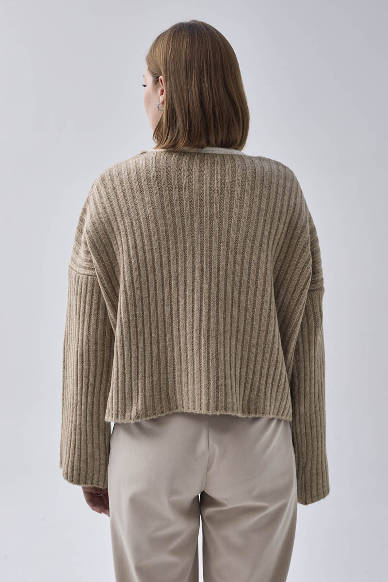 With its modern cut and relaxed style, this crop sweater adds a chic touch to everyday outfits. The thick ribbed texture keeps you warm on cold days, while the V-neck detail offers a comfortable and stylish wear. Thanks to its short length, it pairs perfectly with high-waisted trousers and skirts for an effortlessly balanced look.
