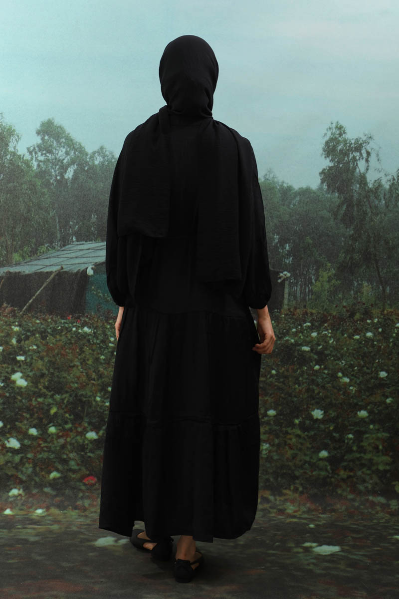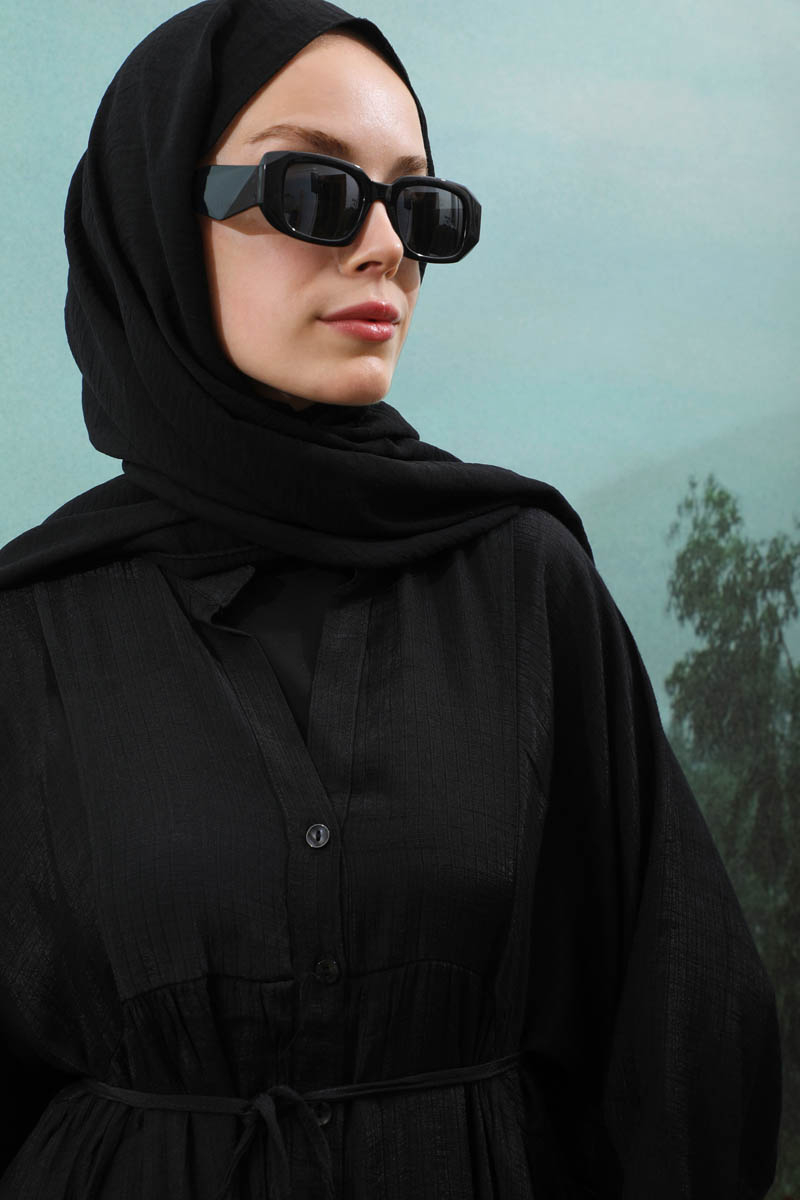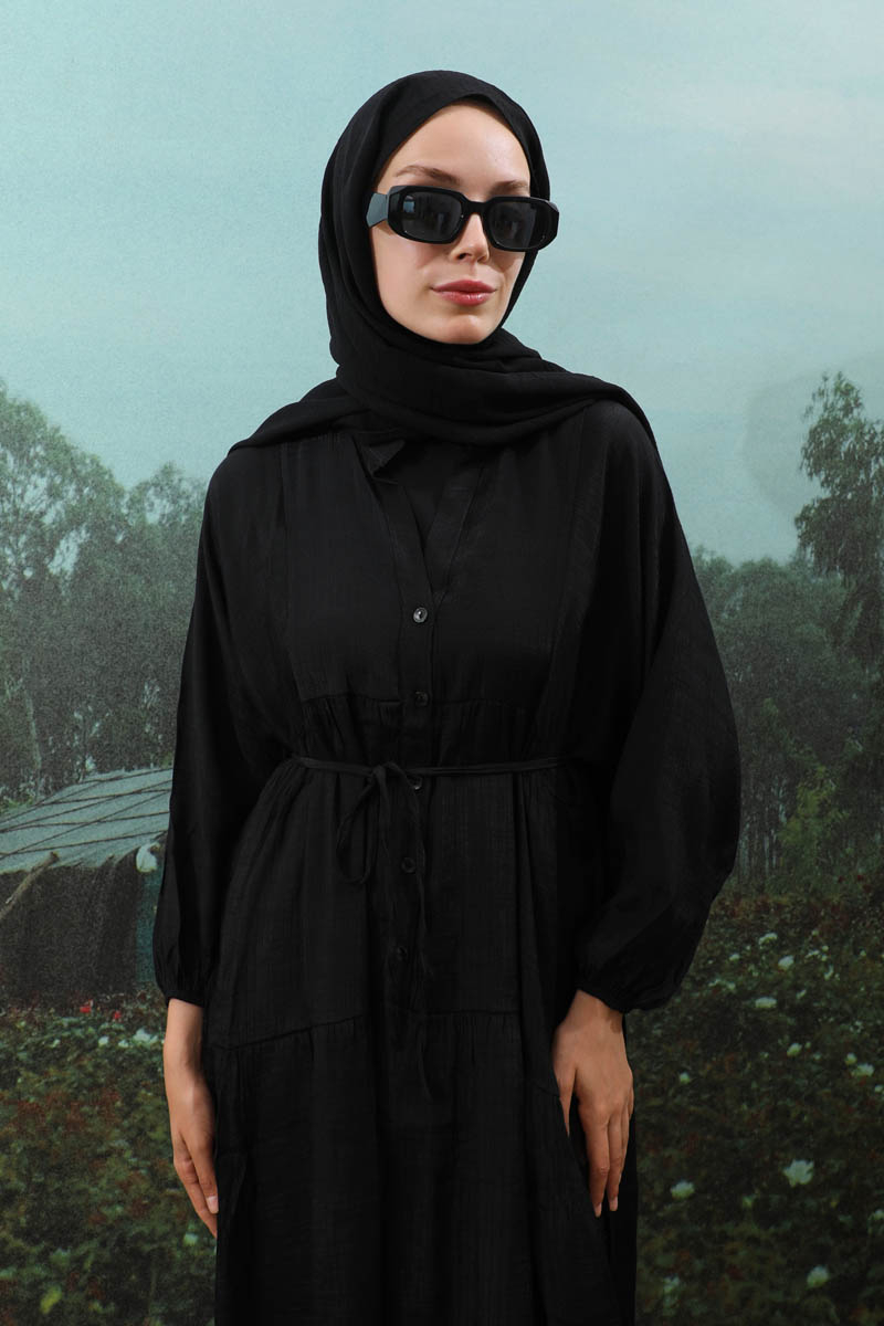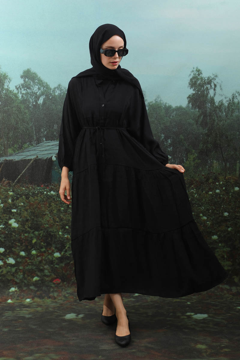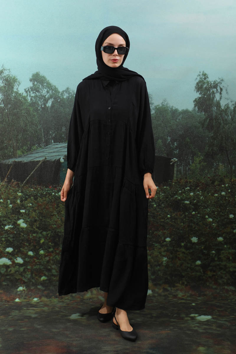 V Yaka Katlı Elbise Siyah. V yakalıdır, Önden düğmelidir, Kat detaylıdır. İnce Biye kuşaklıdır. Yarasa Kolludur. bilekten lastiklidir. Astarsızdır, cepsizdir. İnce yazlık kumaş olduğundan iç gösterebilir. Günlük kullanım ve özel günlerinizde tercih edebilirsiniz.