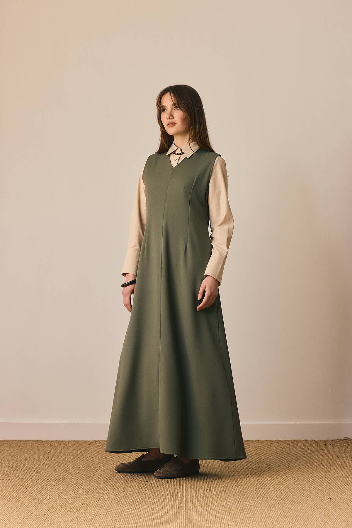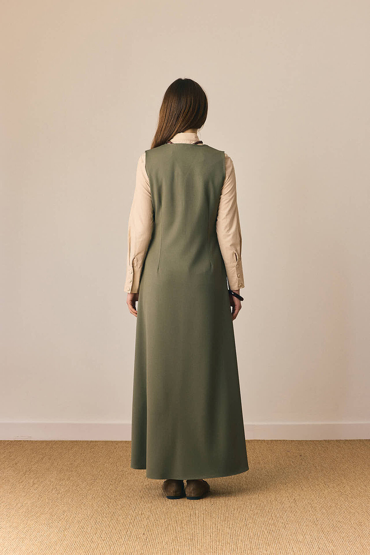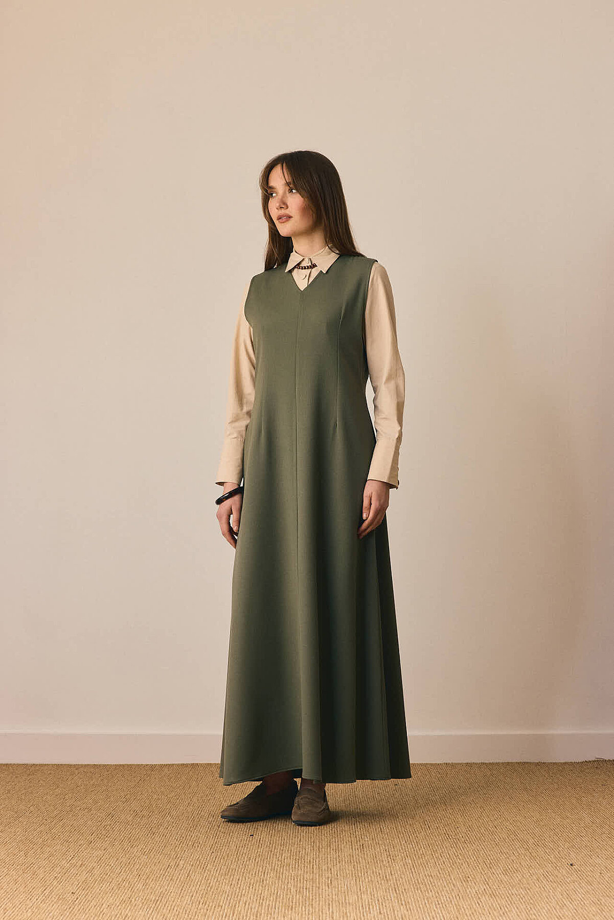 Zamansız çizgisi ve dengeli formuyla öne çıkan V Yaka Klasik Jile, sade şıklığı modern detaylarla buluşturur. V yaka kesimi tasarıma zarif bir çerçeve kazandırırken, pens detayları silueti dengeler. Önden parçalı yapısı modele hareket katarken, rahat dökümlü maksi boy formu gün boyu konfor sunar. Günlük kombinlerden daha şık görünümlere kadar geniş bir kullanım alanına sahiptir.