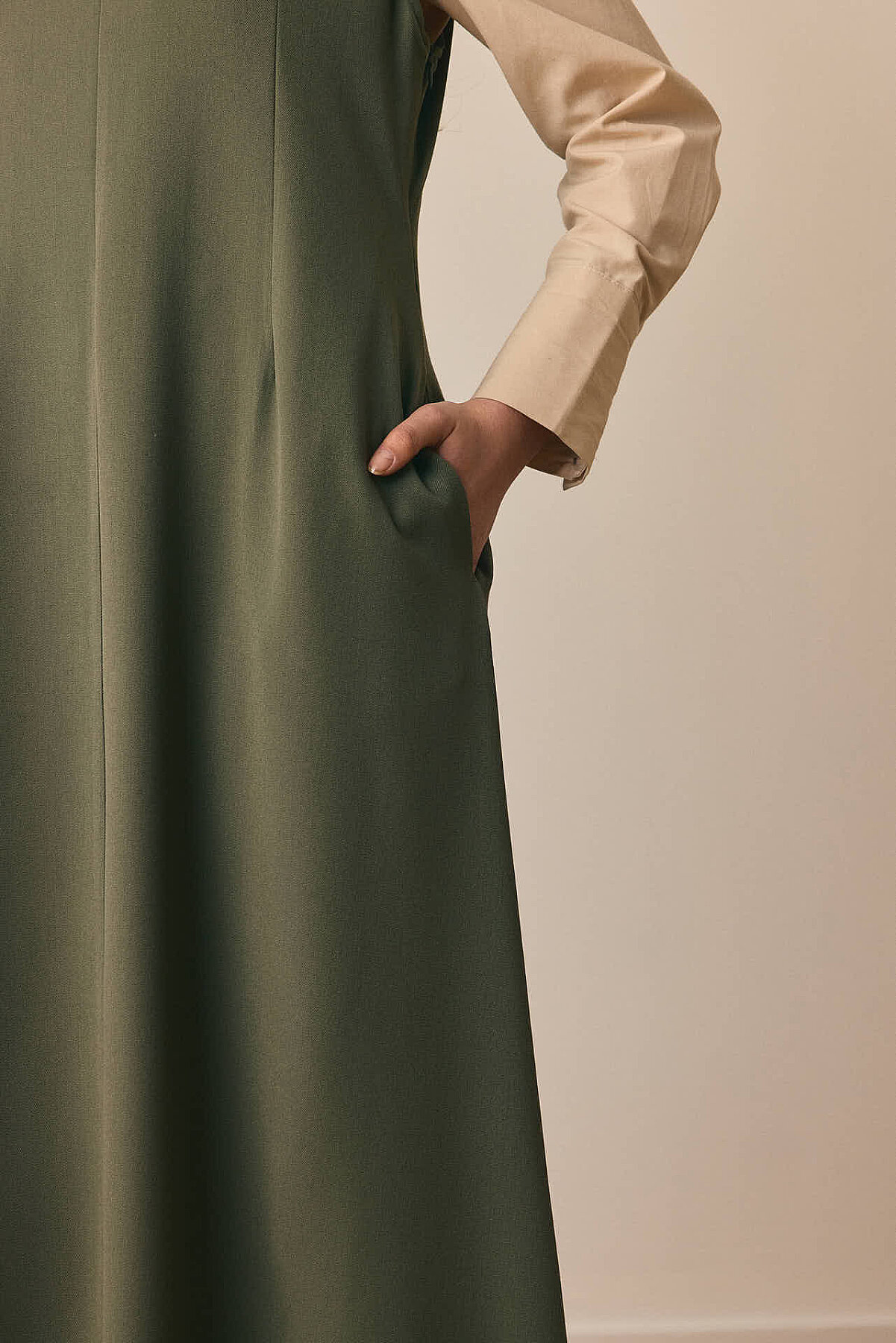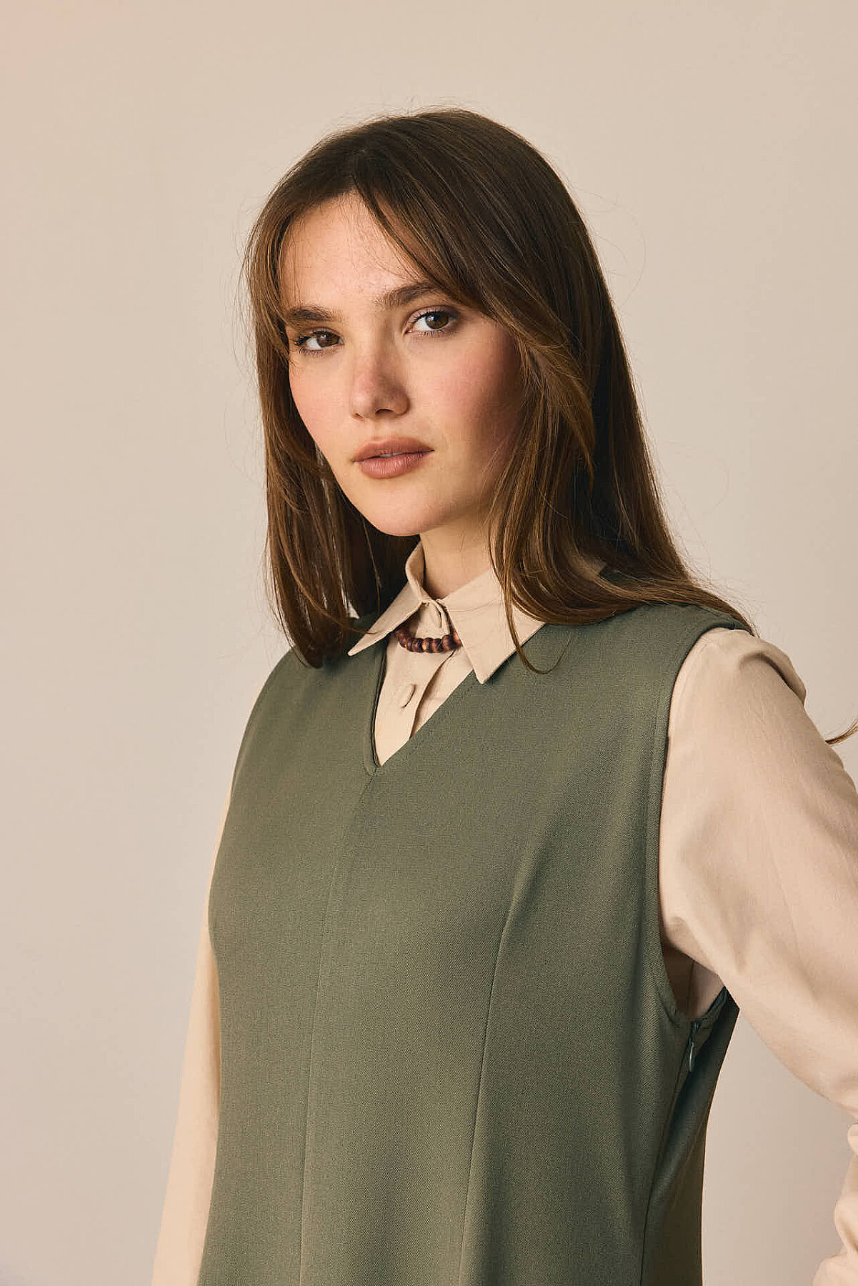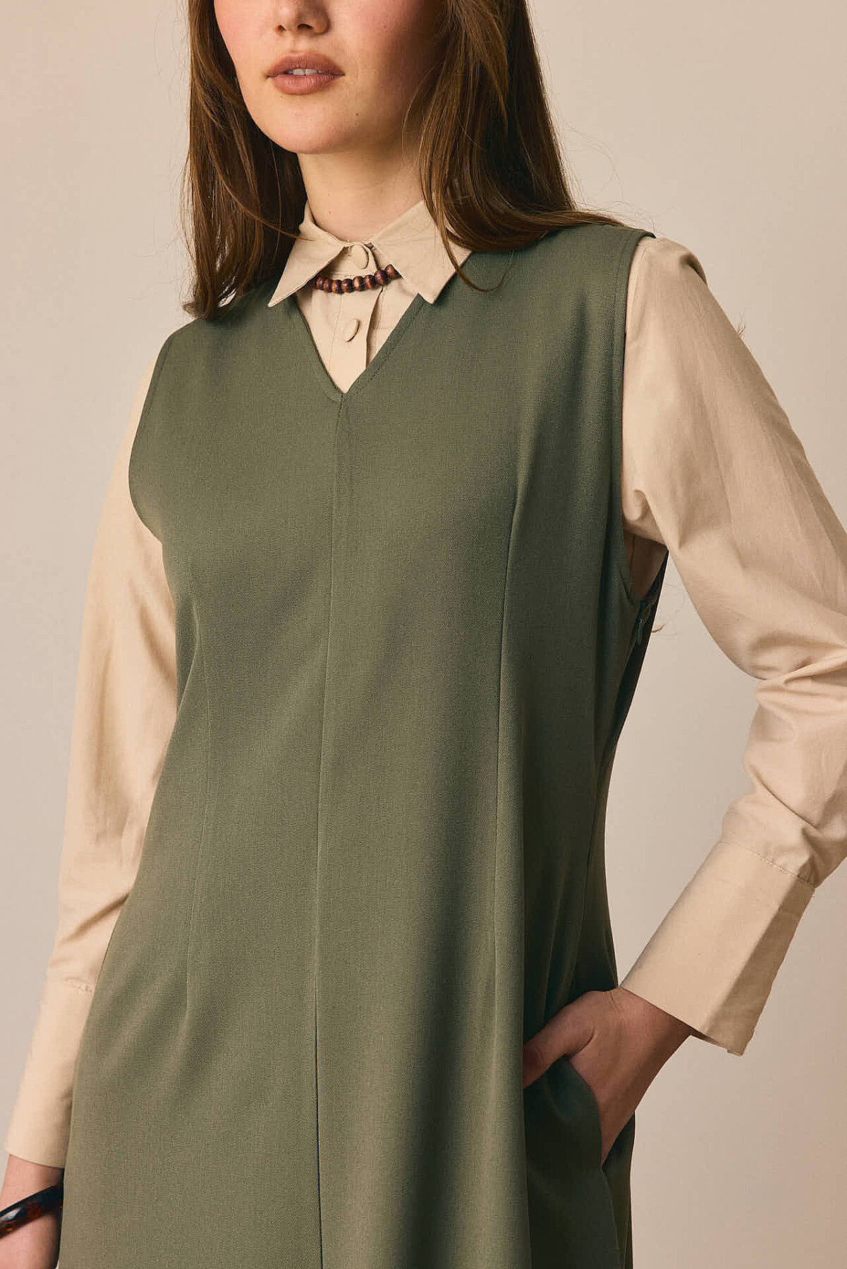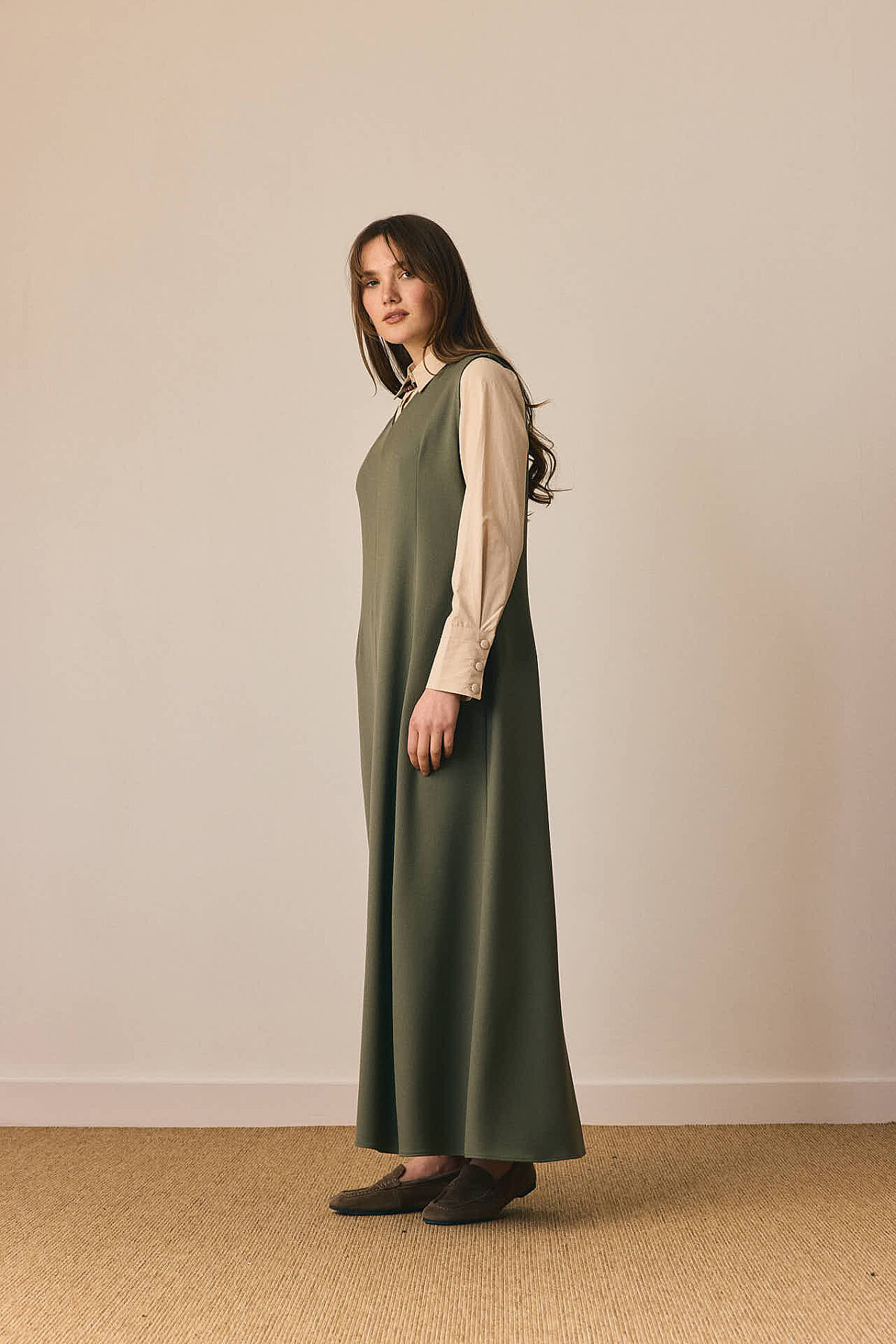 Zamansız çizgisi ve dengeli formuyla öne çıkan V Yaka Klasik Jile, sade şıklığı modern detaylarla buluşturur. V yaka kesimi tasarıma zarif bir çerçeve kazandırırken, pens detayları silueti dengeler. Önden parçalı yapısı modele hareket katarken, rahat dökümlü maksi boy formu gün boyu konfor sunar. Günlük kombinlerden daha şık görünümlere kadar geniş bir kullanım alanına sahiptir.