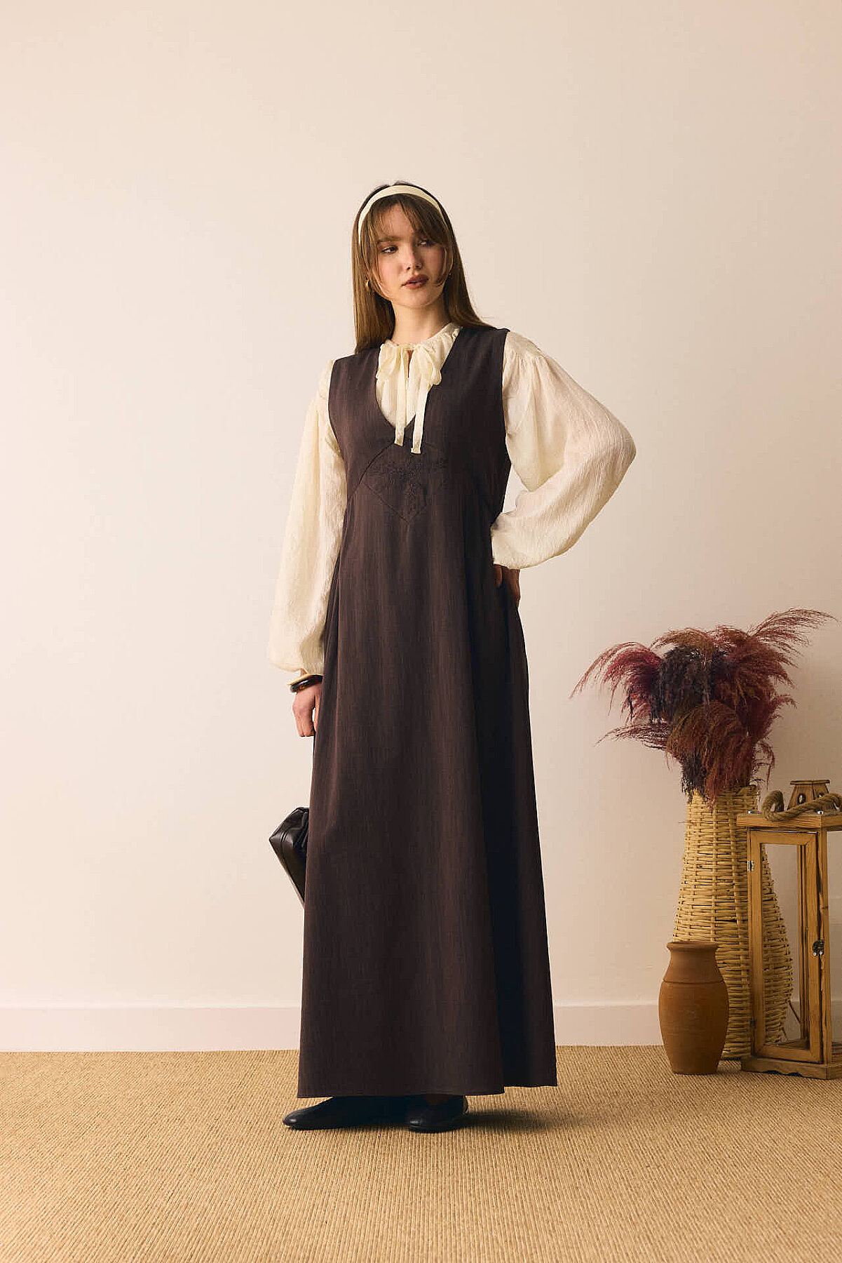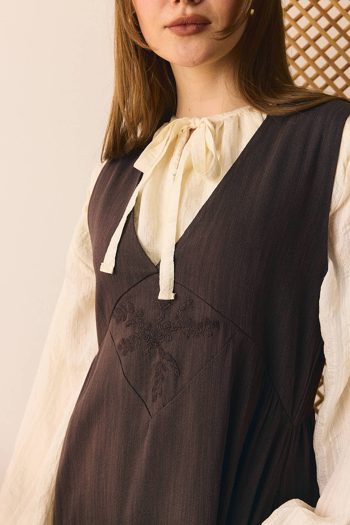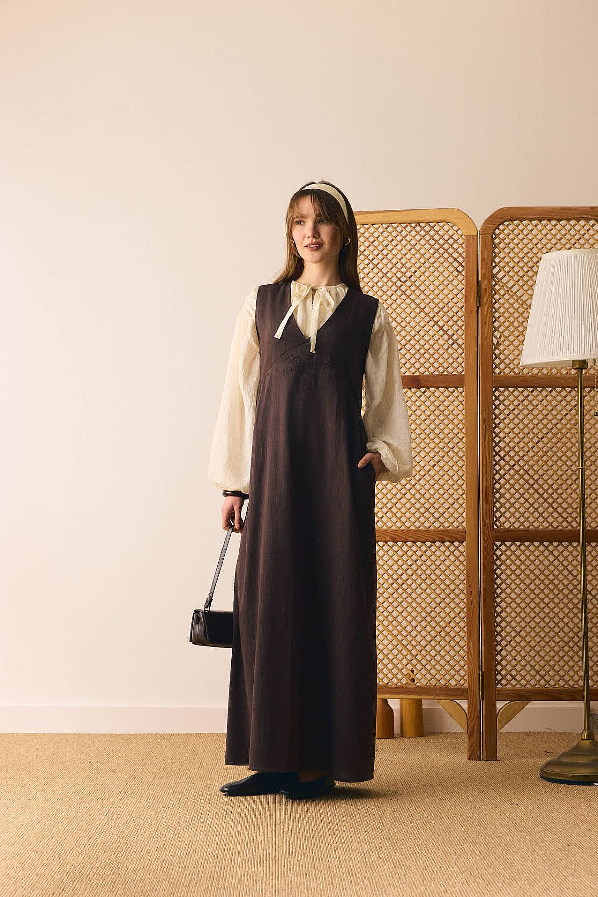 Zarif nakış detayları ve doğal dokusuyla öne çıkan V Yaka Nakışlı Jile, sade şıklığı dengeli bir siluetle buluşturur. V yaka formu tasarıma zarif bir çerçeve kazandırırken, ön kısımdaki nakış detayları modele karakterli bir dokunuş katar. Pamuklu yapısı sayesinde nefes alabilen bir kullanım sunar; rahat dökümlü maksi boy formu ile gün boyu konfor sağlar. Günlük kombinlerden daha özenli görünümlere kadar geniş bir kullanım alanına sahiptir.