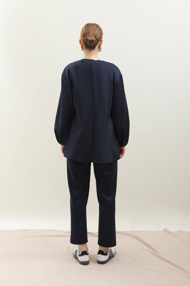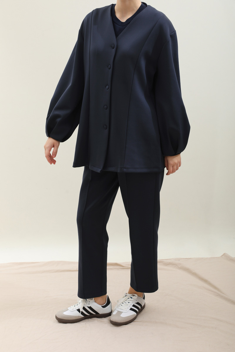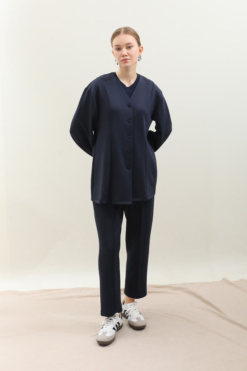 V Yaka Önden Düğmeli Takım Lacivert. V yaka olup önden düğmelidir. Kup detaylıdır. bilekten pilelidir. Pantolon belden lastiklidir, cepsizdir, önden dikiş detaylıdır. Havuç paçadır. Günlük kullanım ve özel günlerinizde tercih edebilirsiniz.