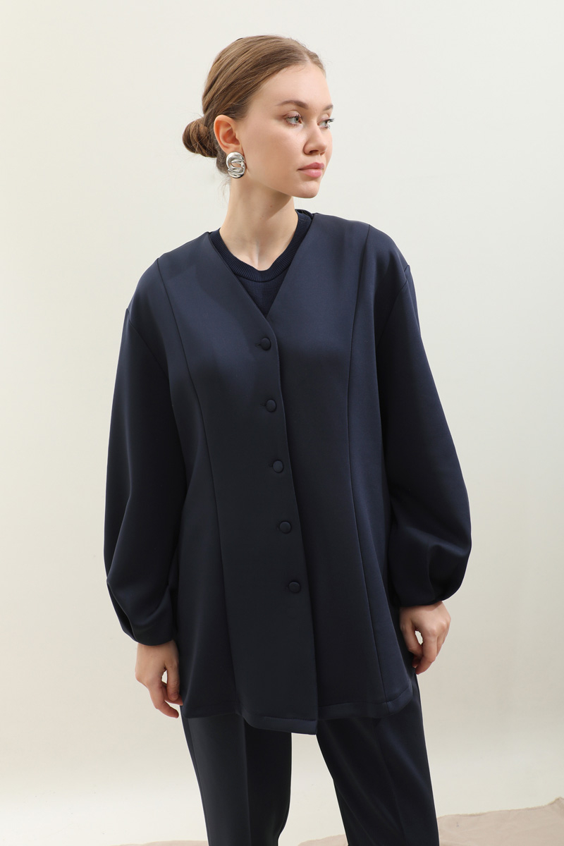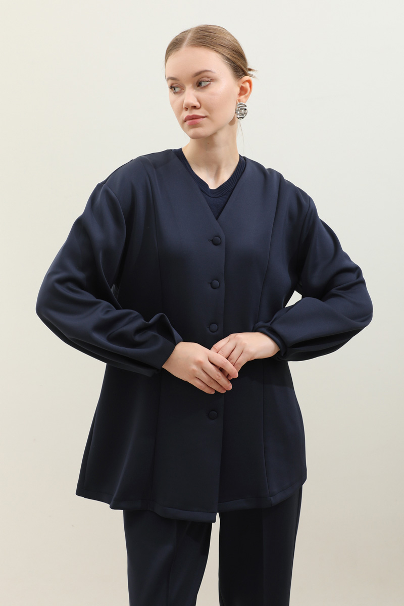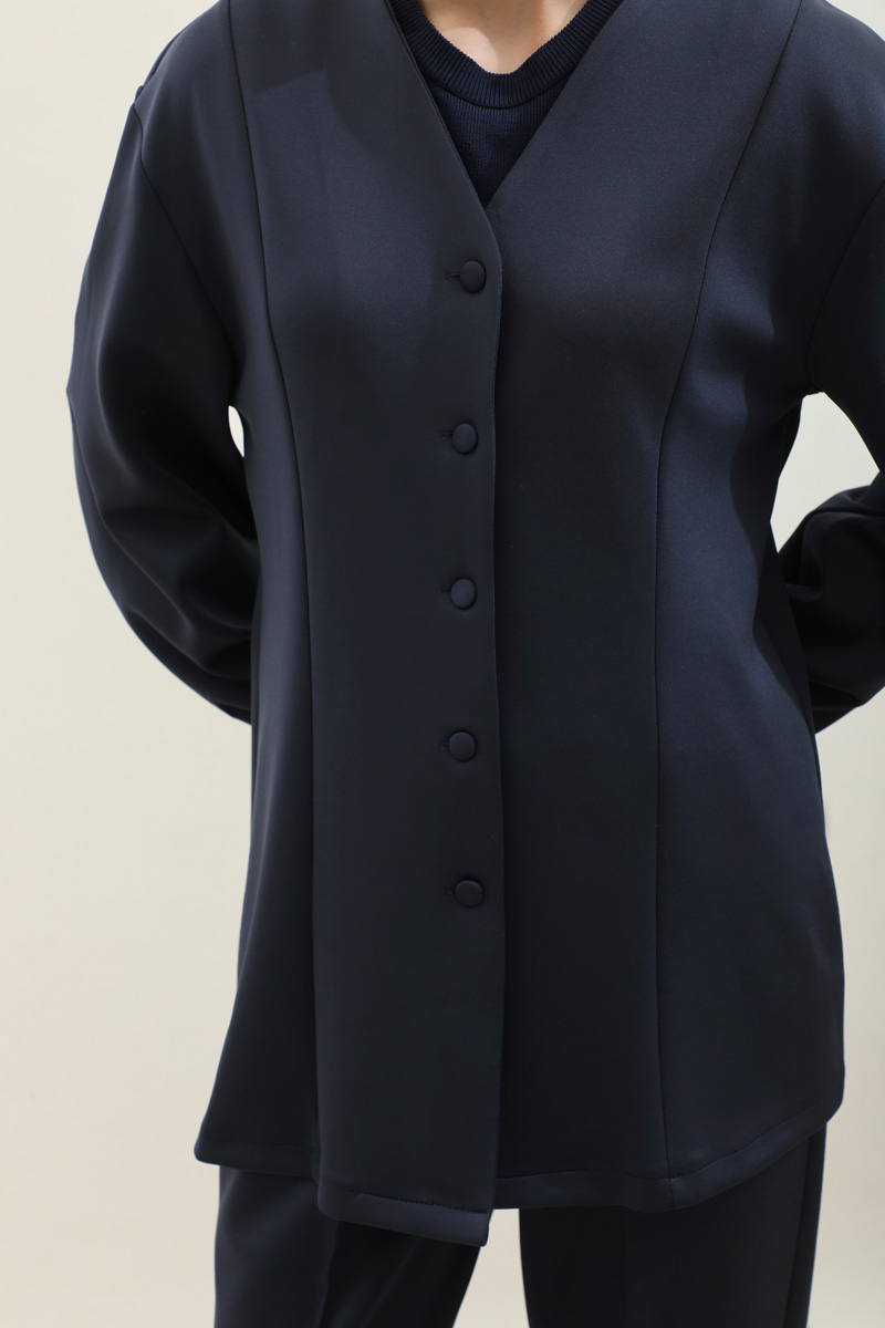 V Yaka Önden Düğmeli Takım Lacivert